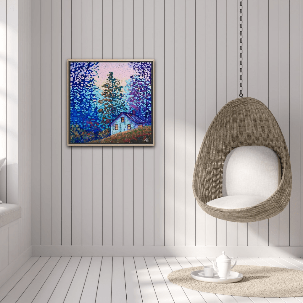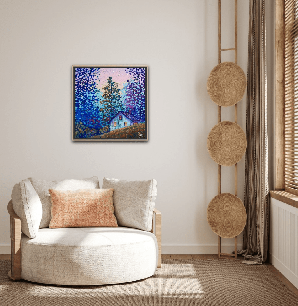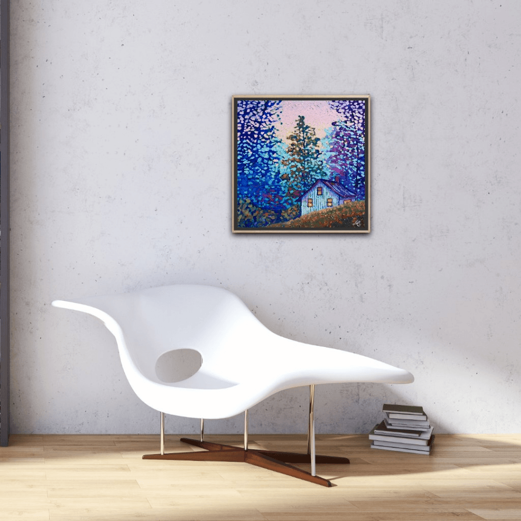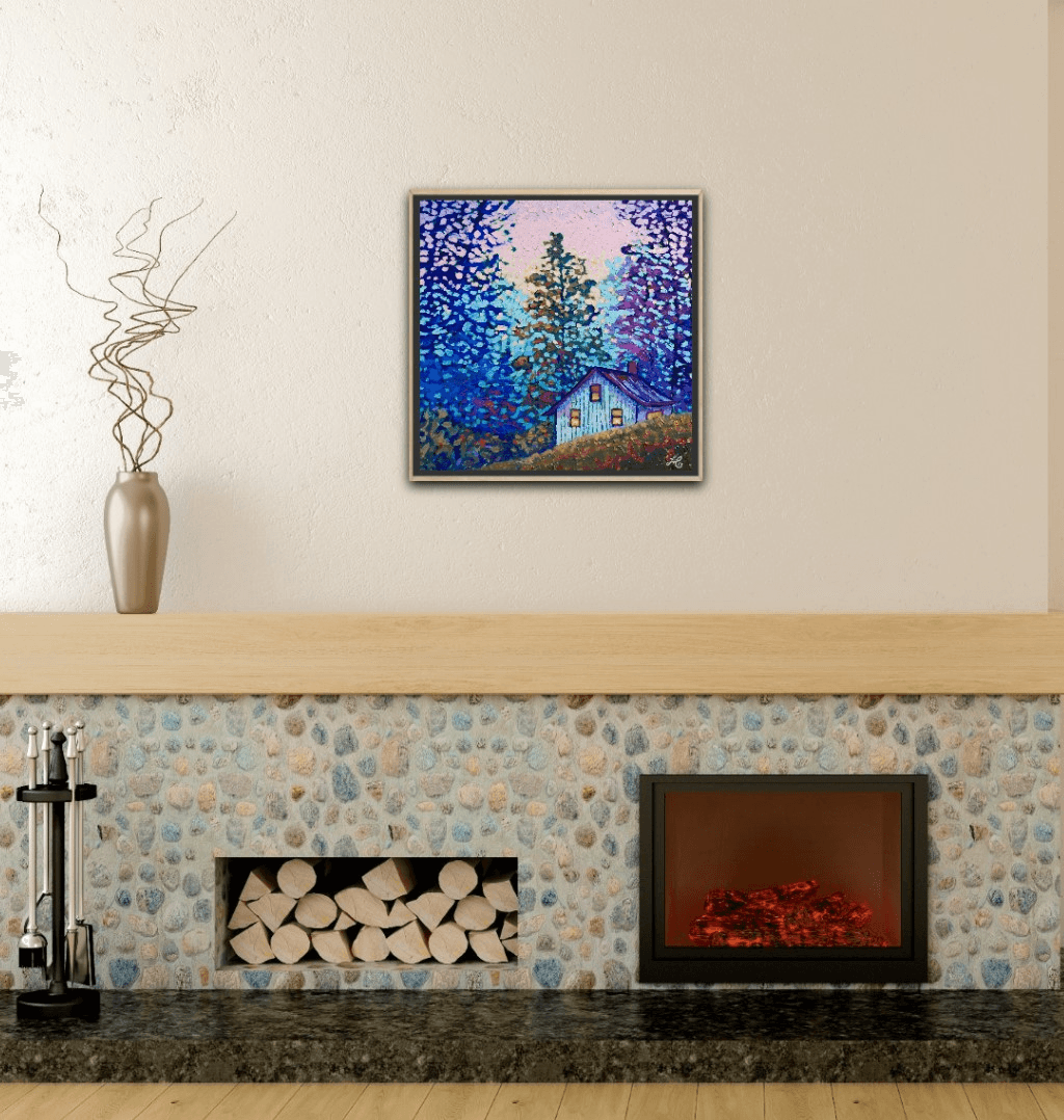 I chose "Among Friends" as a title for this piece because the light in the cabin suggests a cozy evening in good company, drinking wine, enjoying a delicious, home-made meal, chatting to the sound of beautiful music and lovely melodies while the cabin itself sits among the safety and warmth of the trees, their branches extending in protection and creating a secure place where all is harmoniously alive and where the loud city sounds cannot reach...