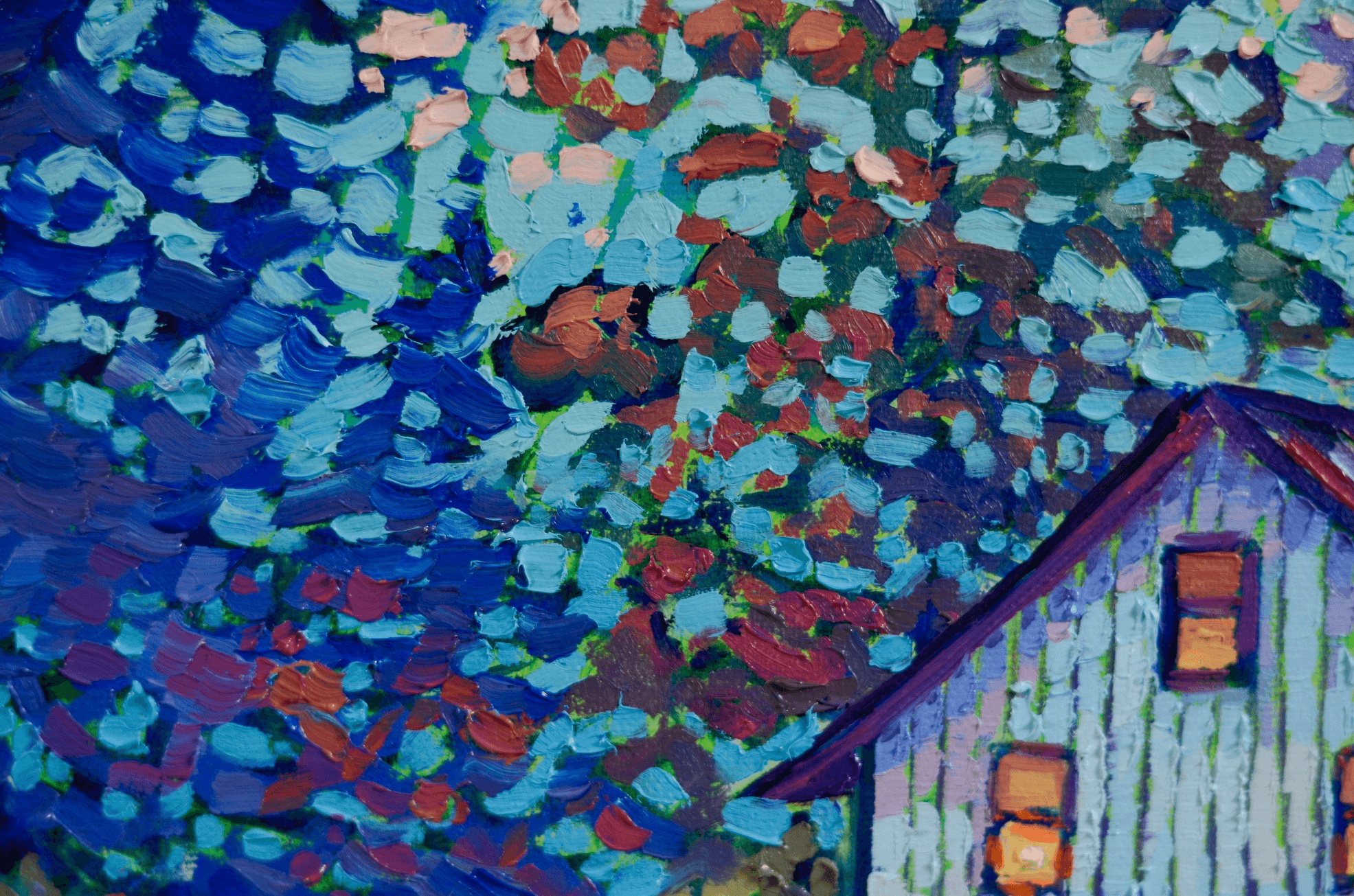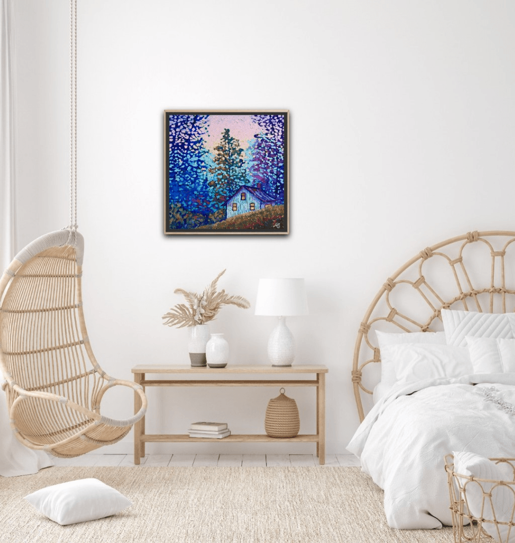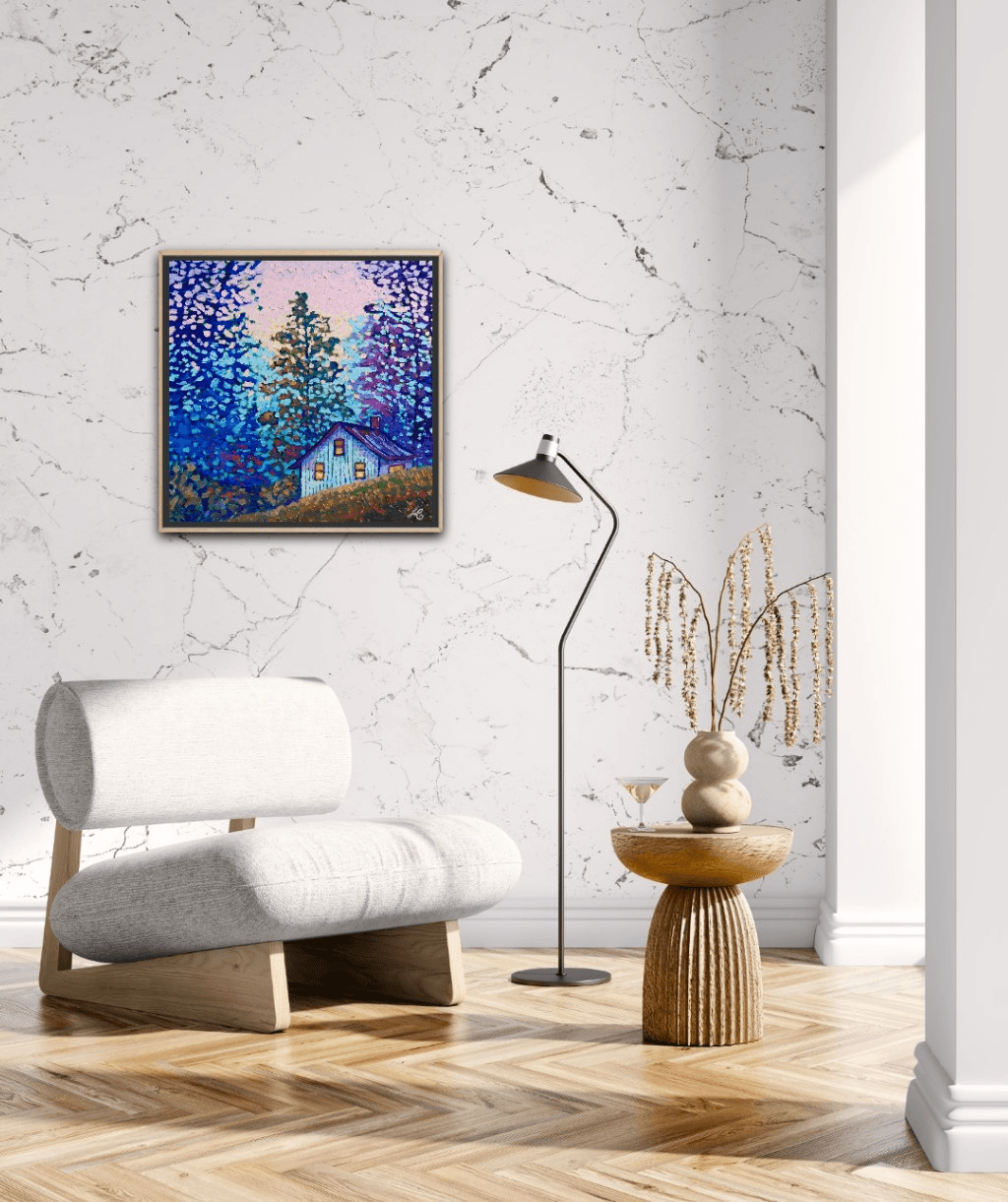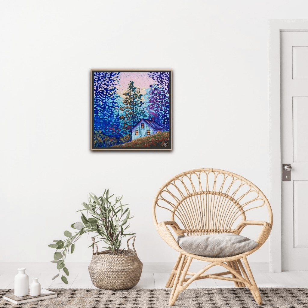 I chose "Among Friends" as a title for this piece because the light in the cabin suggests a cozy evening in good company, drinking wine, enjoying a delicious, home-made meal, chatting to the sound of beautiful music and lovely melodies while the cabin itself sits among the safety and warmth of the trees, their branches extending in protection and creating a secure place where all is harmoniously alive and where the loud city sounds cannot reach...