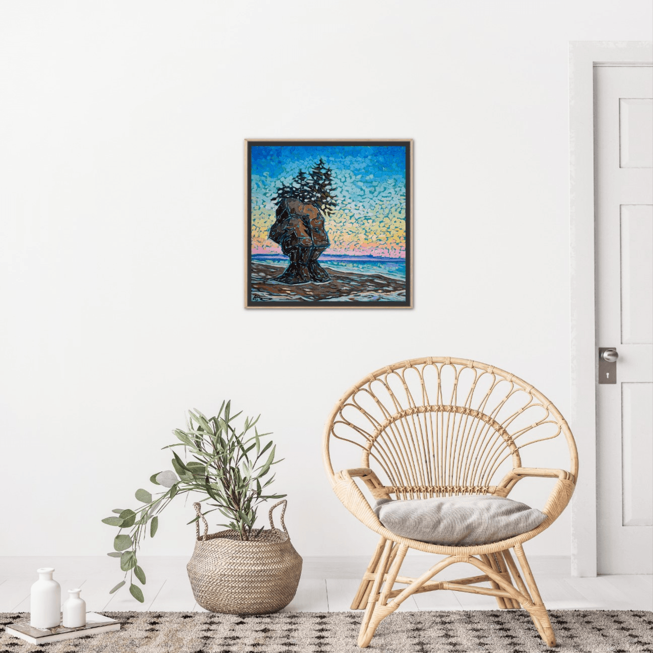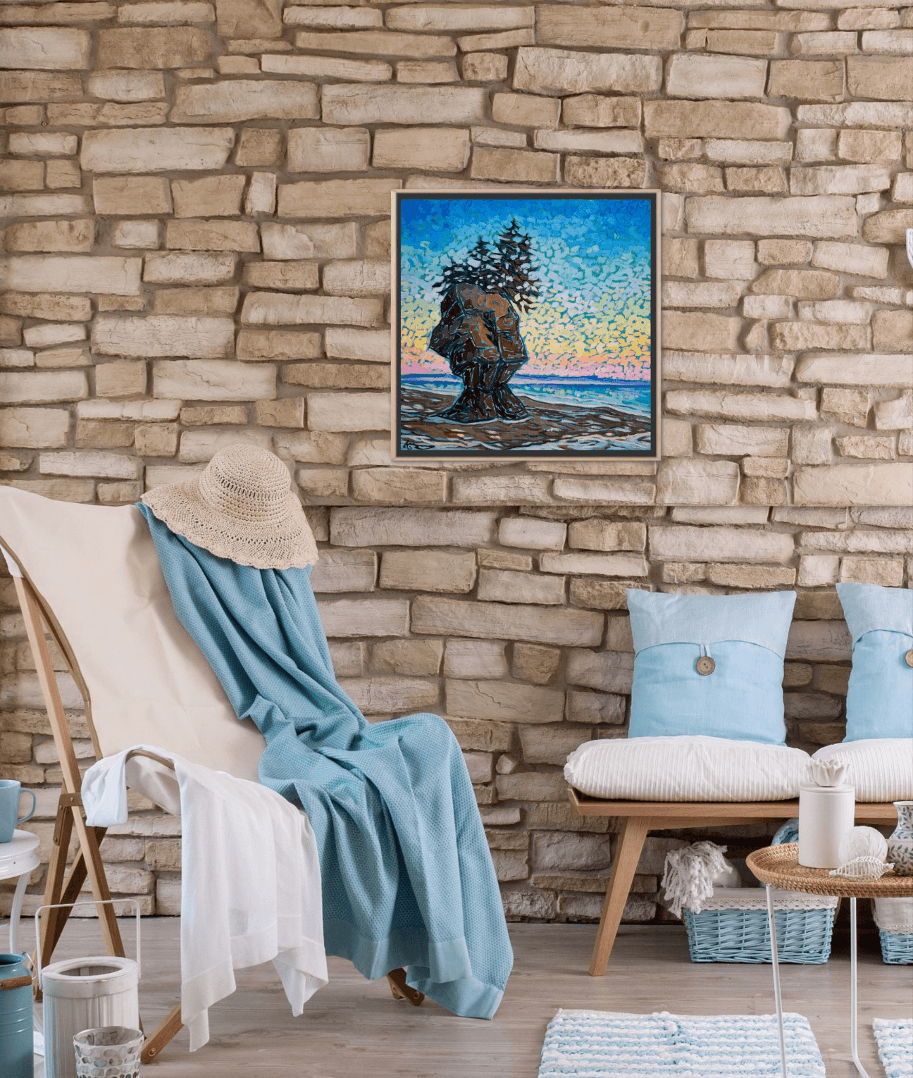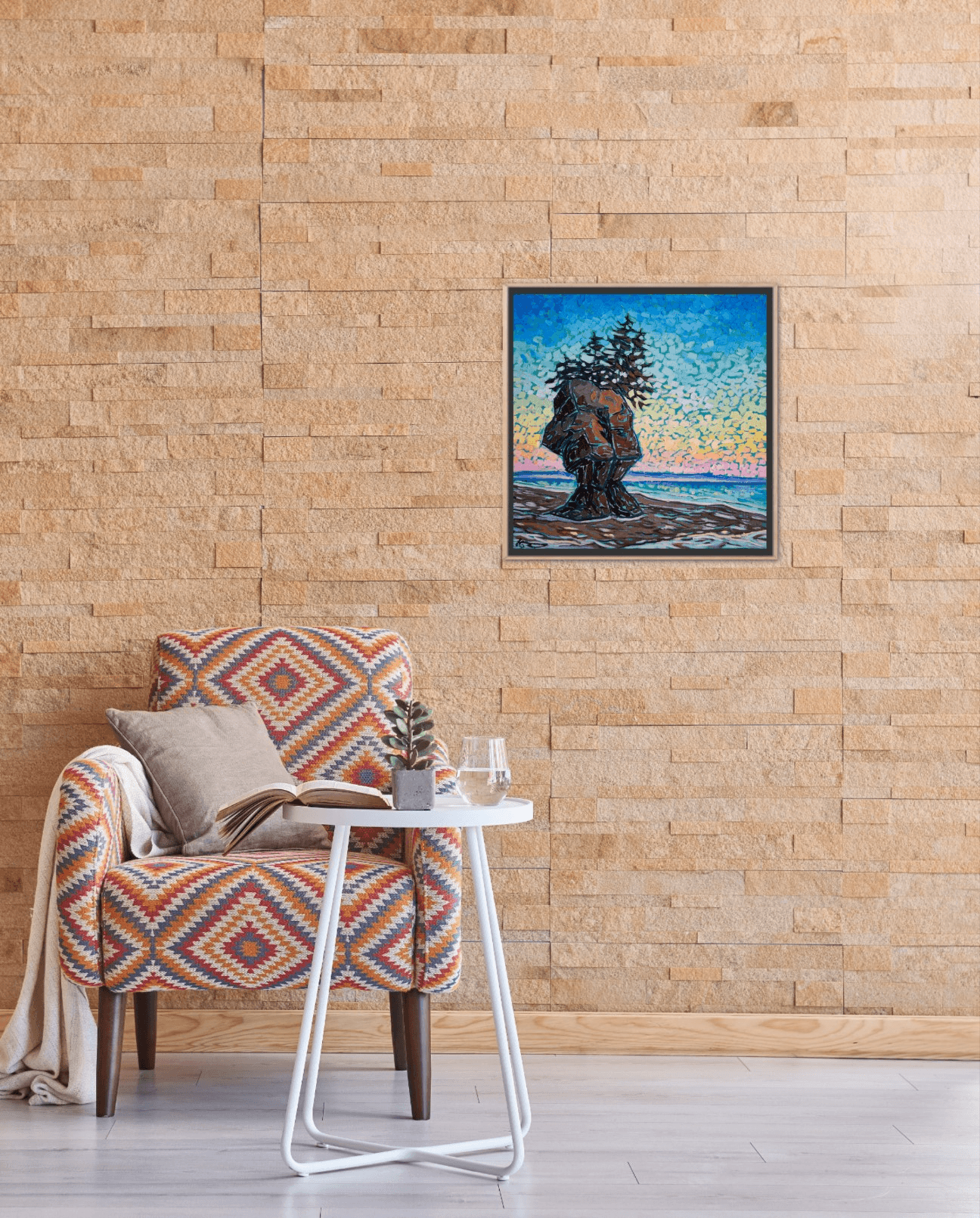 I am under the spell of Hopewell Rocks. If I had to choose only one subject to paint it would definitely be these glorious rocks. "Anchor of Recollection" is an atmospheric depiction of that beautiful shore on the Bay of Fundy. The soft low light suggests a time after the sun has already set, with its last glimmer peaking one last time through the horizon before the blue velvet night drapes the land under its glimmer of diamond stars.