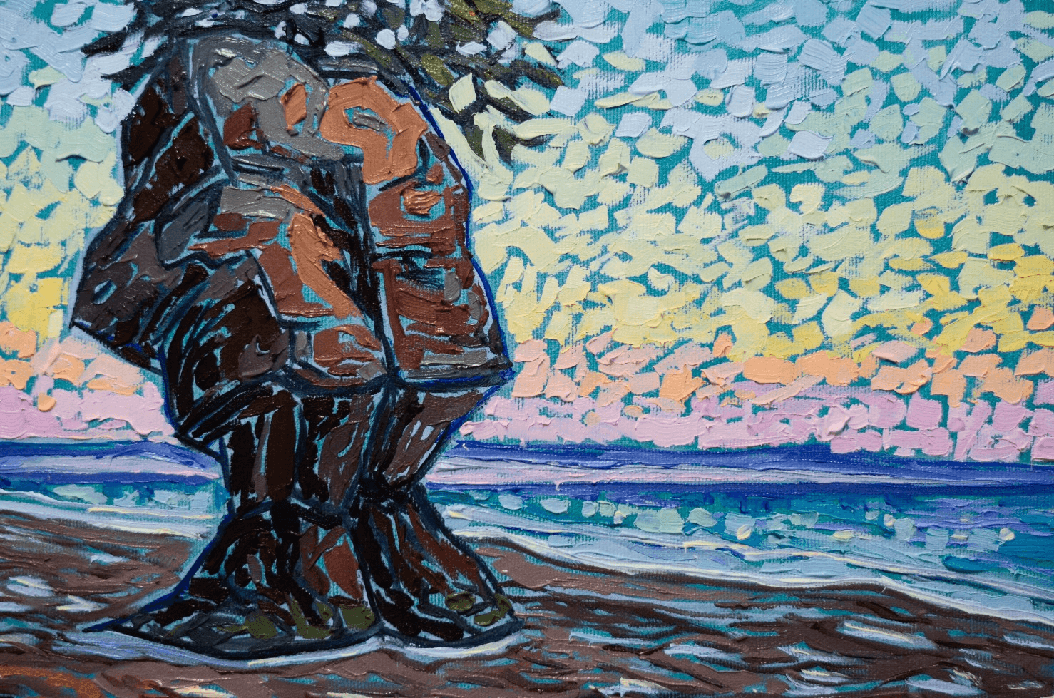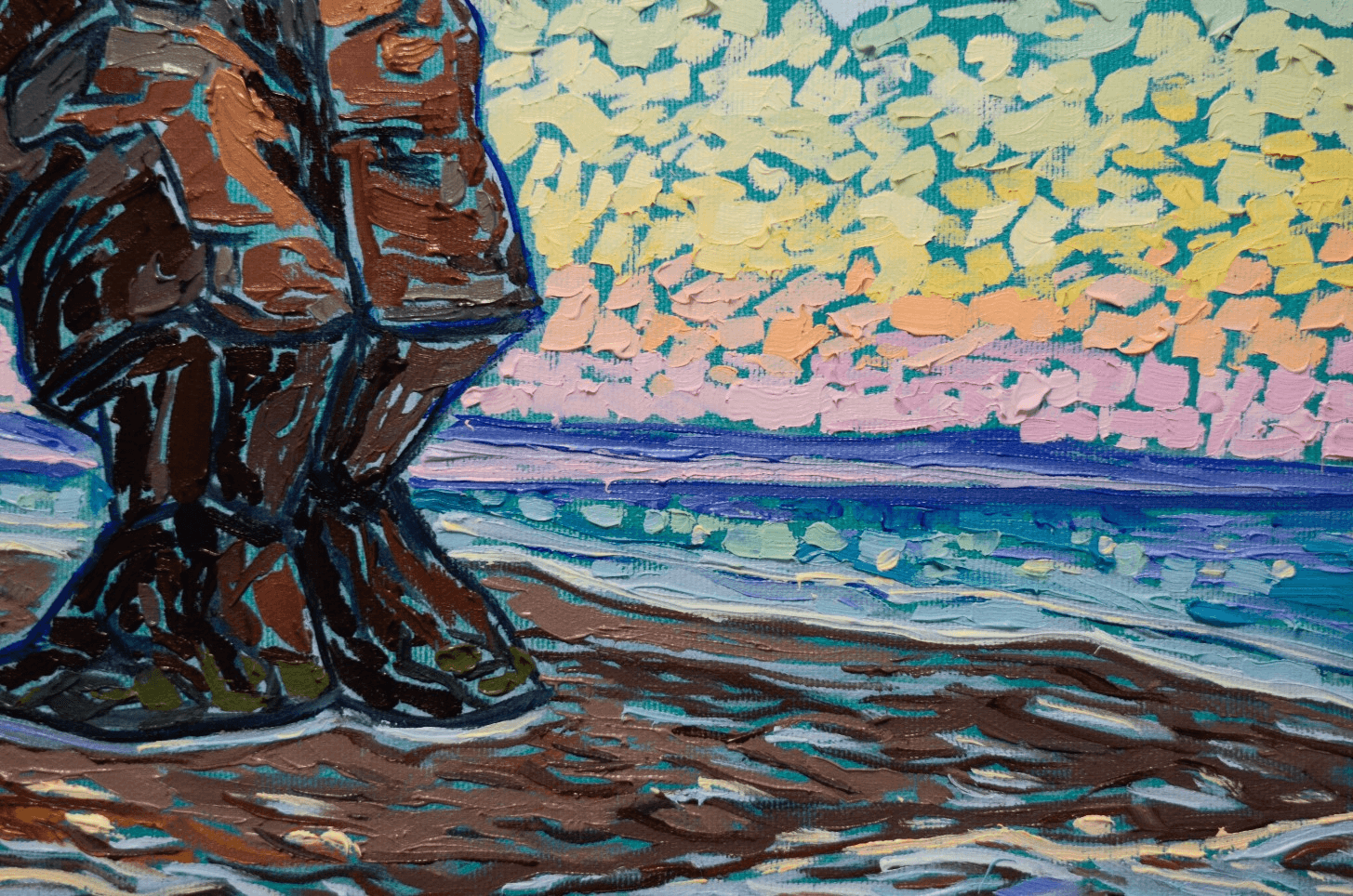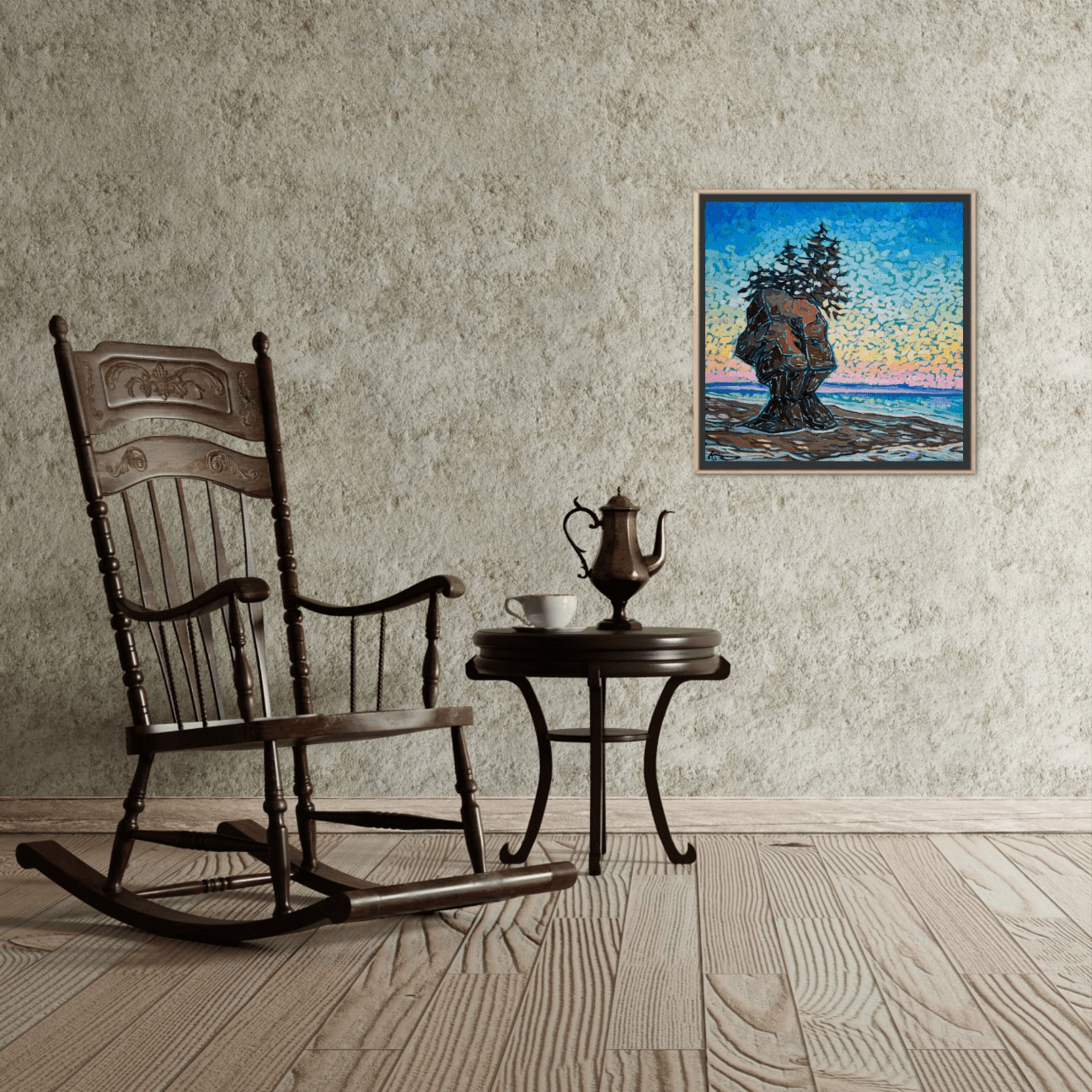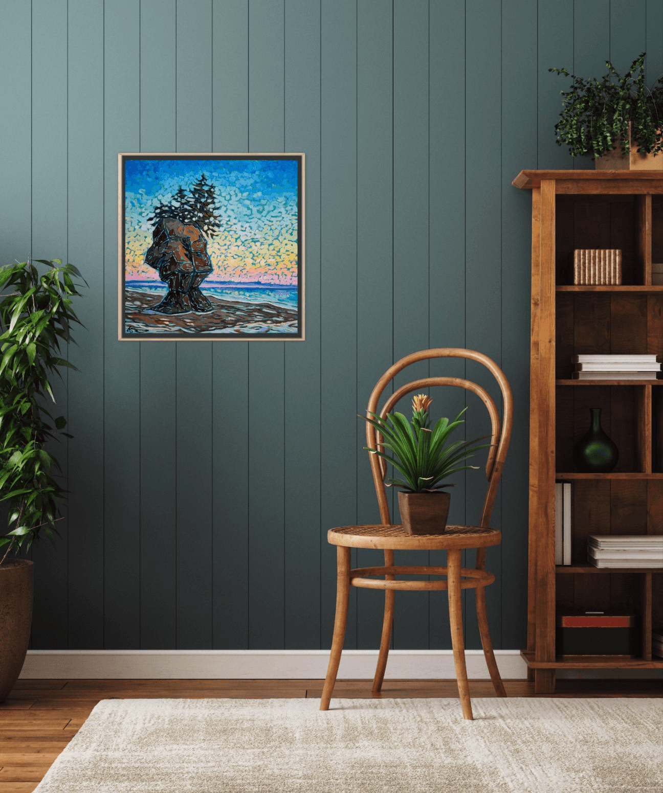 I am under the spell of Hopewell Rocks. If I had to choose only one subject to paint it would definitely be these glorious rocks. "Anchor of Recollection" is an atmospheric depiction of that beautiful shore on the Bay of Fundy. The soft low light suggests a time after the sun has already set, with its last glimmer peaking one last time through the horizon before the blue velvet night drapes the land under its glimmer of diamond stars.