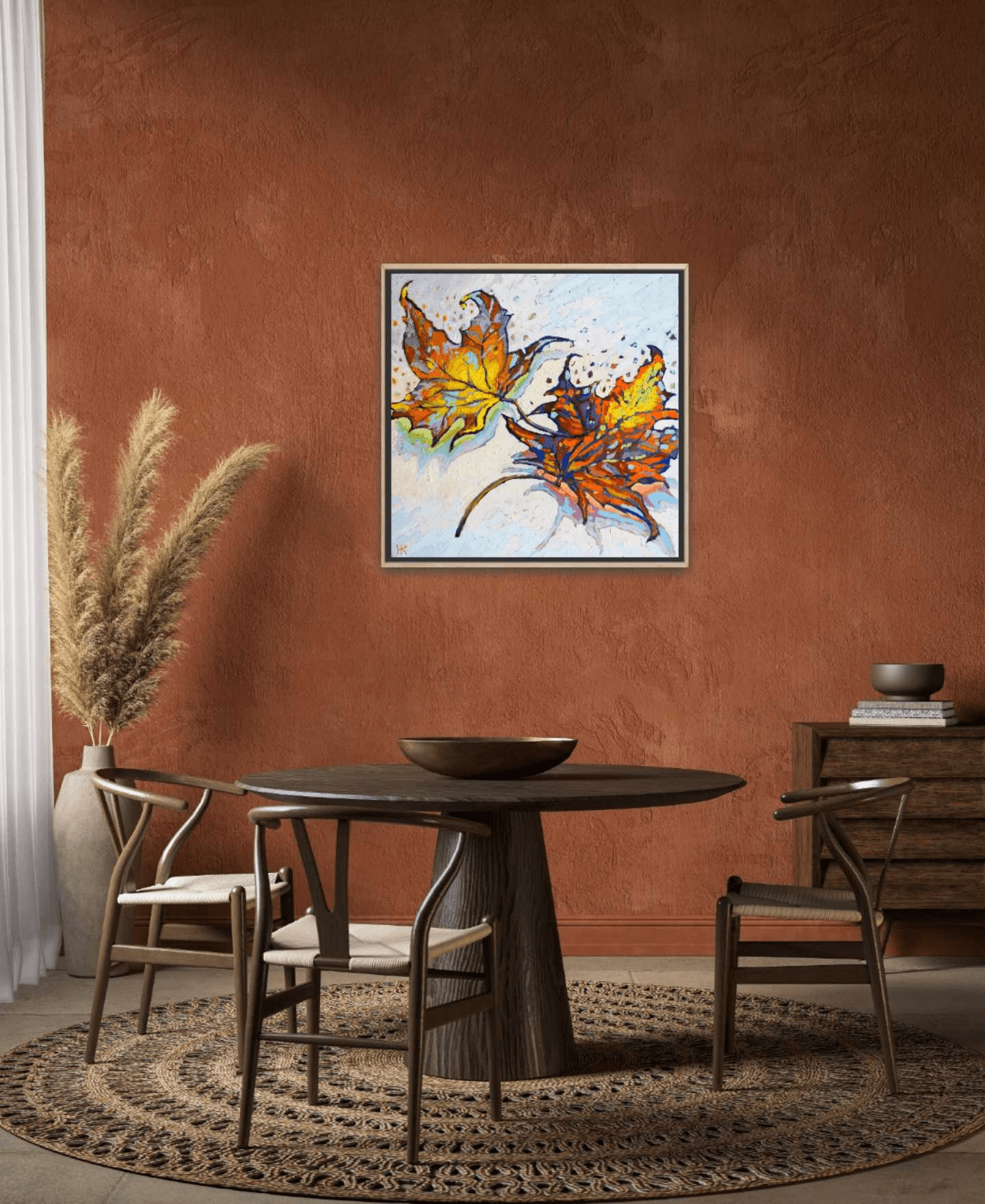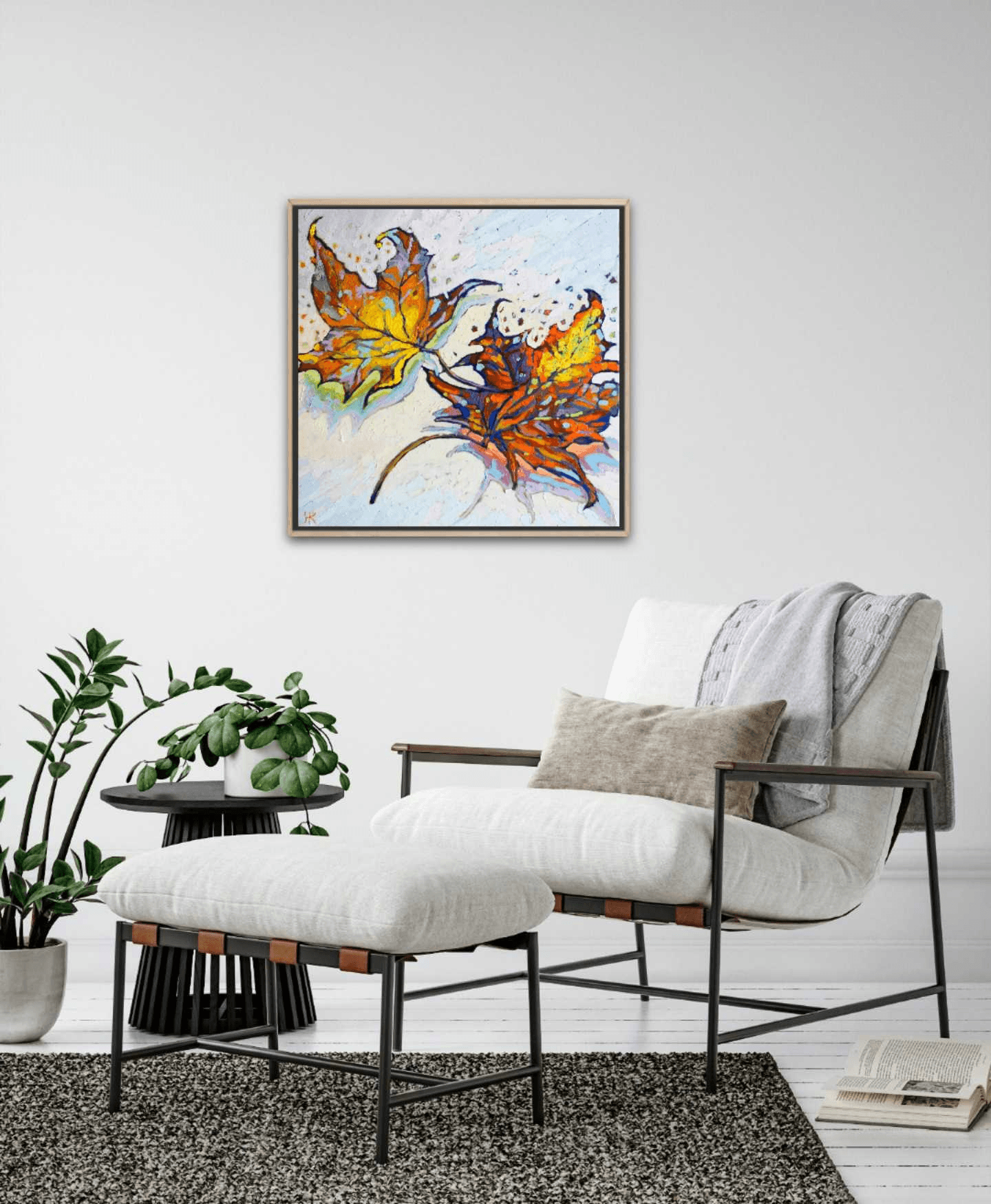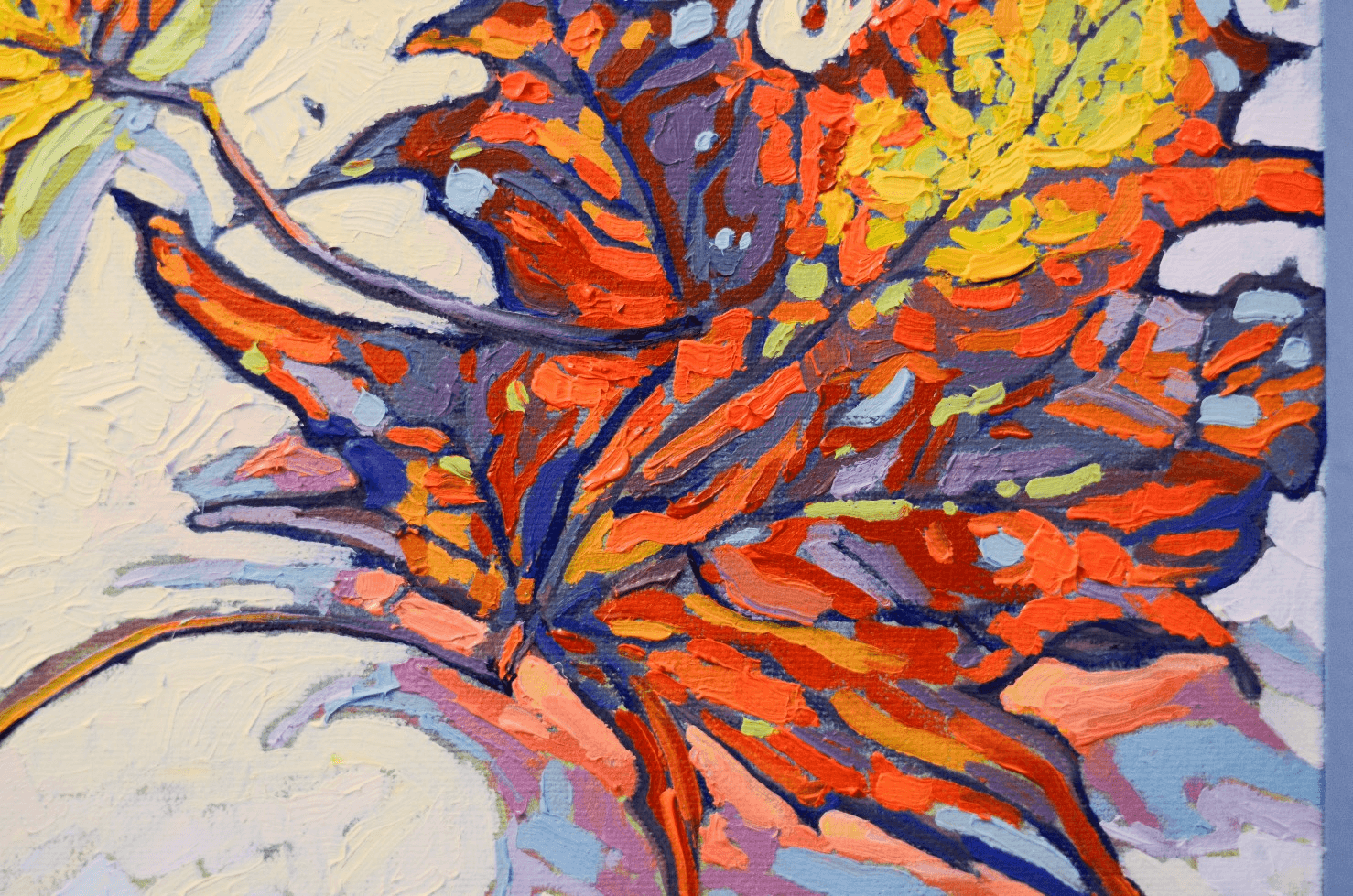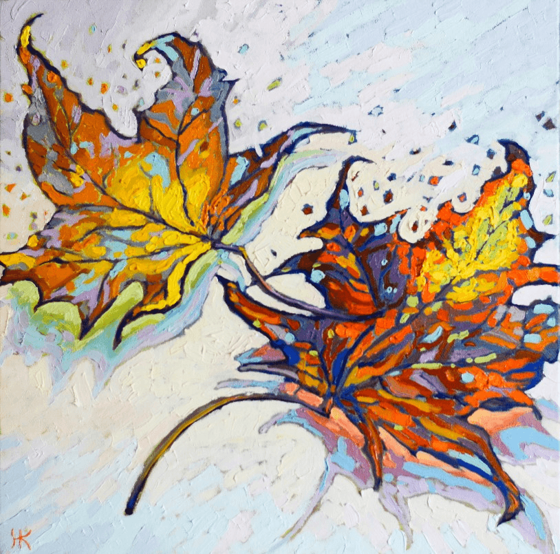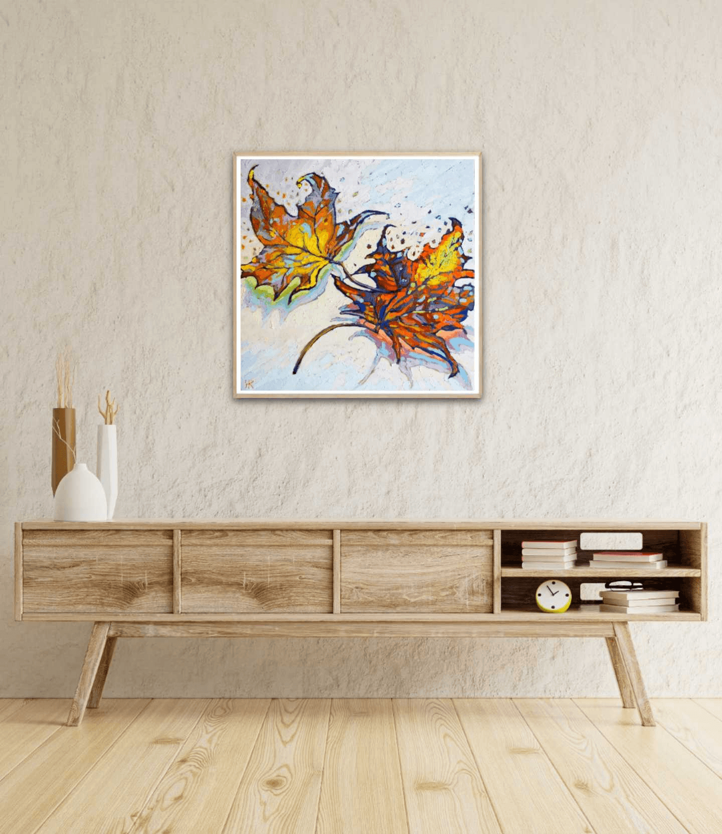 Fall-inspired paintings are a favorite of mine. Maple trees don the most vivid golden and ruby colors one can think of. These hues are displayed in this painting in the most simple of ways. Two maple leaves lying against each other with a simple, light, yet colorful background to enhance their intense and lovely shades of red, yellow and green. The brushstrokes are mounted with thick paint to add a lovely, textured effect. If you run your fingers through the painting you will feel its ridges, valleys and fields.