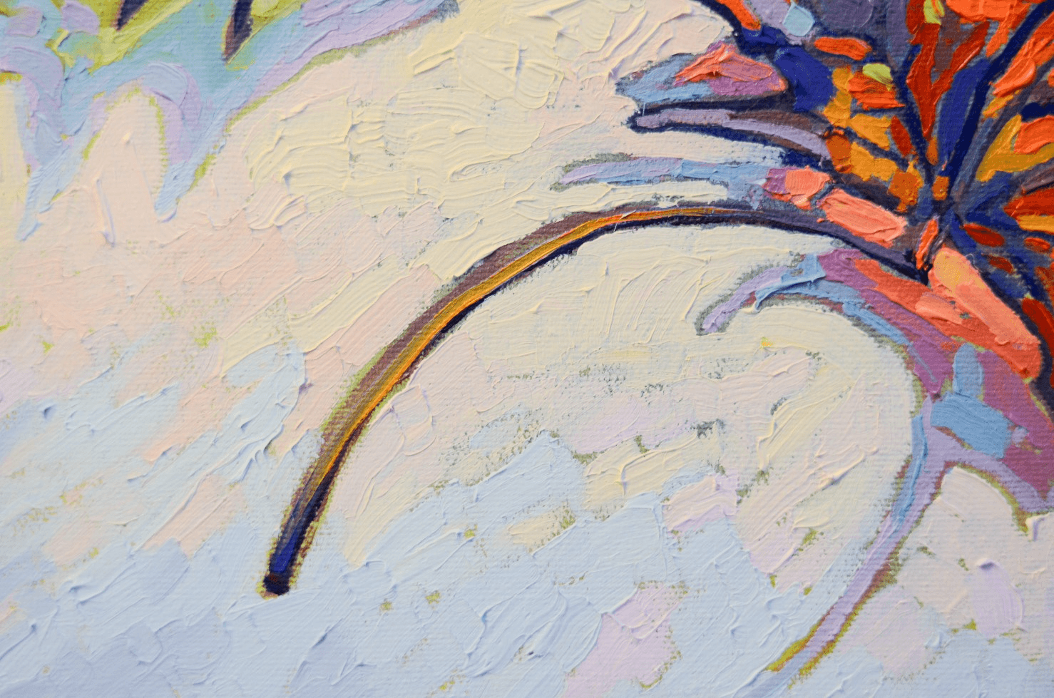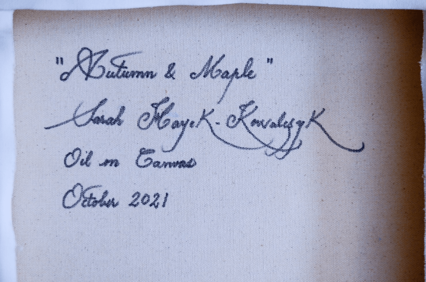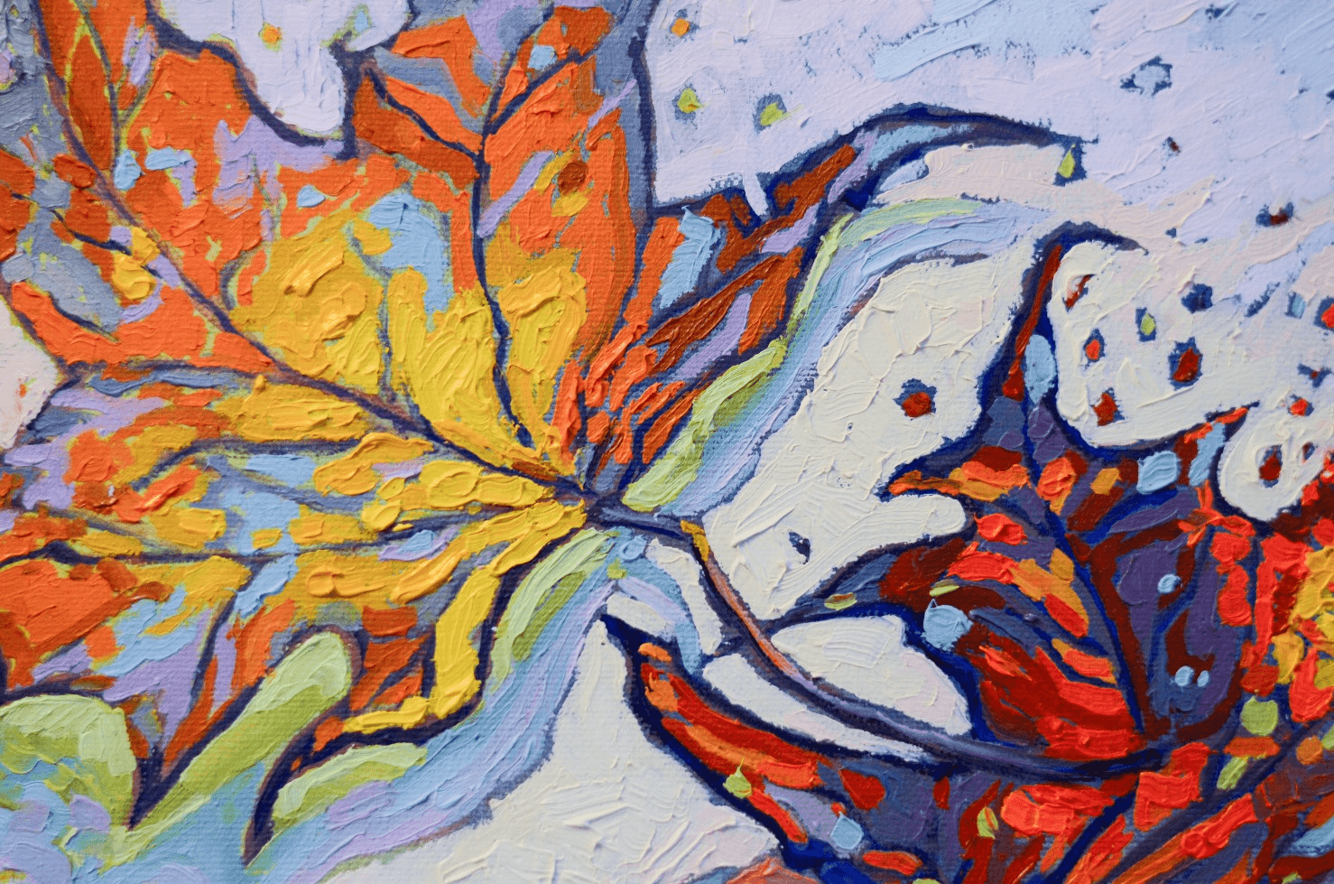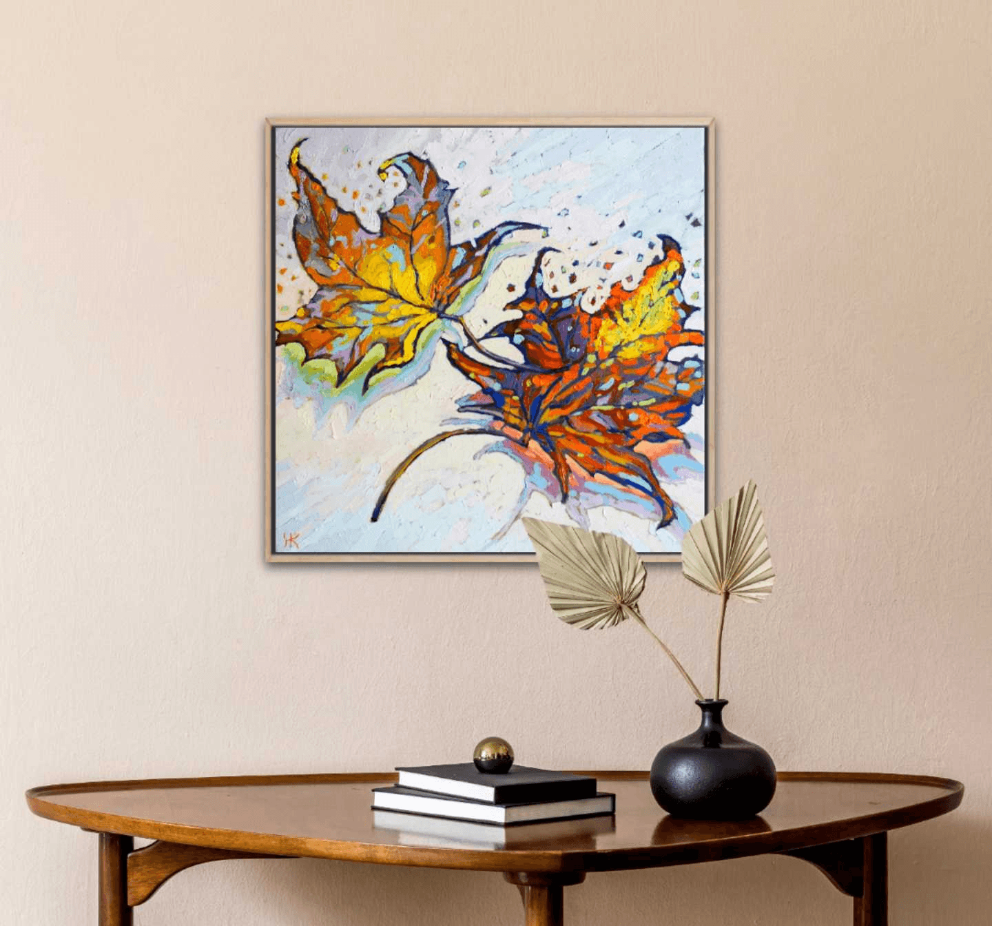 Fall-inspired paintings are a favorite of mine. Maple trees don the most vivid golden and ruby colors one can think of. These hues are displayed in this painting in the most simple of ways. Two maple leaves lying against each other with a simple, light, yet colorful background to enhance their intense and lovely shades of red, yellow and green. The brushstrokes are mounted with thick paint to add a lovely, textured effect. If you run your fingers through the painting you will feel its ridges, valleys and fields.
