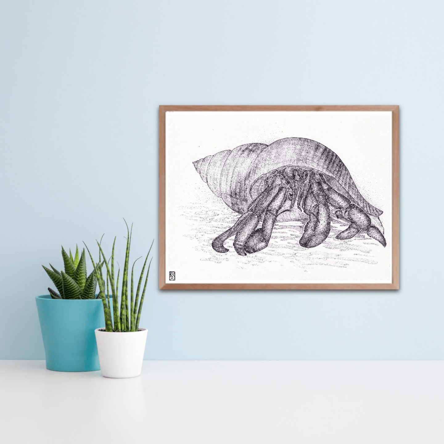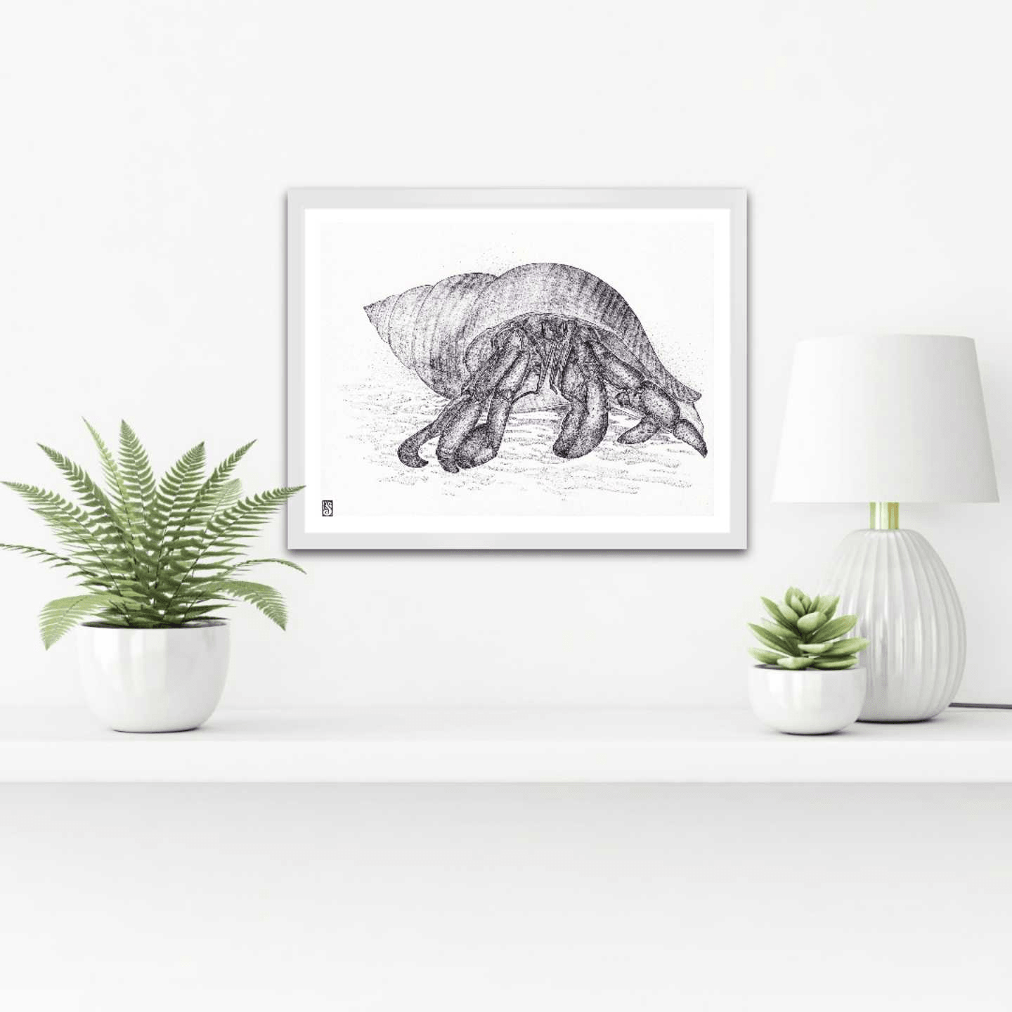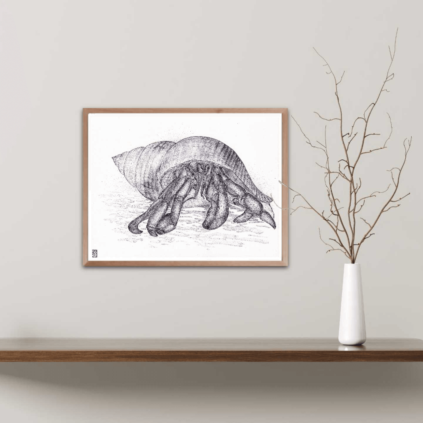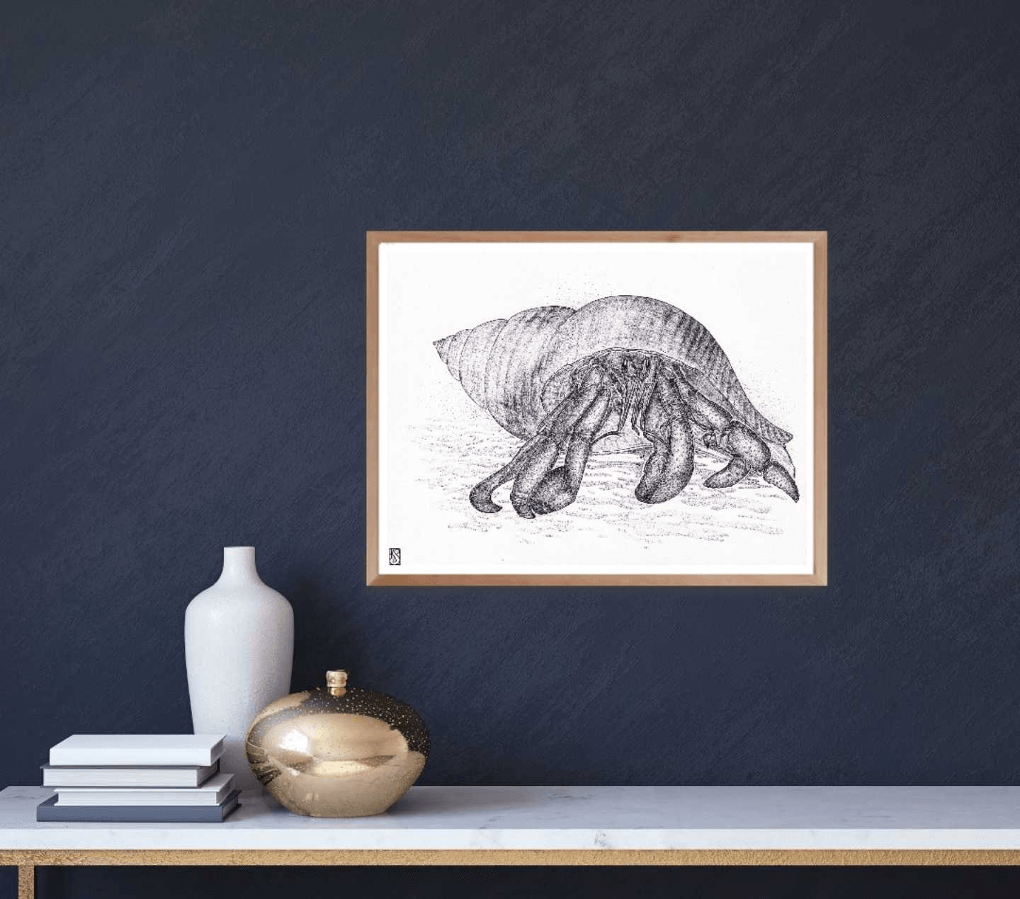 A black and white drawing of a hermit crab in its shell. The details are enhanced by the pointillism technique mixed with strokes done using a ballpoint pen to create a beautiful finish.