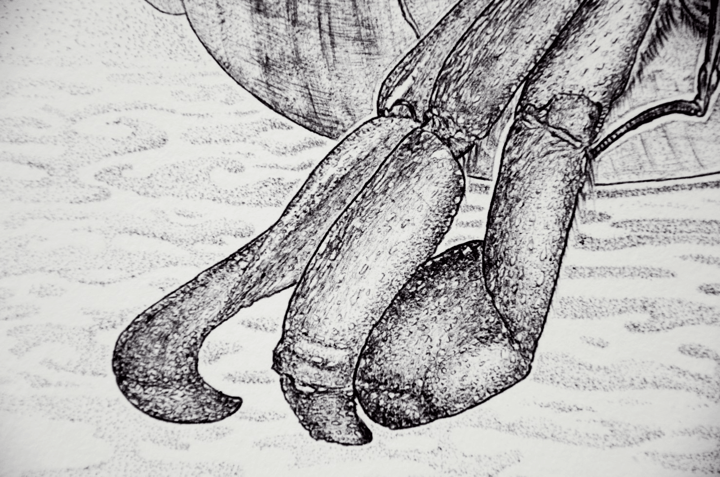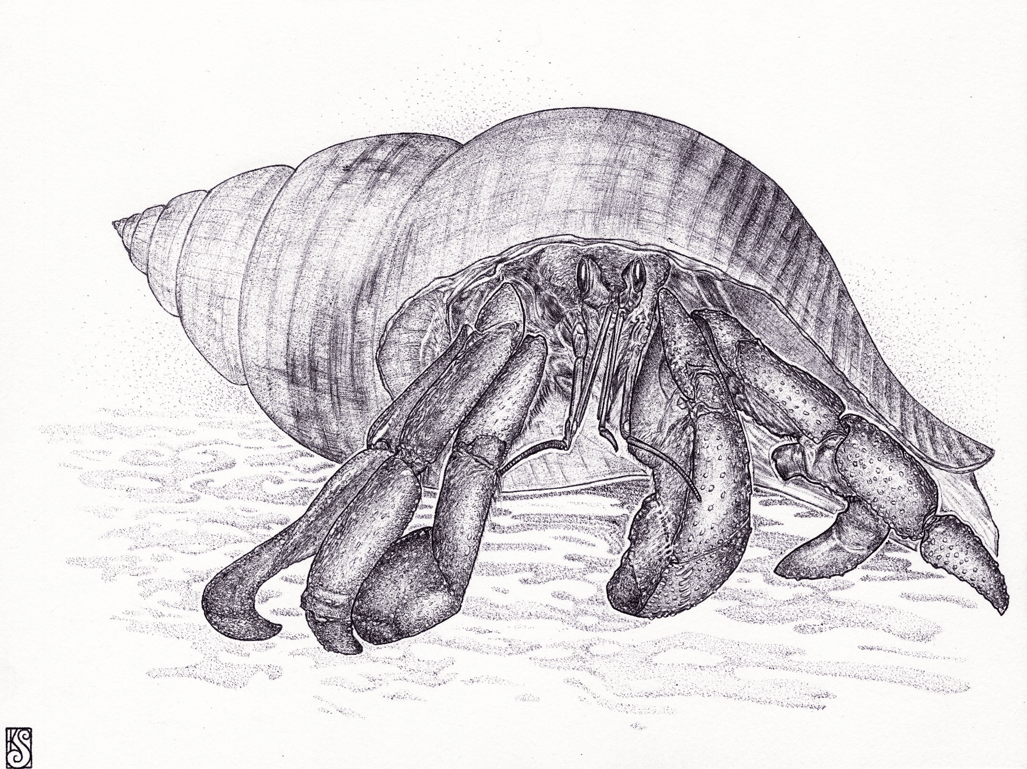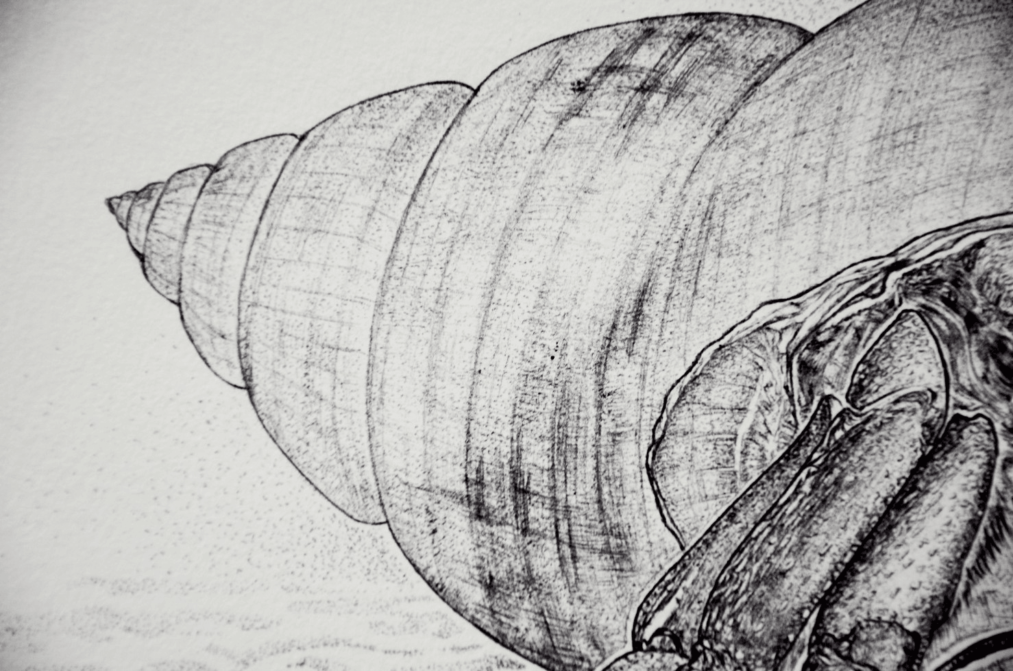 A black and white drawing of a hermit crab in its shell. The details are enhanced by the pointillism technique mixed with strokes done using a ballpoi...