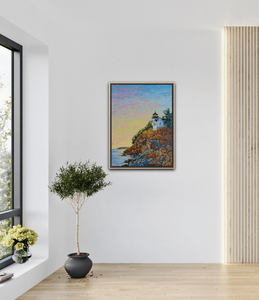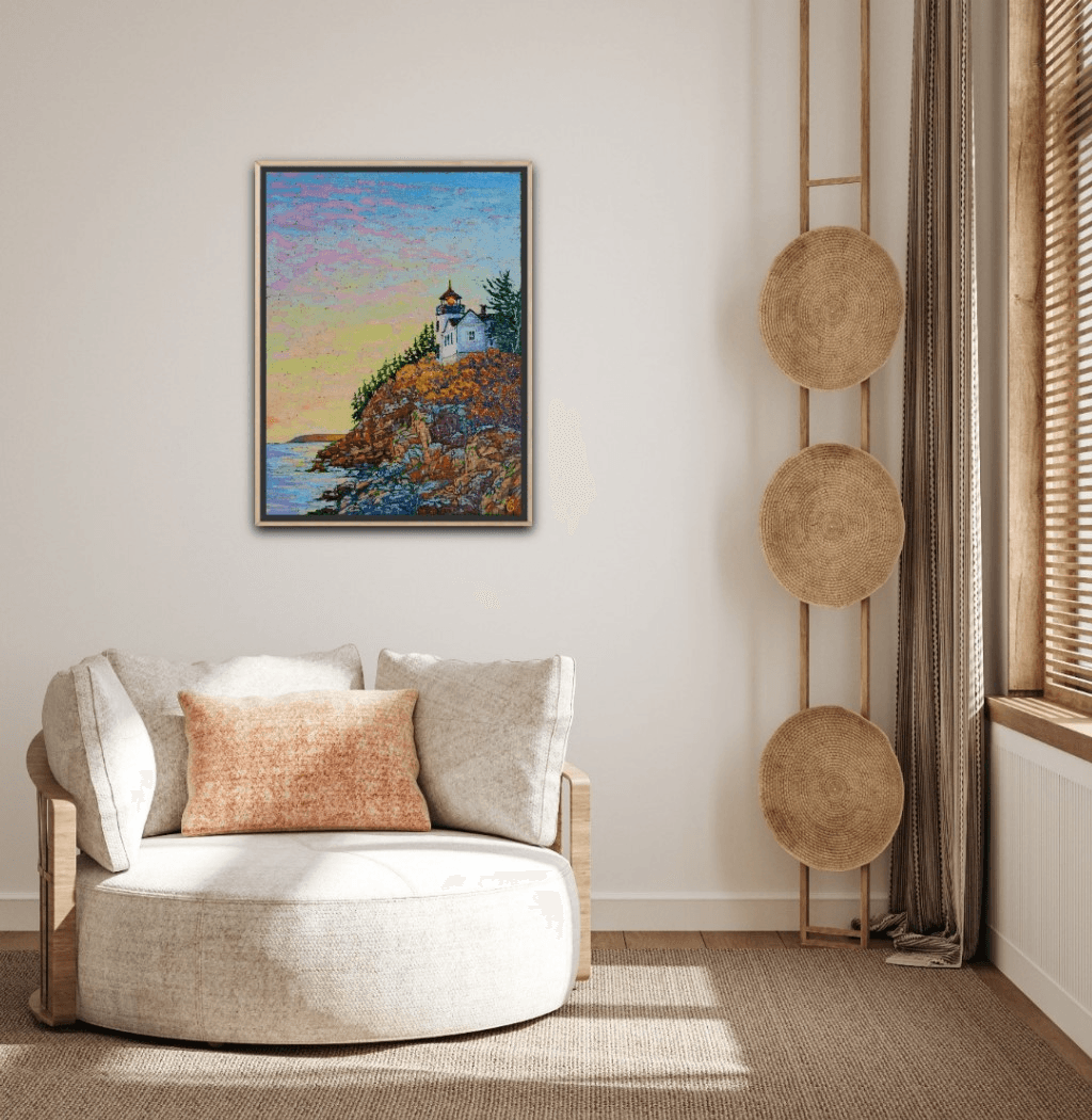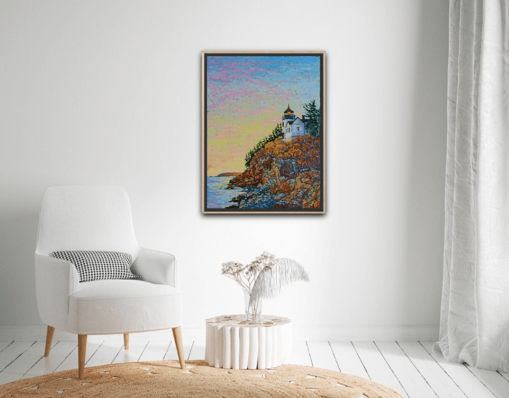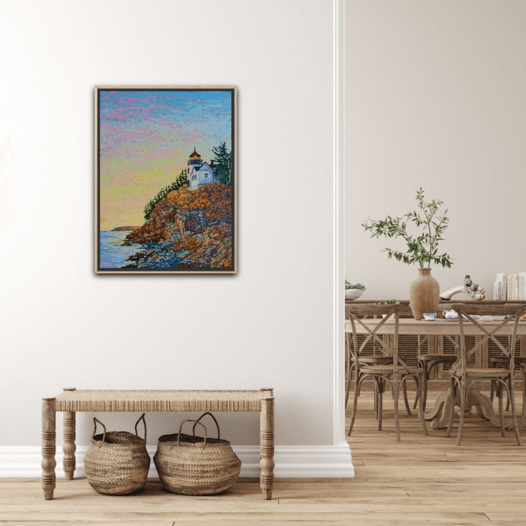 "Bass" is a representation of the famous Bass Harbor Lighthouse in Maine. The jagged, colorful bedrock holding the structure of the lighthouse is topped with evergreens whose branches seem to be swaying to the breath of the ocean. The variety of hues adorning the boulders are caressed by the ocean waves stretching like arms reaching out to the earth. The tones are mellow and soft but still quiet varied and lively which make for a beautiful colorful effect that marry well with the playful yet serene quality of the skies.