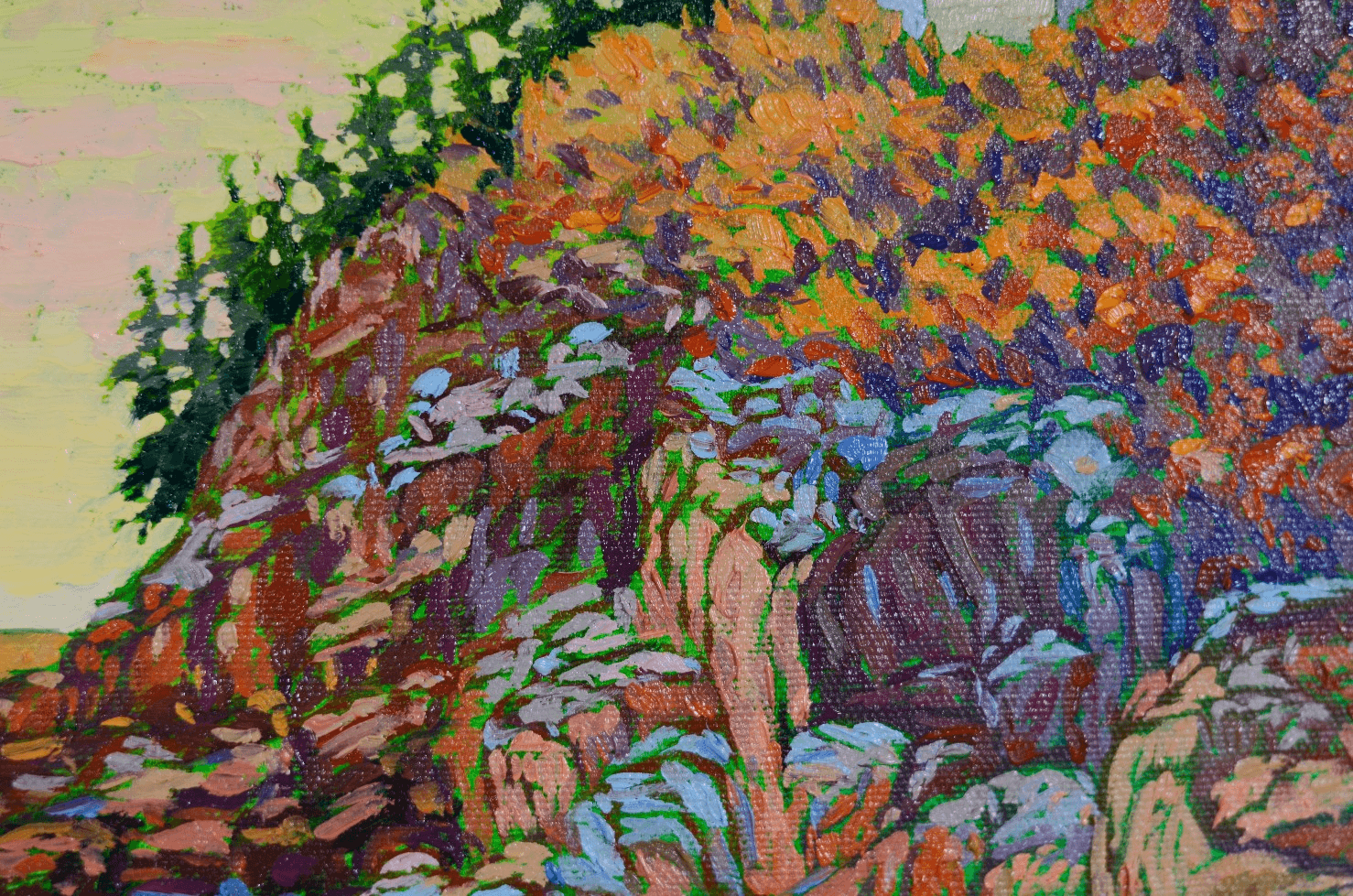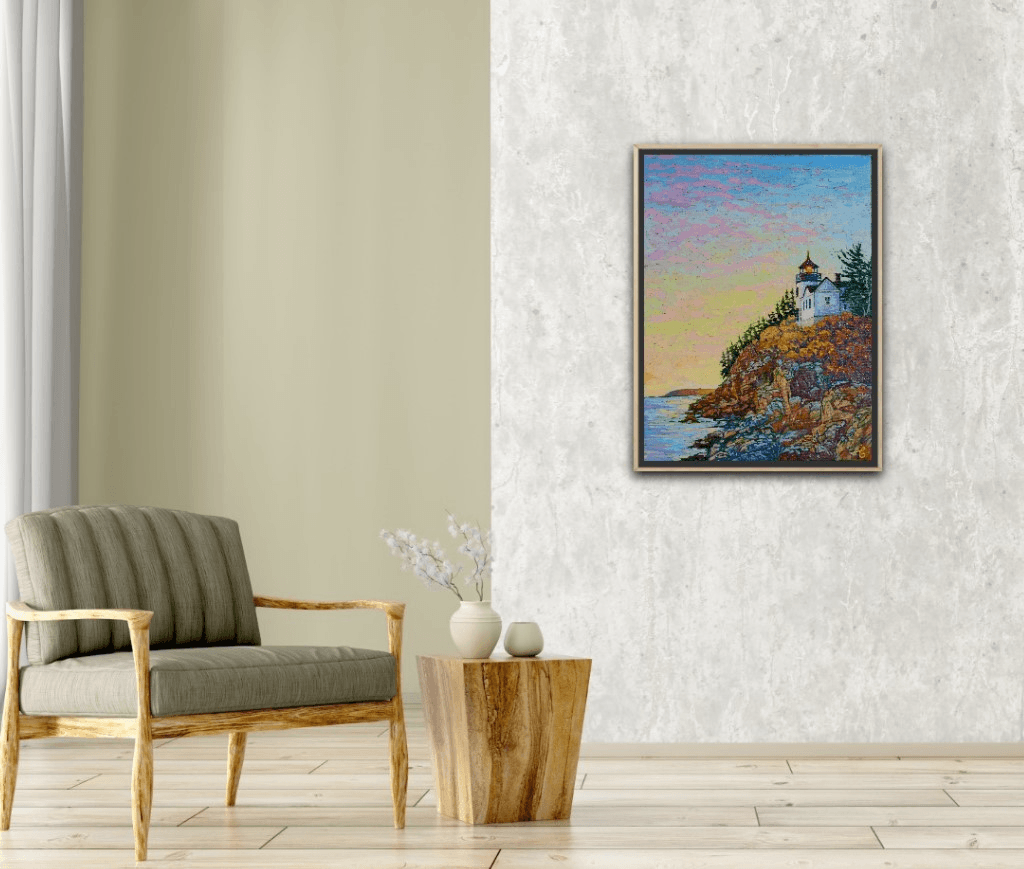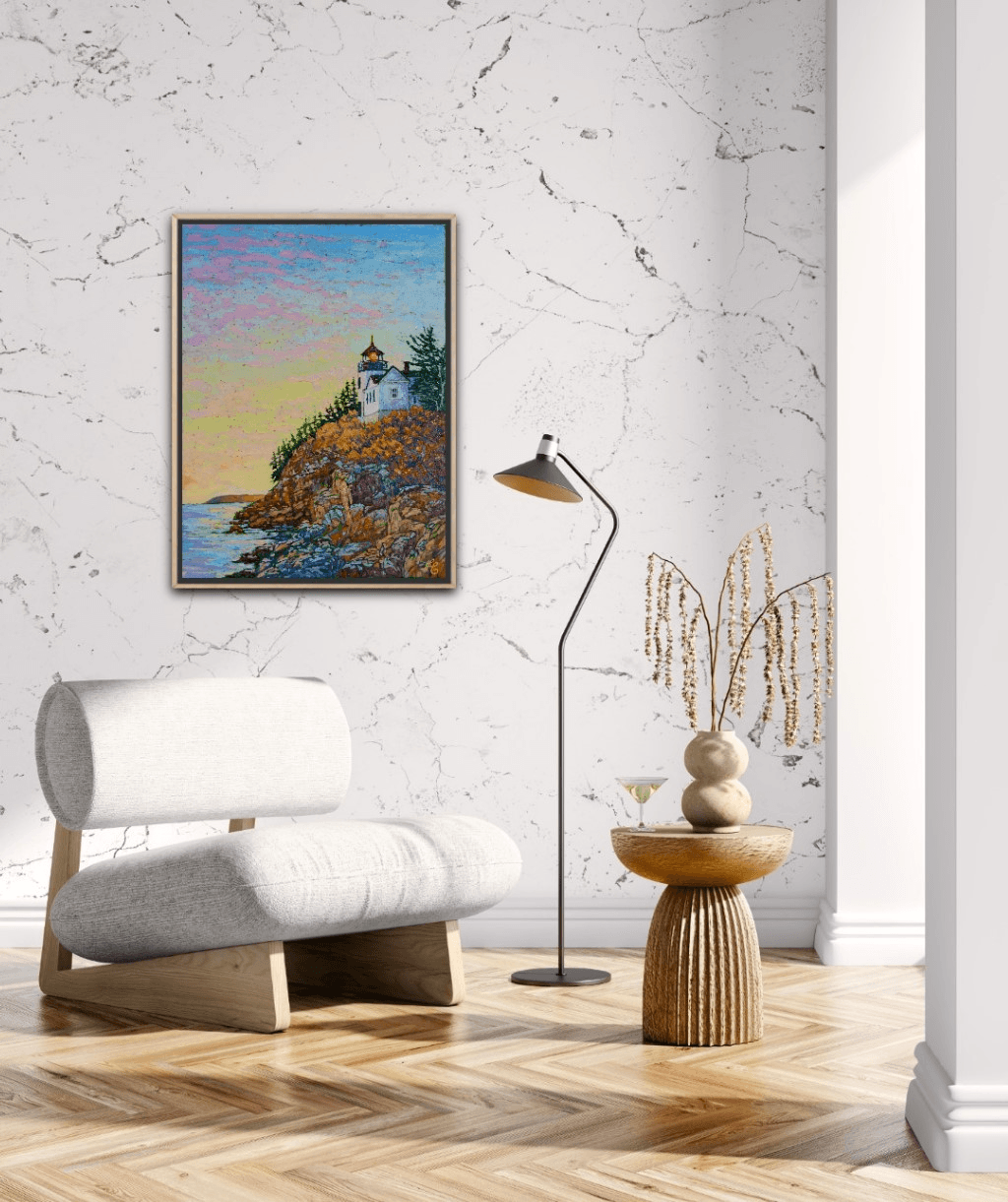 "Bass" is a representation of the famous Bass Harbor Lighthouse in Maine. The jagged, colorful bedrock holding the structure of the lighthouse is topped with evergreens whose branches seem to be swaying to the breath of the ocean. The variety of hues adorning the boulders are caressed by the ocean waves stretching like arms reaching out to the earth. The tones are mellow and soft but still quiet varied and lively which make for a beautiful colorful effect that marry well with the playful yet serene quality of the skies.