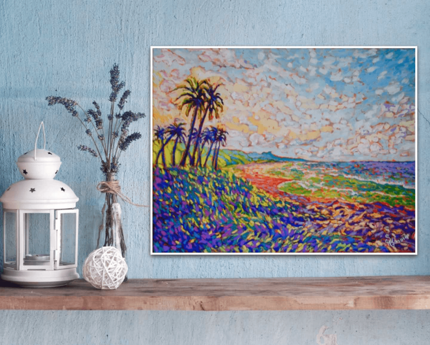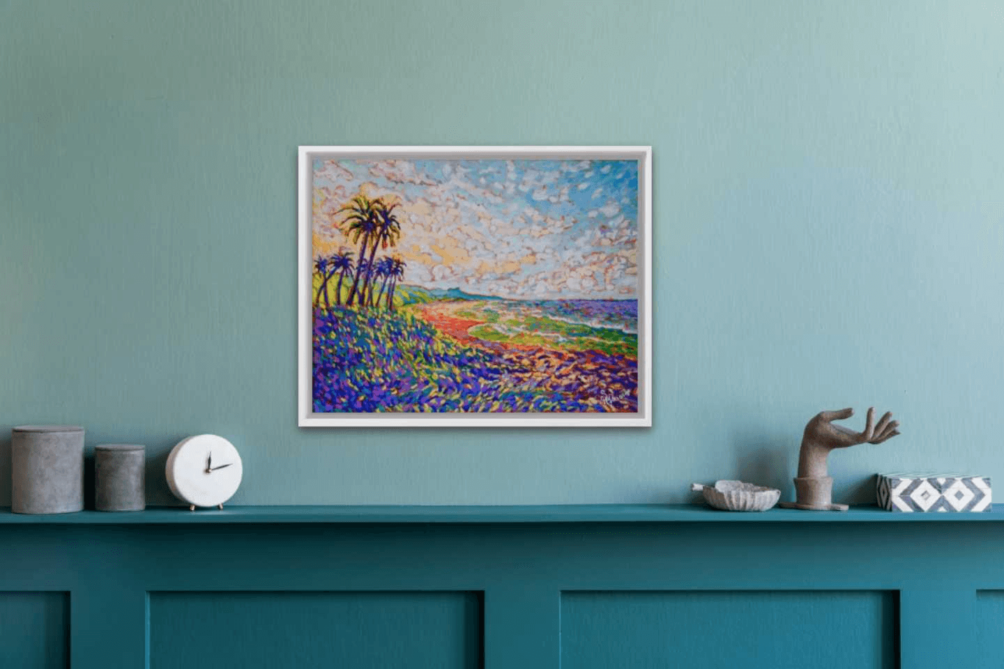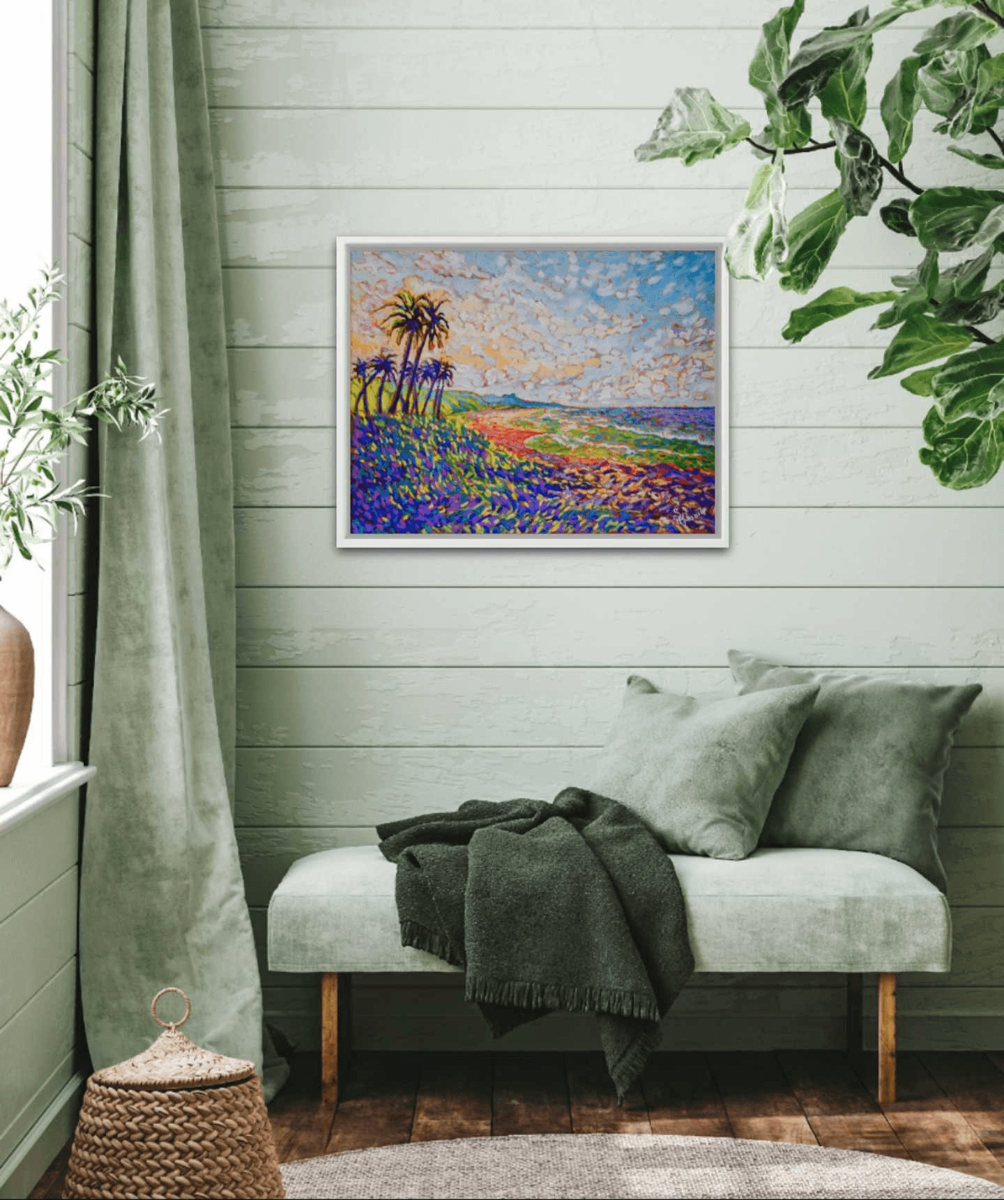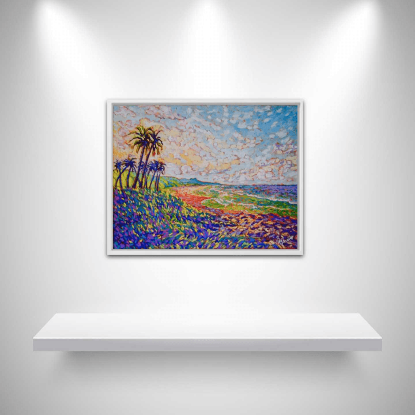 Bathsheba is a shoreline stretching along the east side of the island of Barbados, facing the powerful waves of the Atlantic Ocean. The scenes along the shore are spectacular, marked by big boulders and rocks, as well as long coconut trees, dancing to the heavy wind. This little painting with its evocative, vibrant colors against a soft palette of blue skies, sprinkled with light, feathery clouds creates an atmospheric finish that lures the viewer in.