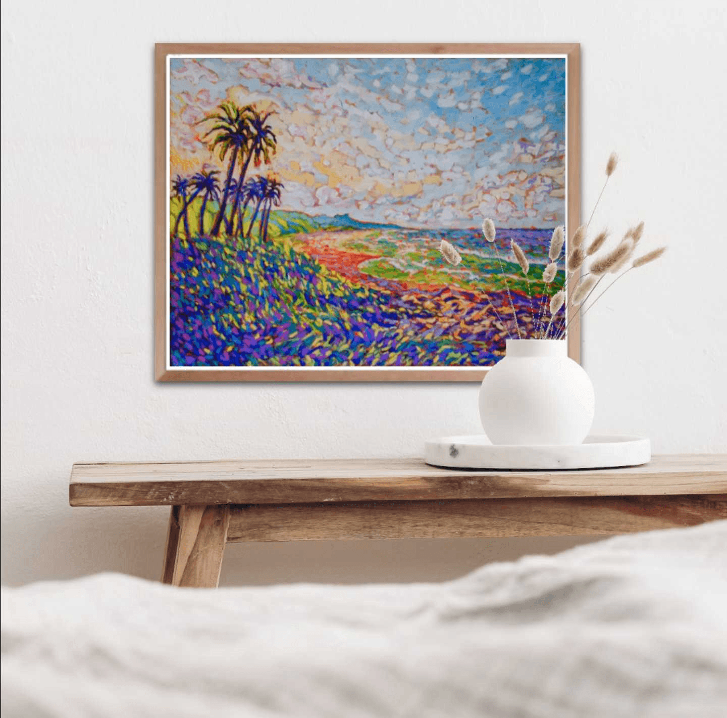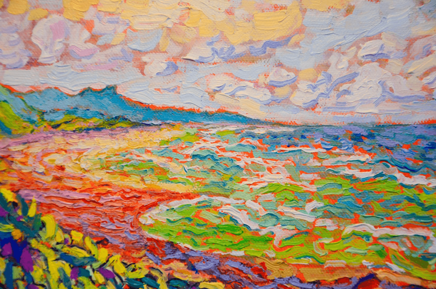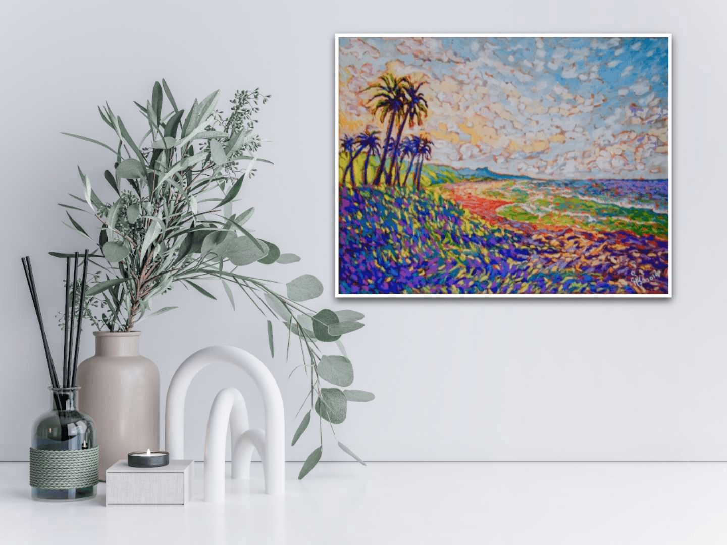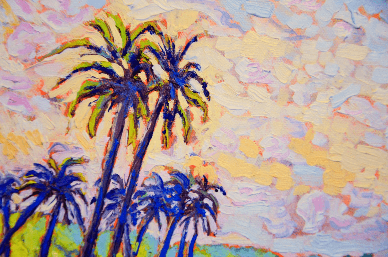 Bathsheba is a shoreline stretching along the east side of the island of Barbados, facing the powerful waves of the Atlantic Ocean. The scenes along the shore are spectacular, marked by big boulders and rocks, as well as long coconut trees, dancing to the heavy wind. This little painting with its evocative, vibrant colors against a soft palette of blue skies, sprinkled with light, feathery clouds creates an atmospheric finish that lures the viewer in.
