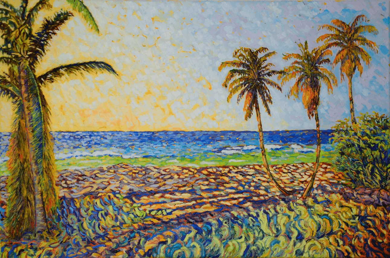 The sun hits the land and the sand on Bathsheba Beach, as its rays dazzles the green leaves of the coconut trees and creates a game of light and shadow along their long stretched trunks. As you make your first steps towards the shore, the ocean ahead welcomes you with its constant, faithful waves, while the wind plays and twists in the twirling grass and greens beneath your feet.
