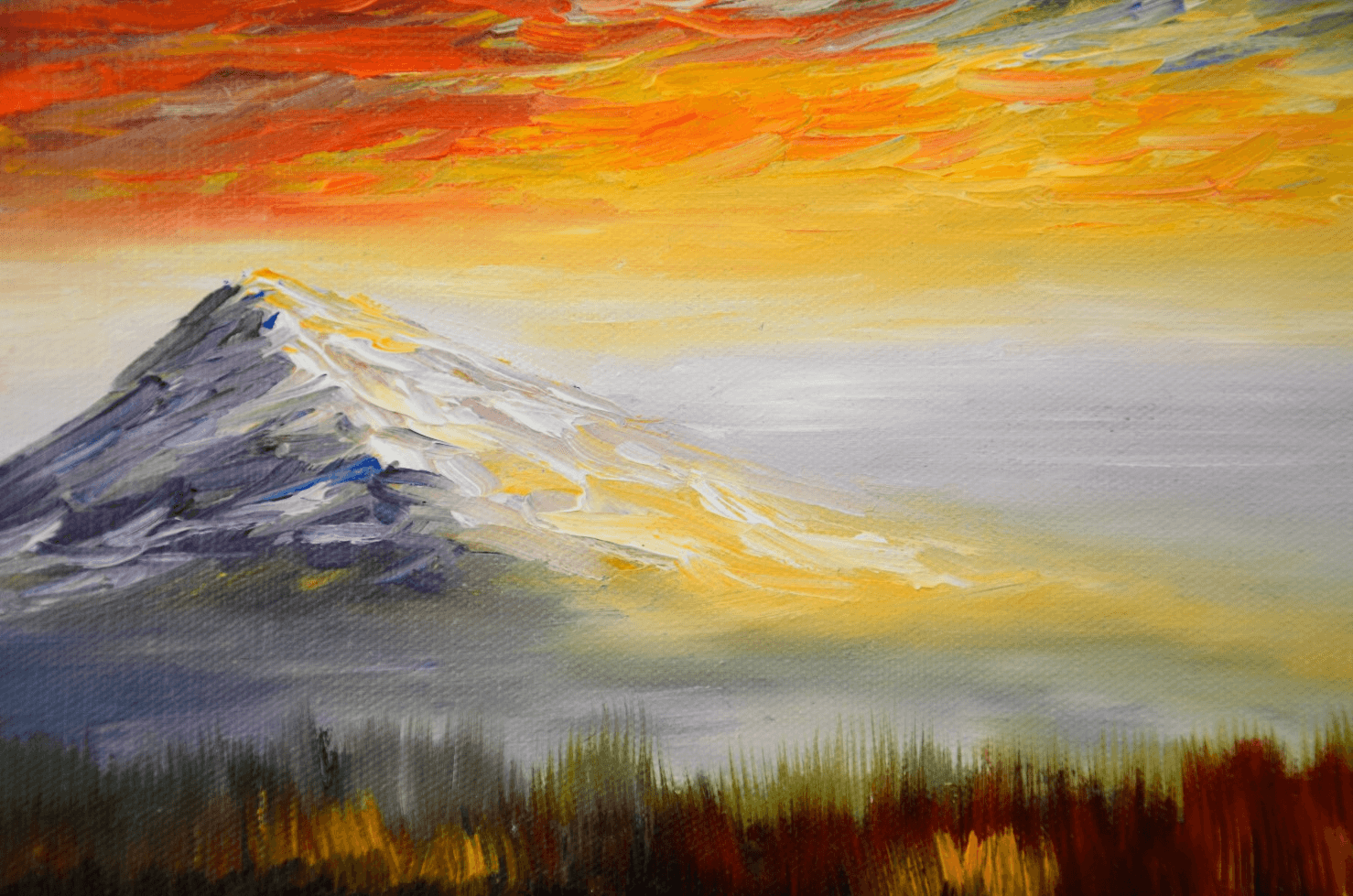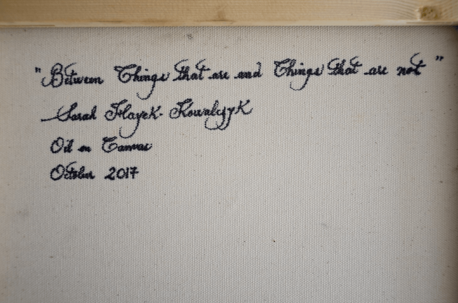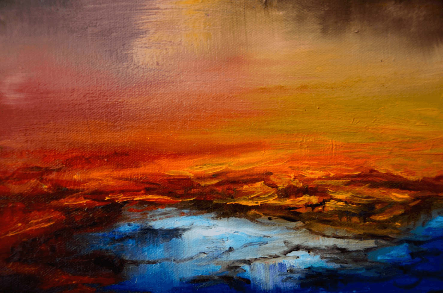 This painting holds a place in between two worlds. There is a stillness, a certain quietude to its center as the sky in the background and the water and abyss in the foreground wage their wars with vivid and striking colors, their weight and pressure almost crushing, pressing and compressing the universe in between.