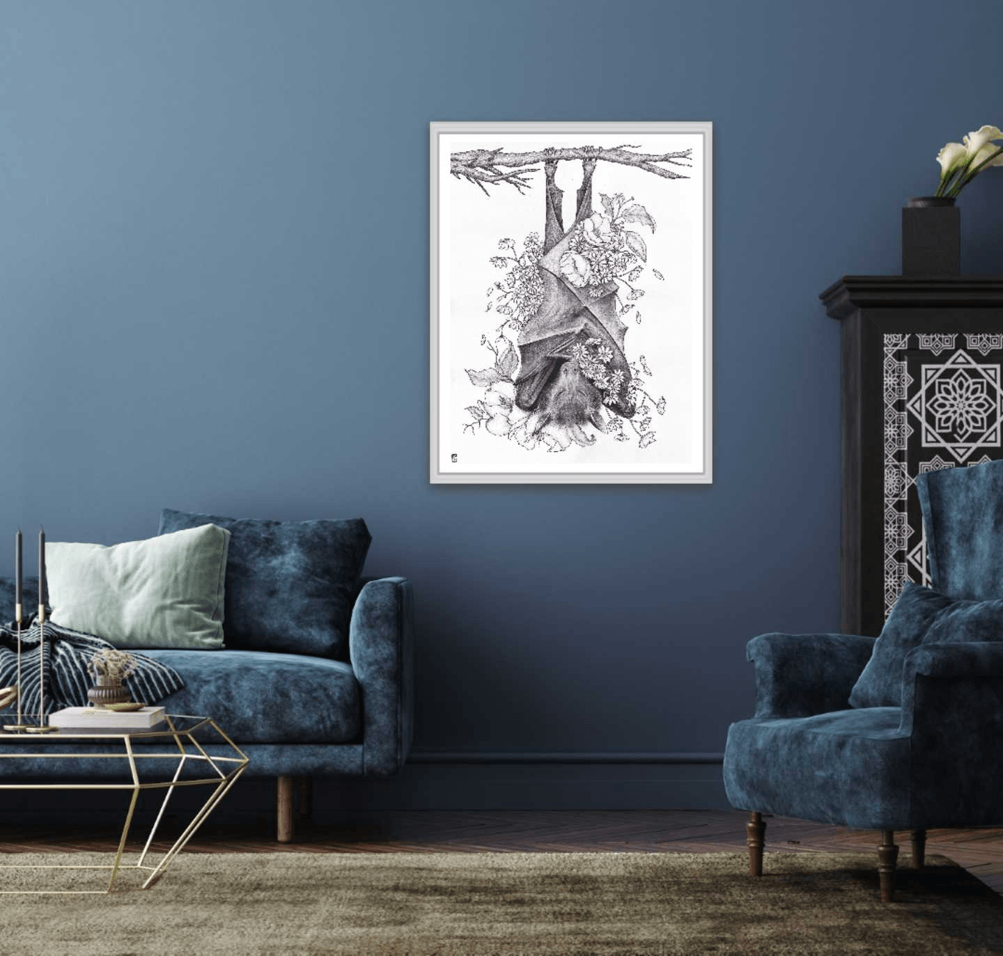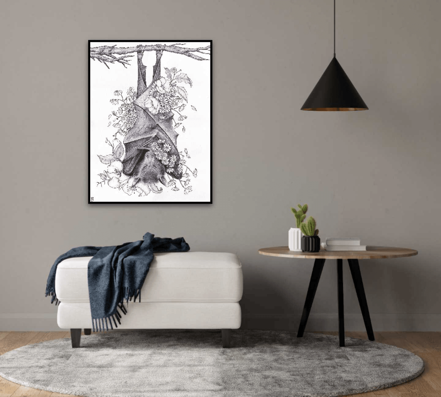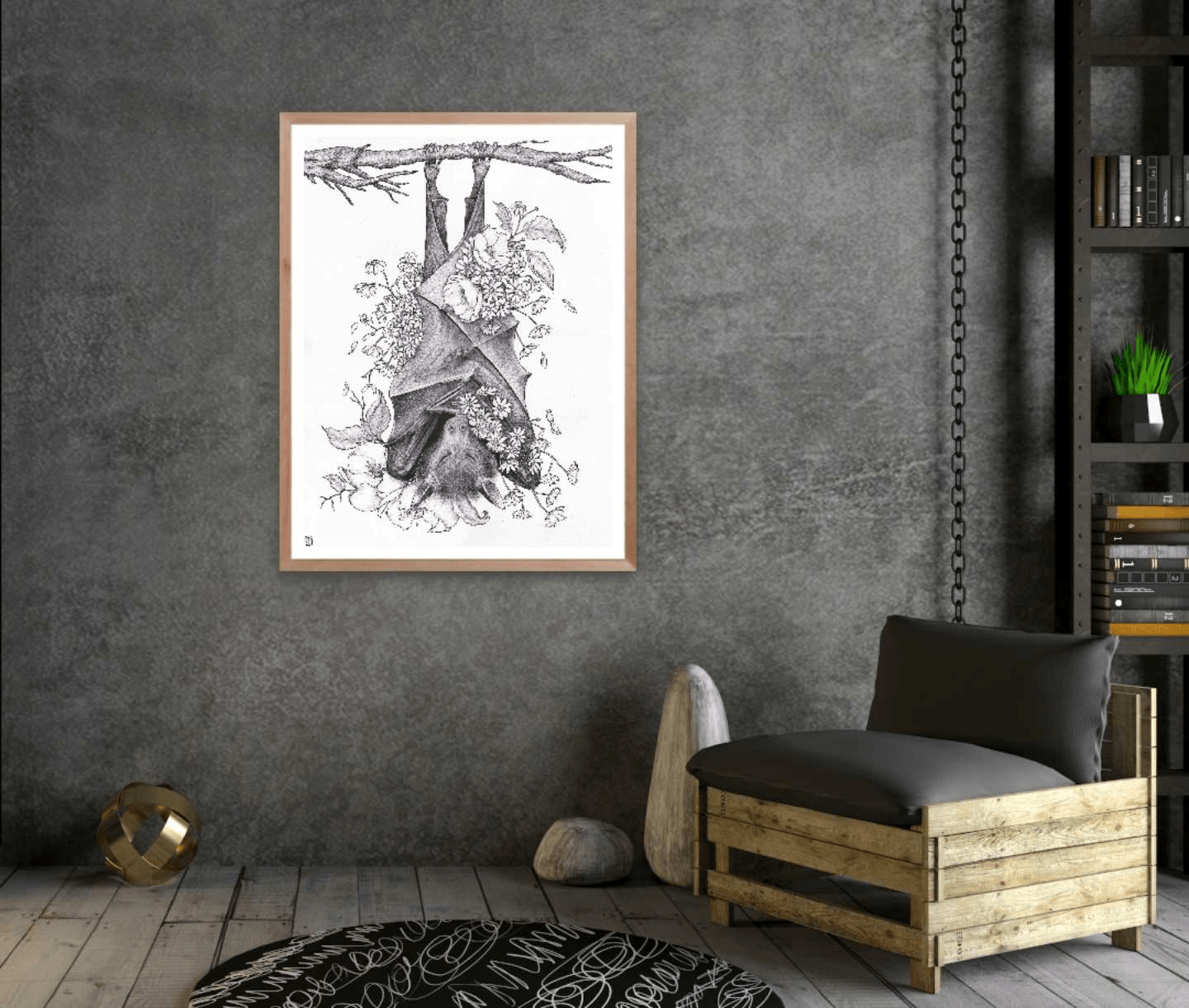 Bats are misunderstood creatures. My goal behind this artwork is to show their vulnerability and gentleness. Therefore I chose a sleeping bat, danglin...