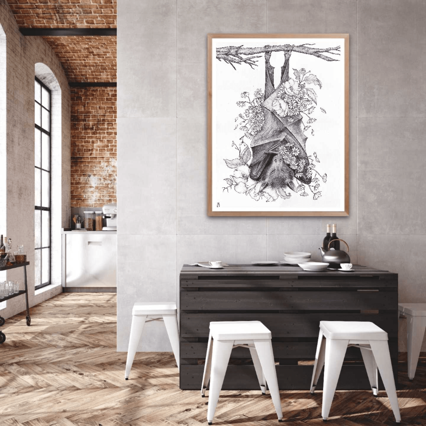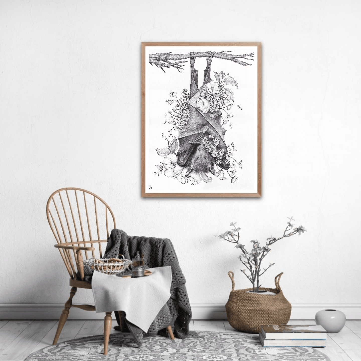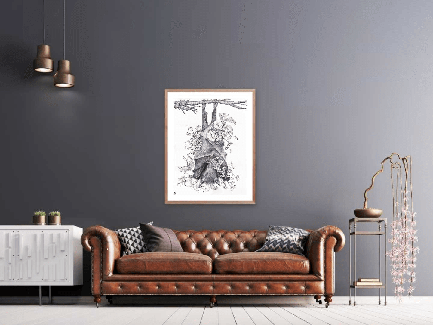 Bats are misunderstood creatures. My goal behind this artwork is to show their vulnerability and gentleness. Therefore I chose a sleeping bat, danglin...