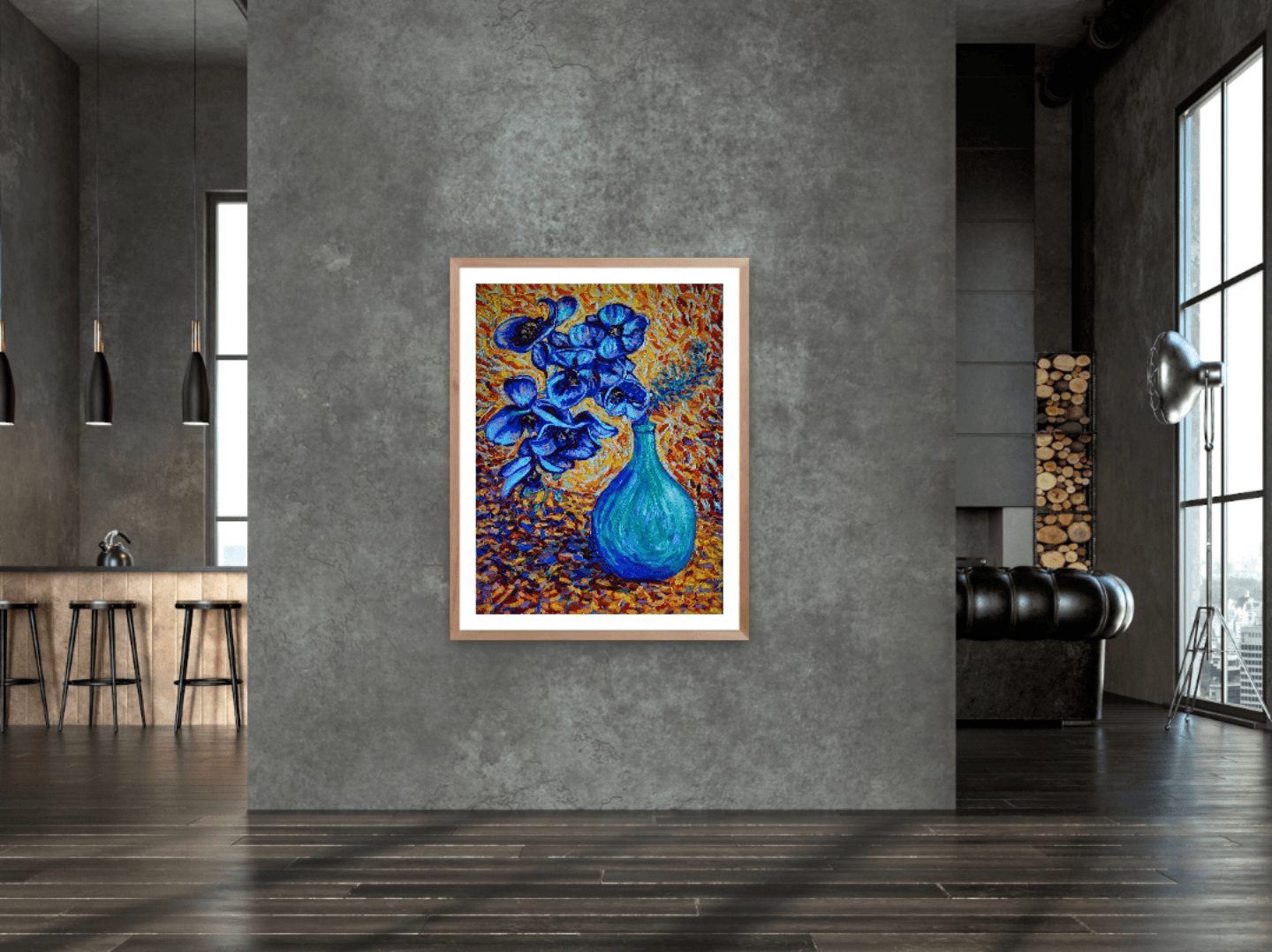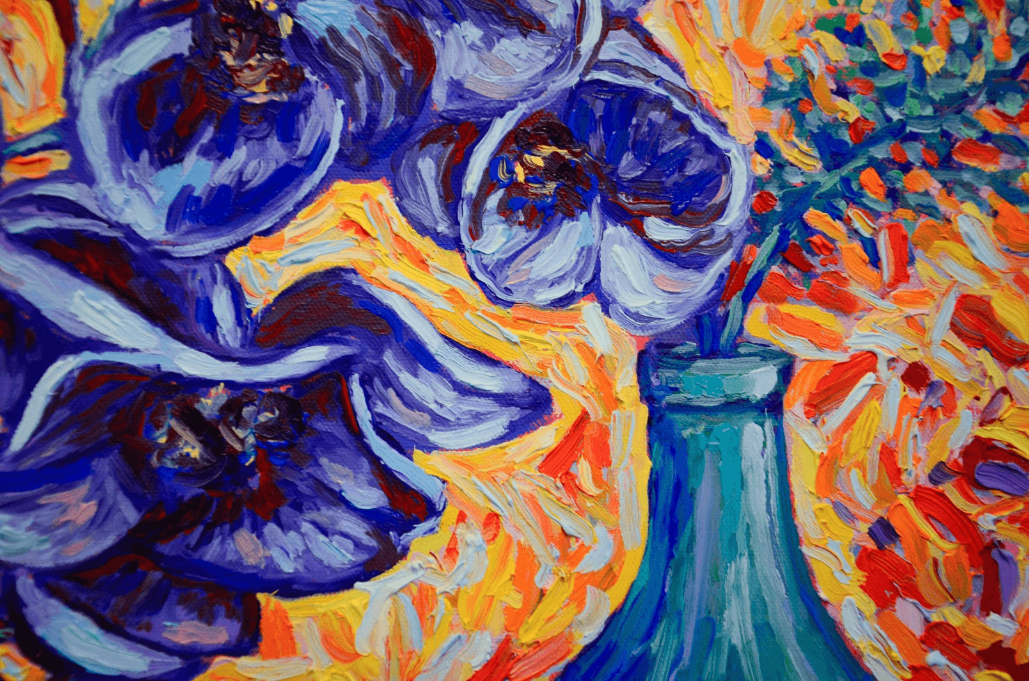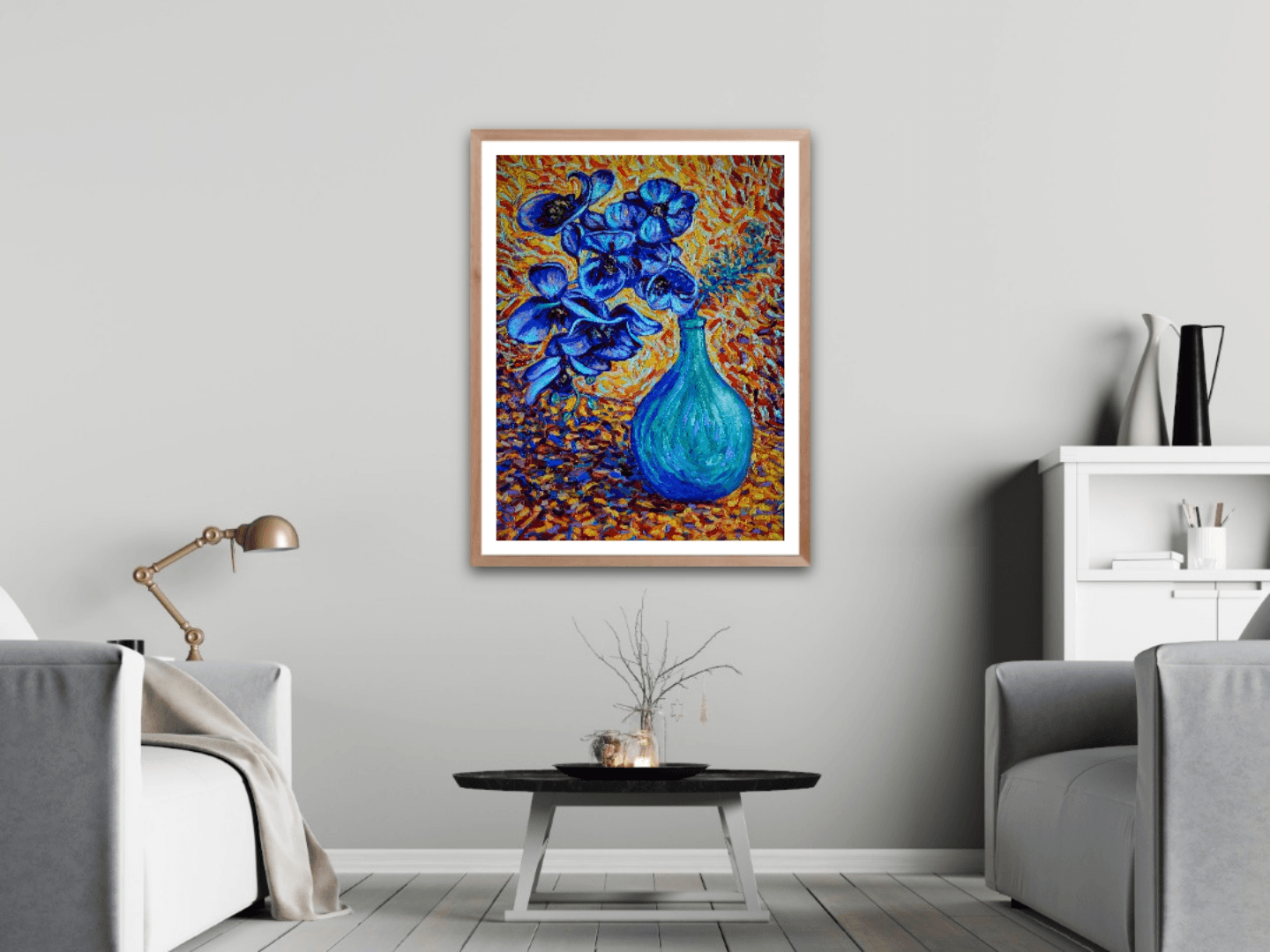 This paintings is of a gorgeous collection of blue orchids in full bloom displayed in an elegant teal vase against a warm, vibrant background. The thick brushstrokes mounted with generous and copious amounts of paint gives this painting a beautiful textured effect.