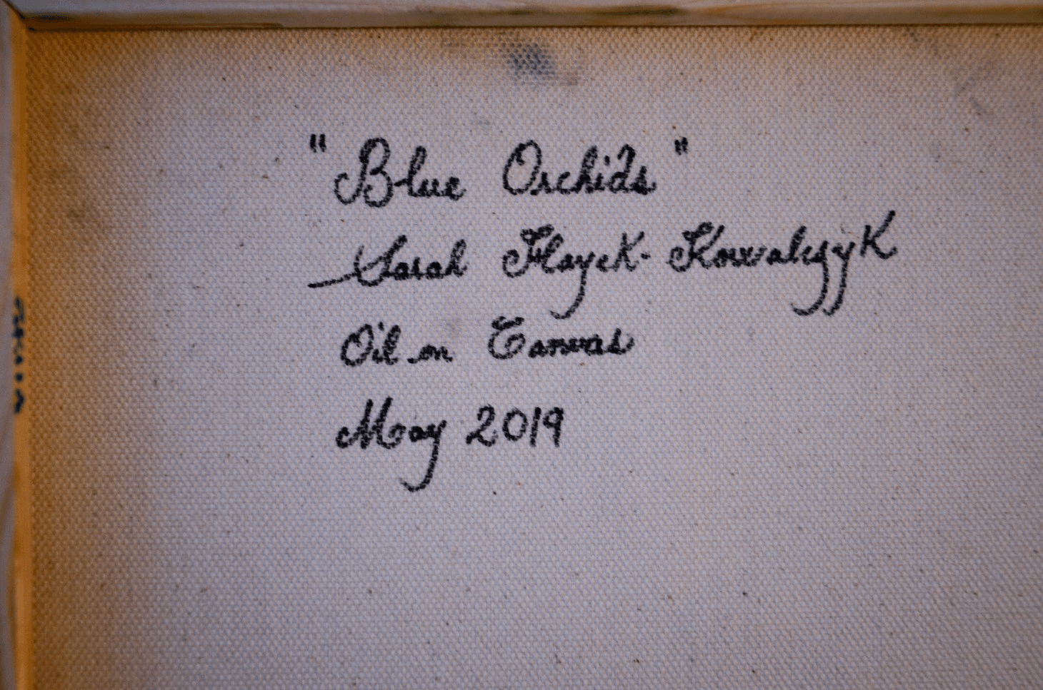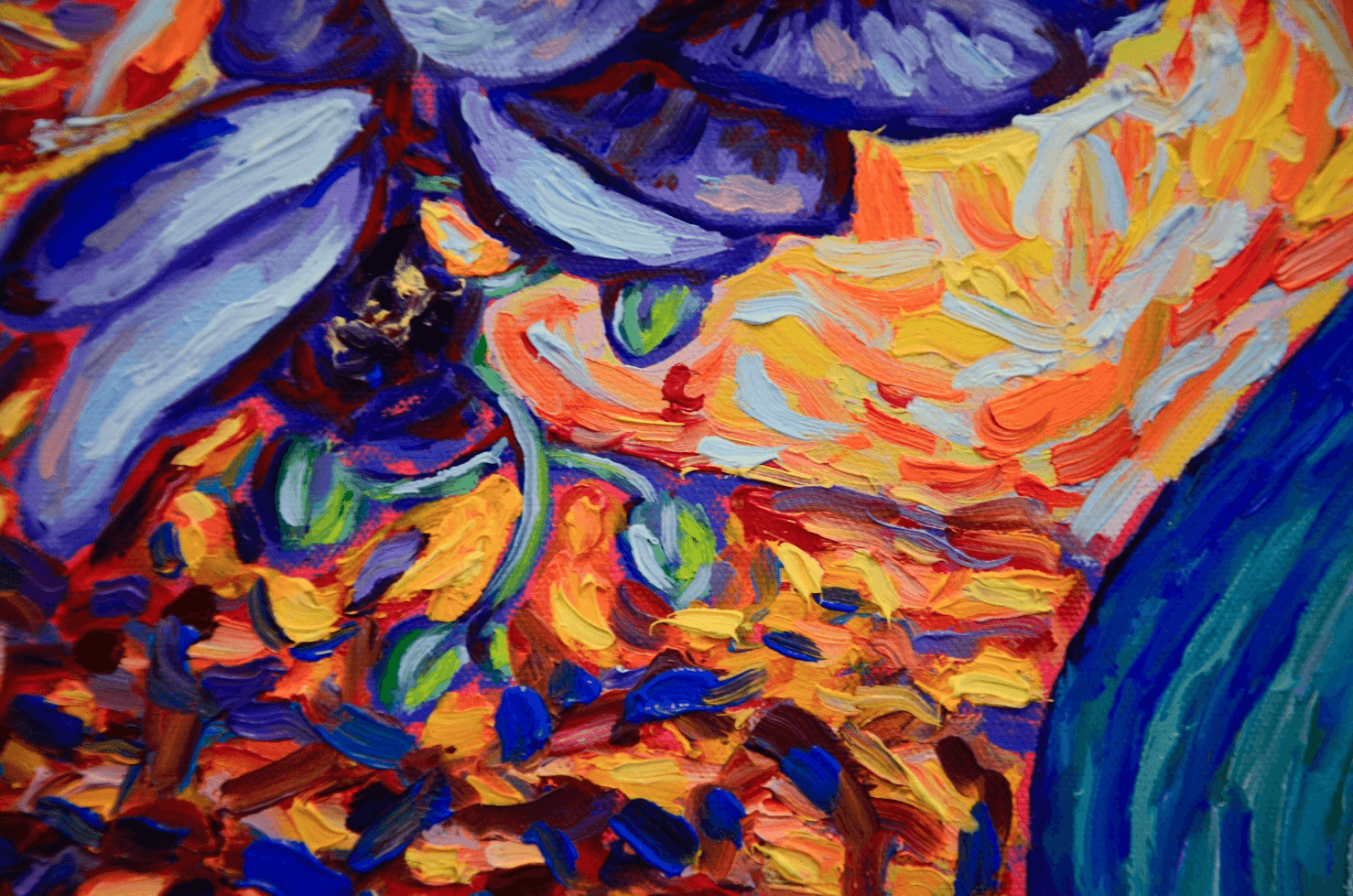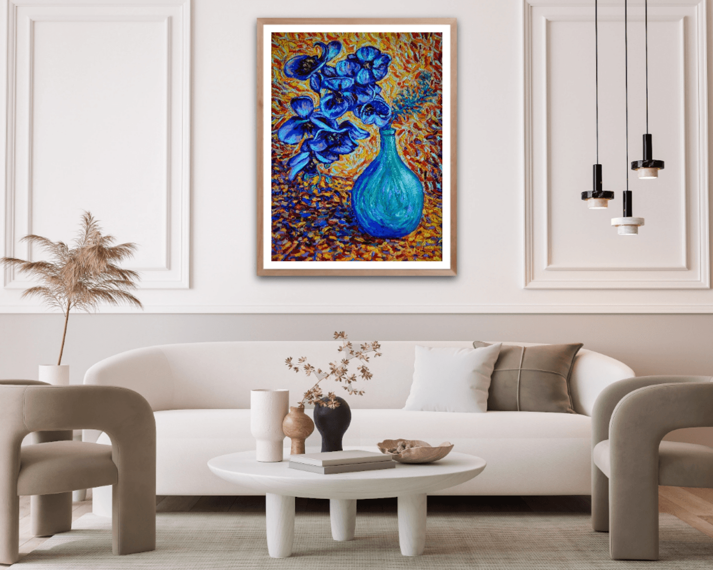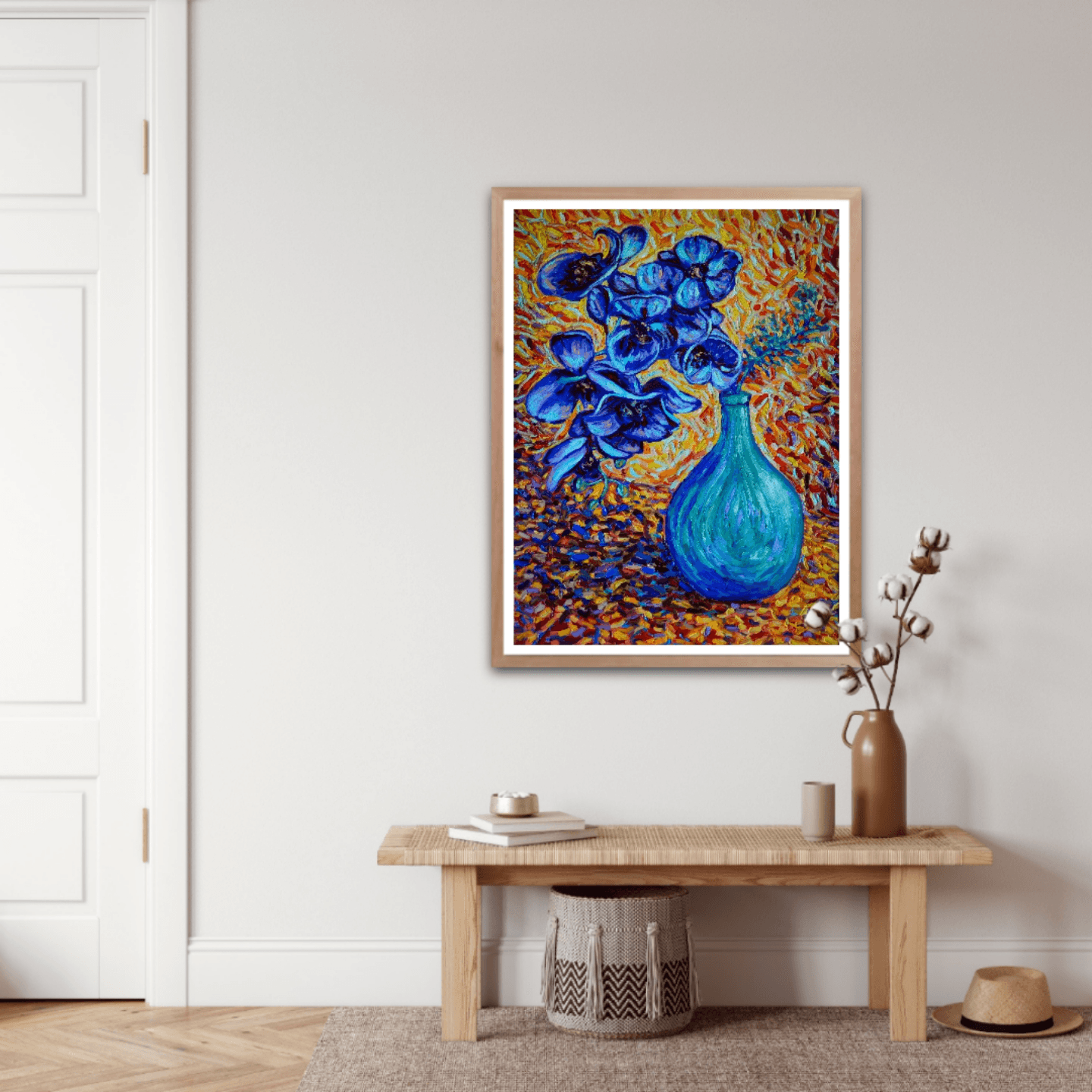 This paintings is of a gorgeous collection of blue orchids in full bloom displayed in an elegant teal vase against a warm, vibrant background. The thick brushstrokes mounted with generous and copious amounts of paint gives this painting a beautiful textured effect.