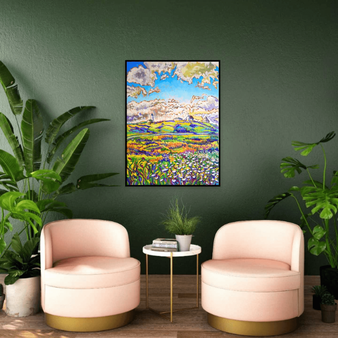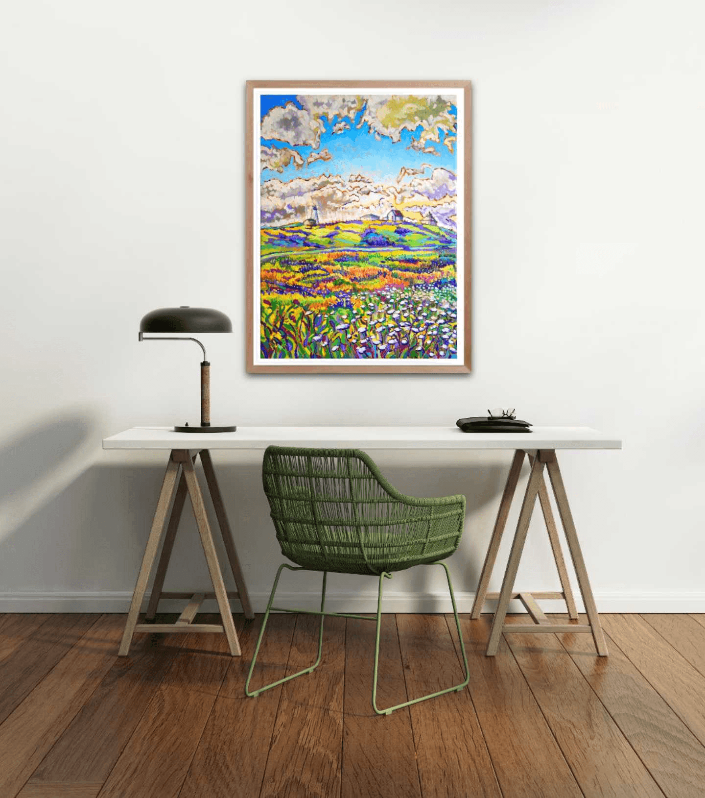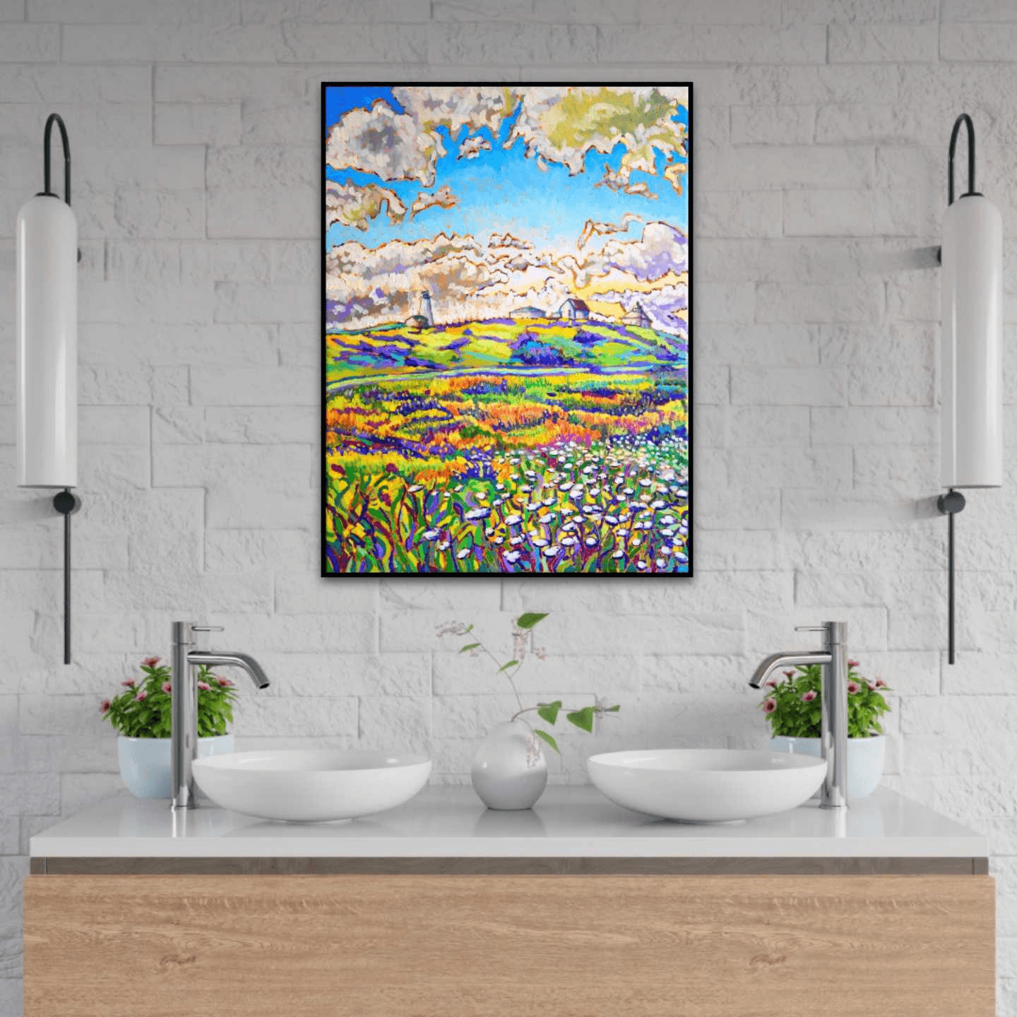 This is Cape Spear or what I believe it is, a happy place. Cape Spear is the easternmost point in North America. If you look out from there, all you have in front of you is the magnitude and vastness of the Atlantic Ocean. Its lighthouse is the oldest surviving lighthouse in Newfoundland. I chose a very bright and cheerful palette for this work to bring out the joy that it already brought out in me when I visited it. This happy place always reminds of happy days and makes me look forward to even happier ones. I hope it does the same to you.