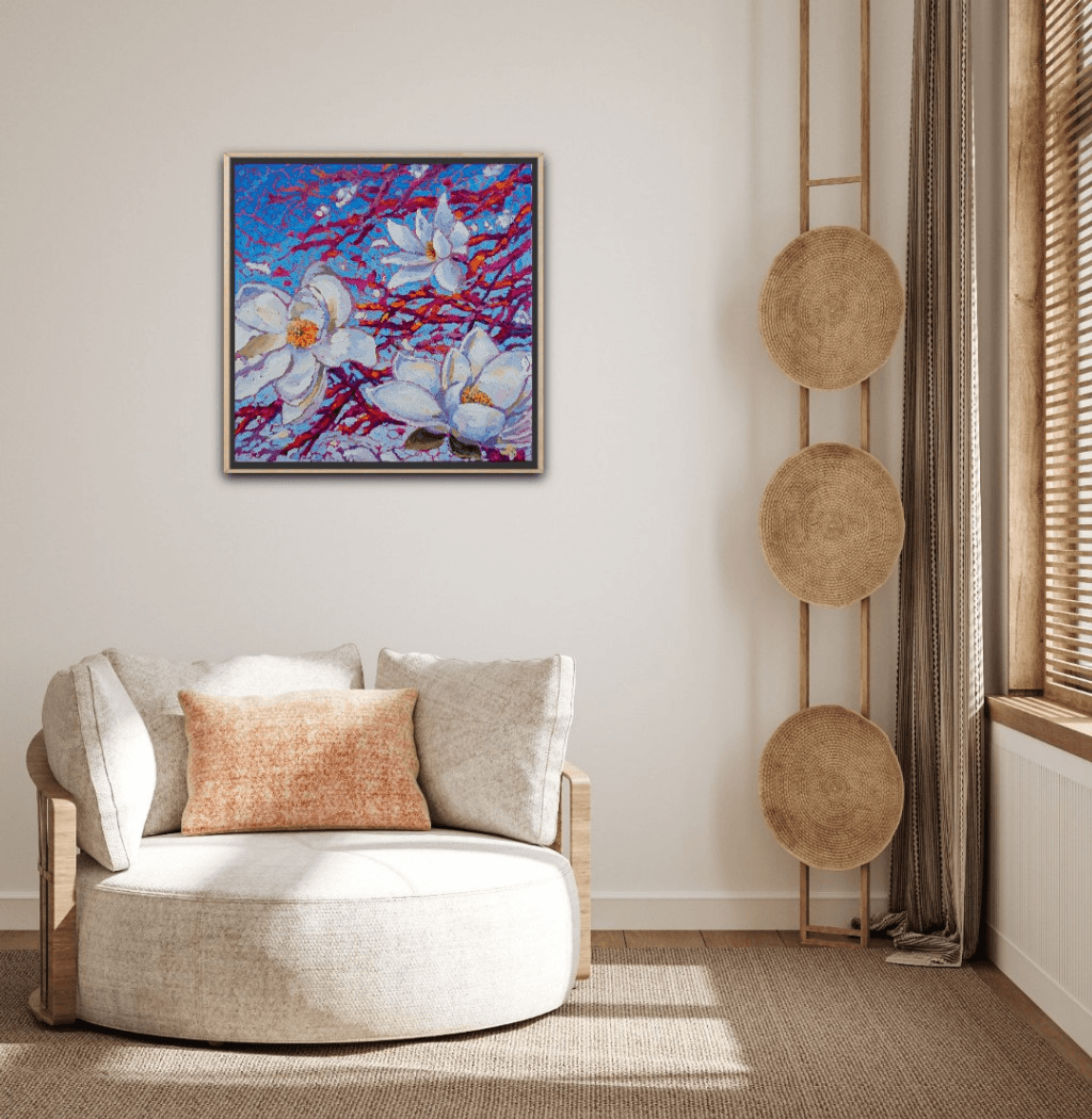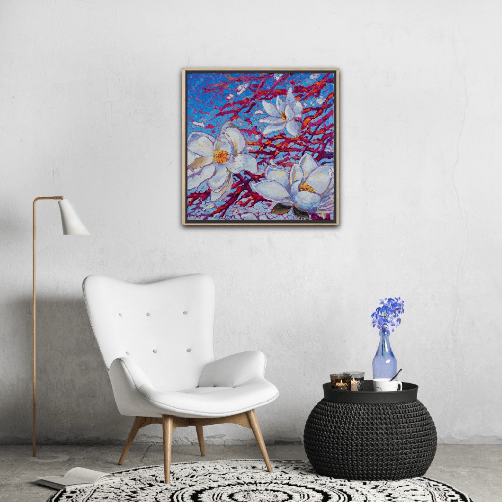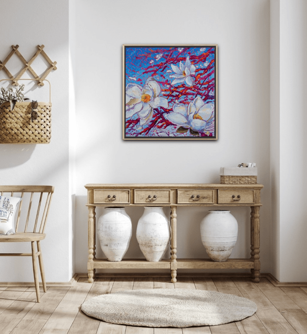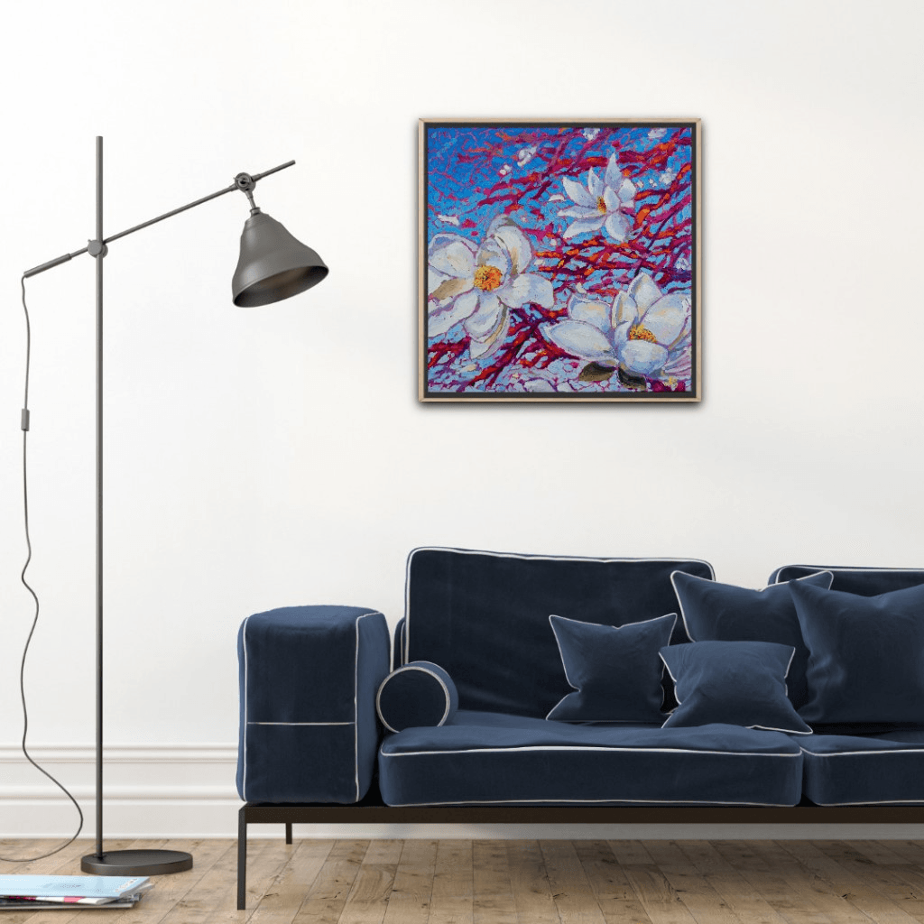 "Celestine" portrays a couple of freshly opened, white magnolias perched forever on their supportive branches. Their beauty and fragility are enhanced by the vivid pinks, oranges and fuchsias of the branches as well as a vibrant, gradient blue background.