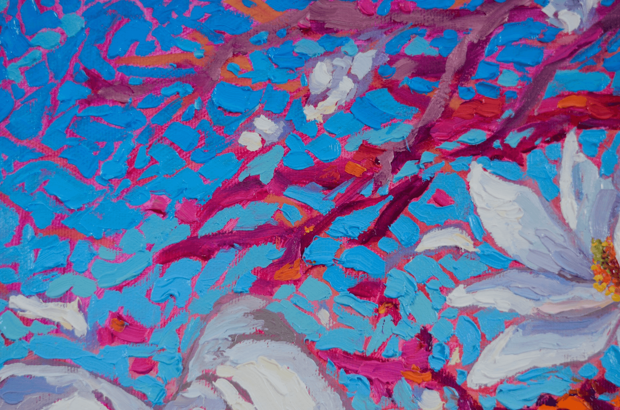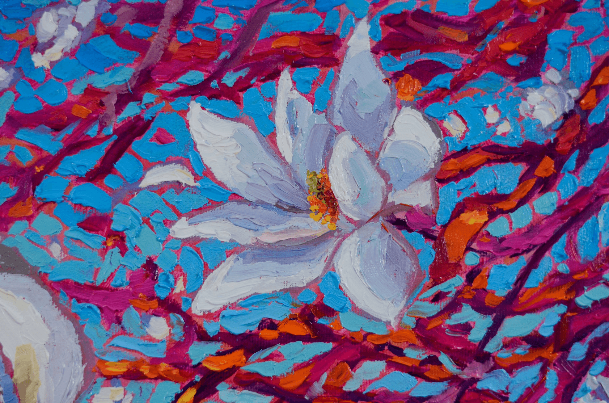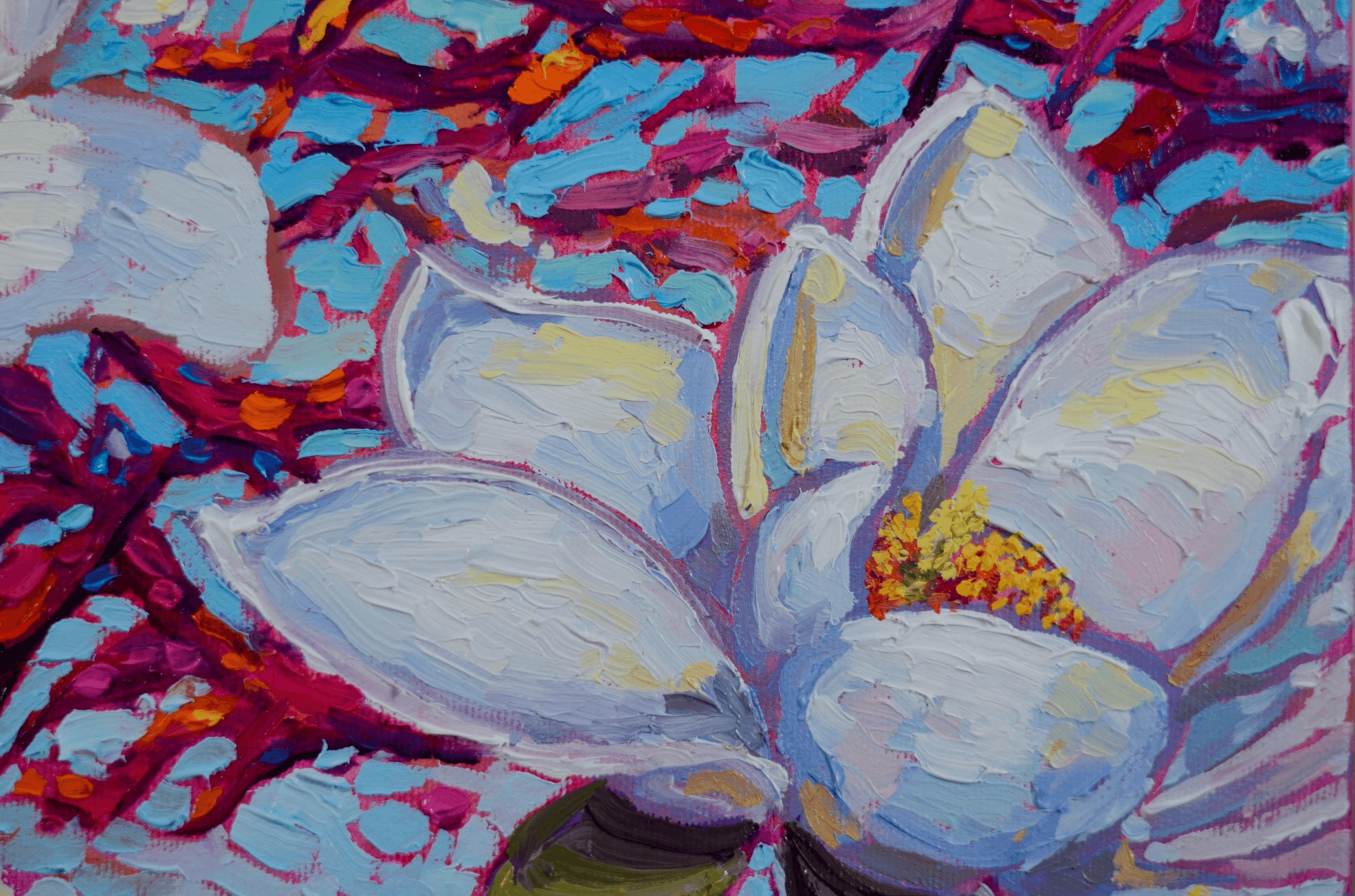 "Celestine" portrays a couple of freshly opened, white magnolias perched forever on their supportive branches. Their beauty and fragility are enhanced by the vivid pinks, oranges and fuchsias of the branches as well as a vibrant, gradient blue background.