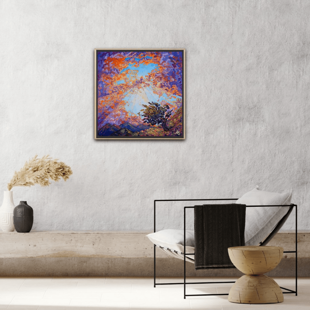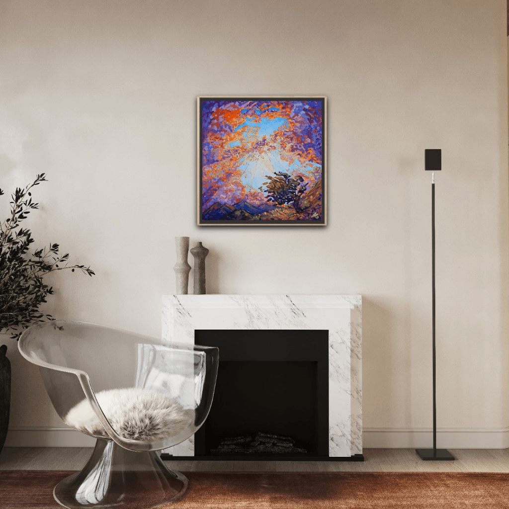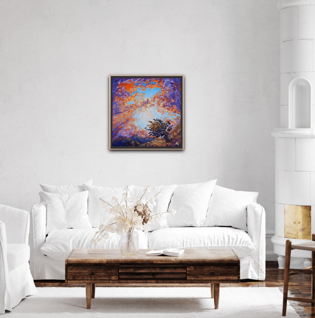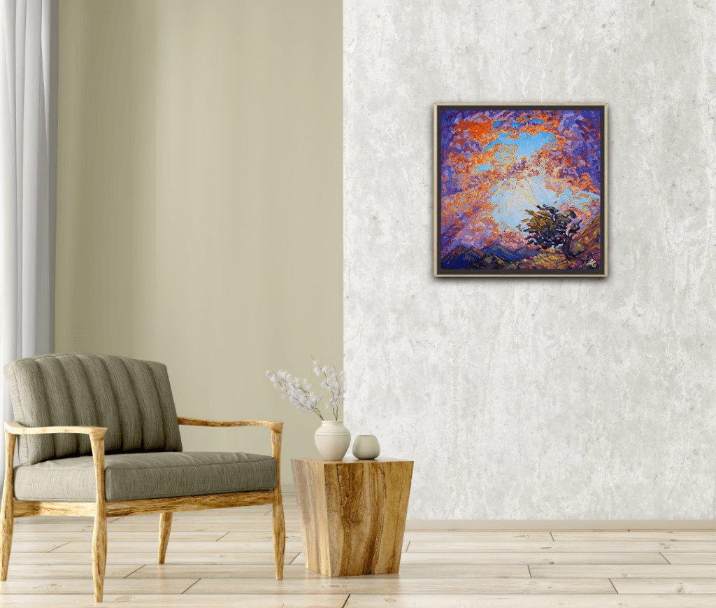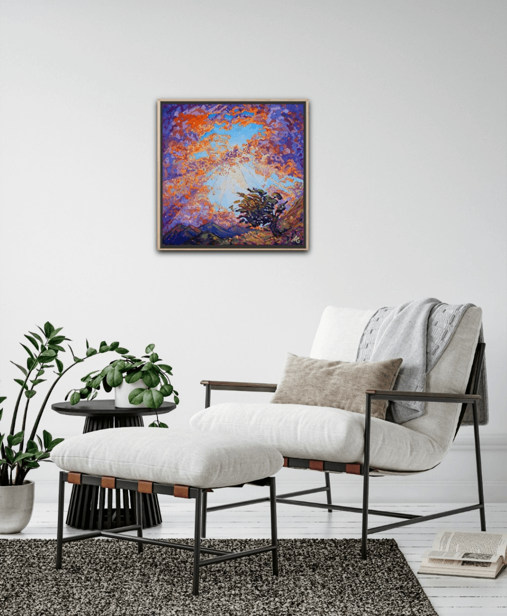 "CORONATION" is a grandiose and dramatic depiction of what sunbeams and clouds can do to a majestic tree that seems to be sitting on top of the world. The opening in the clouds to let the light shine through look like a crown about to be placed on the tree whose branches seem to be yearning for it and beckoning it to get closer. This painting was created with my love of trees, mountains and dramatic skies in mind. I couldn't be more pleased with how it came out.