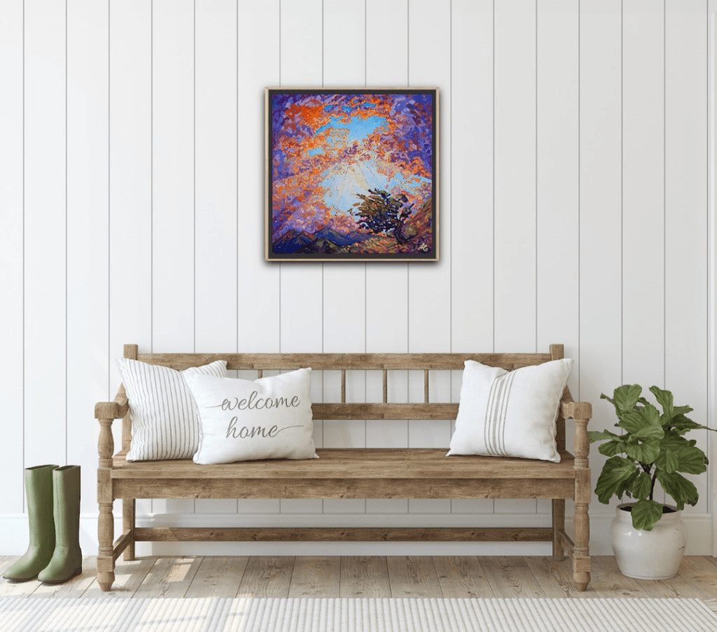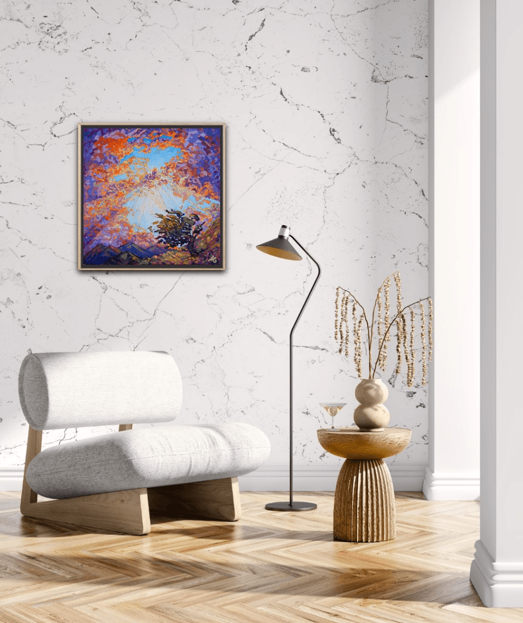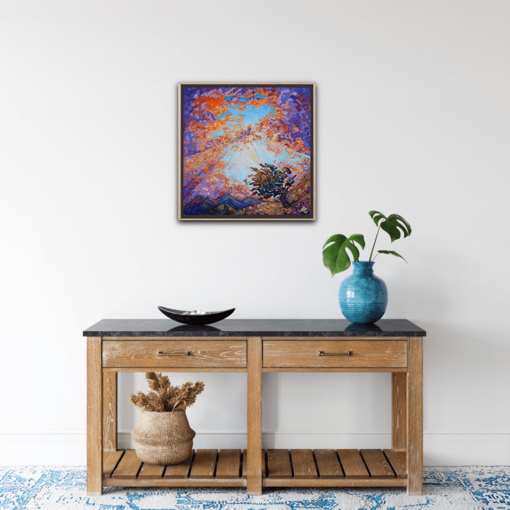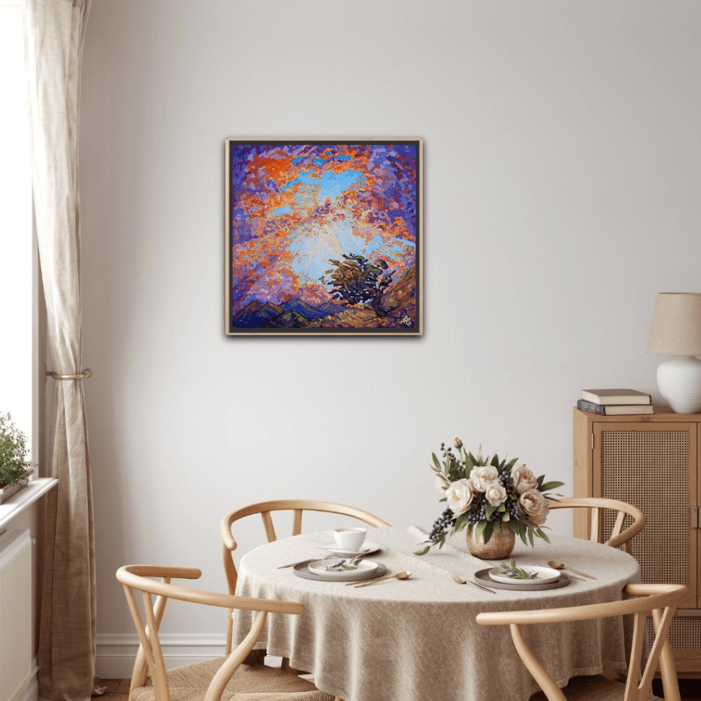 "CORONATION" is a grandiose and dramatic depiction of what sunbeams and clouds can do to a majestic tree that seems to be sitting on top of the world. The opening in the clouds to let the light shine through look like a crown about to be placed on the tree whose branches seem to be yearning for it and beckoning it to get closer. This painting was created with my love of trees, mountains and dramatic skies in mind. I couldn't be more pleased with how it came out.