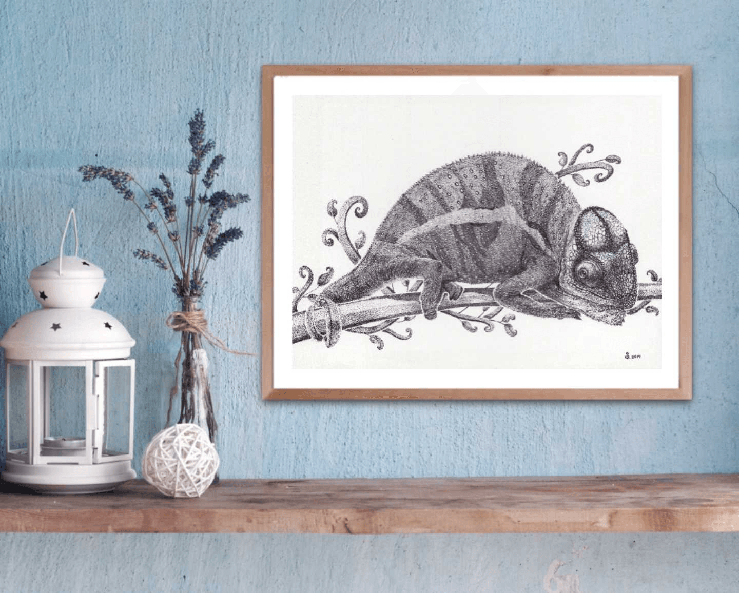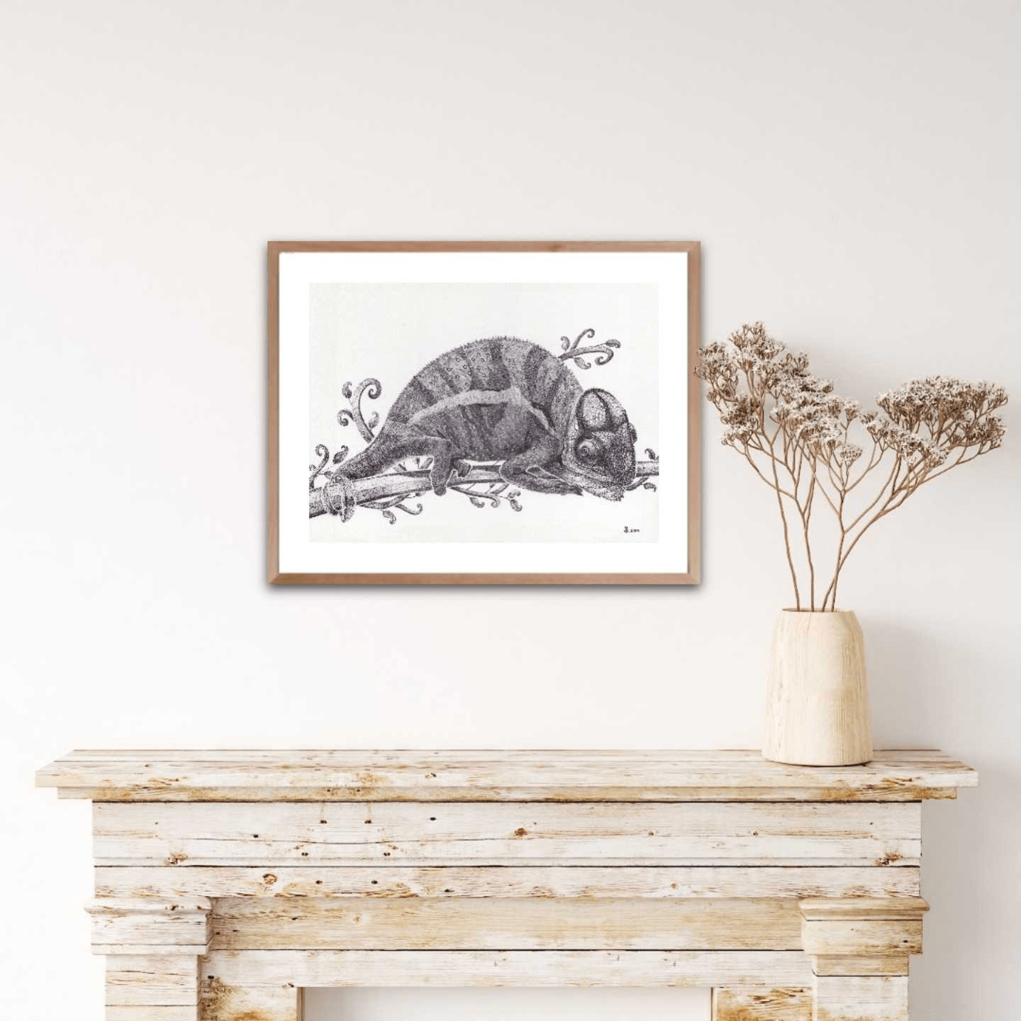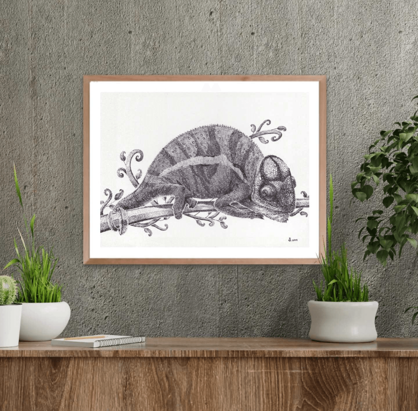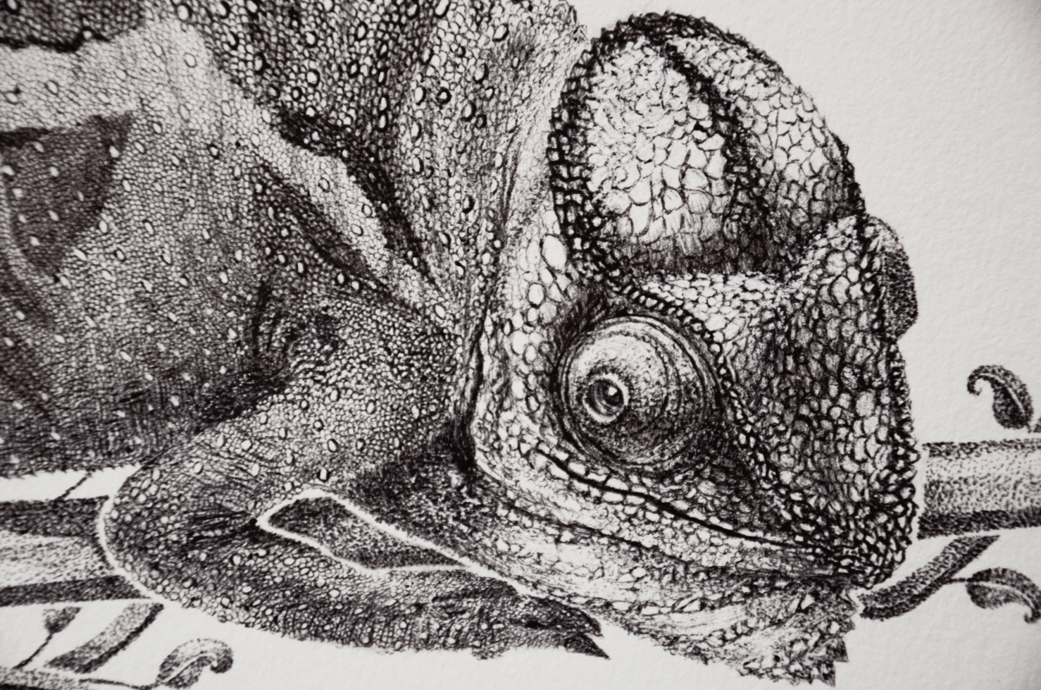 It might not be showing its mesmerizing colors, but this black and white artwork of a chameleon resting on tree branch still displays the beauty of this small creature in all its details.