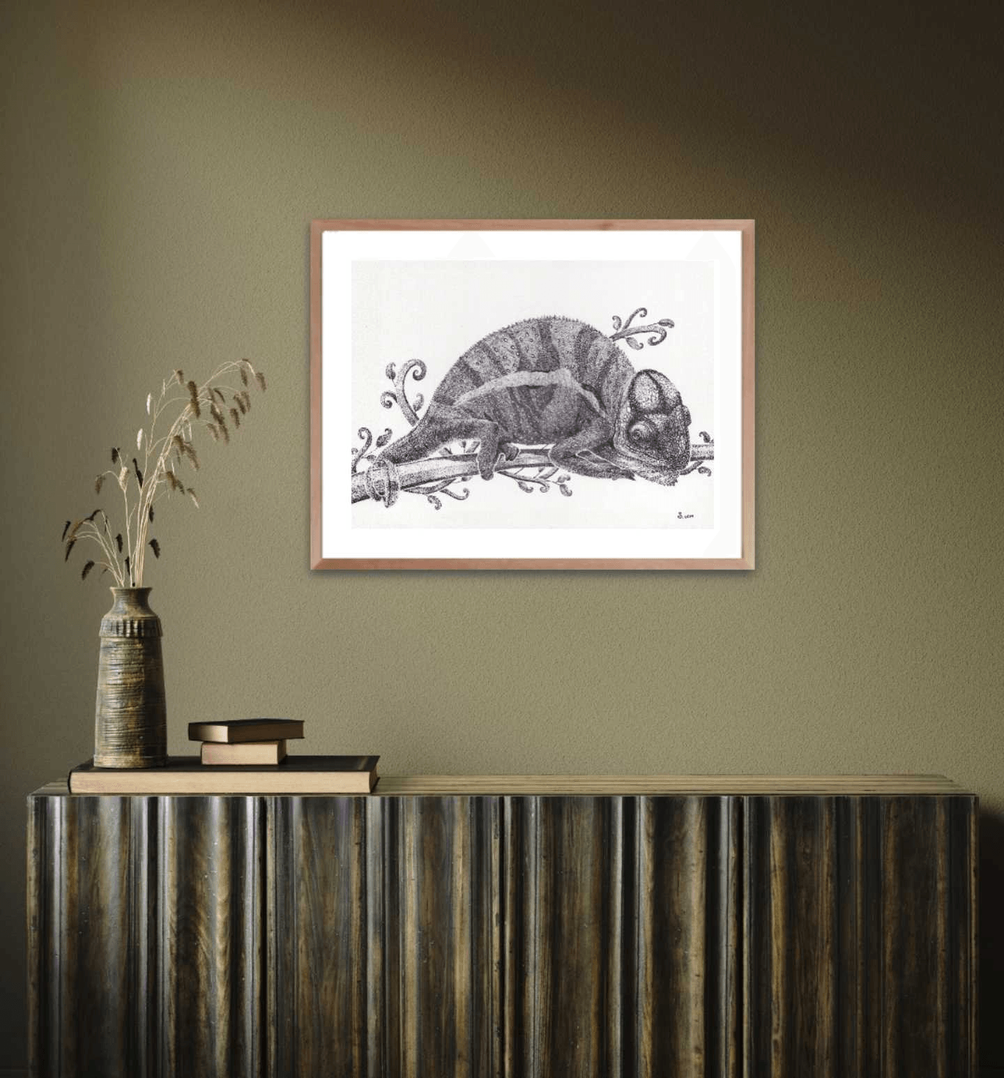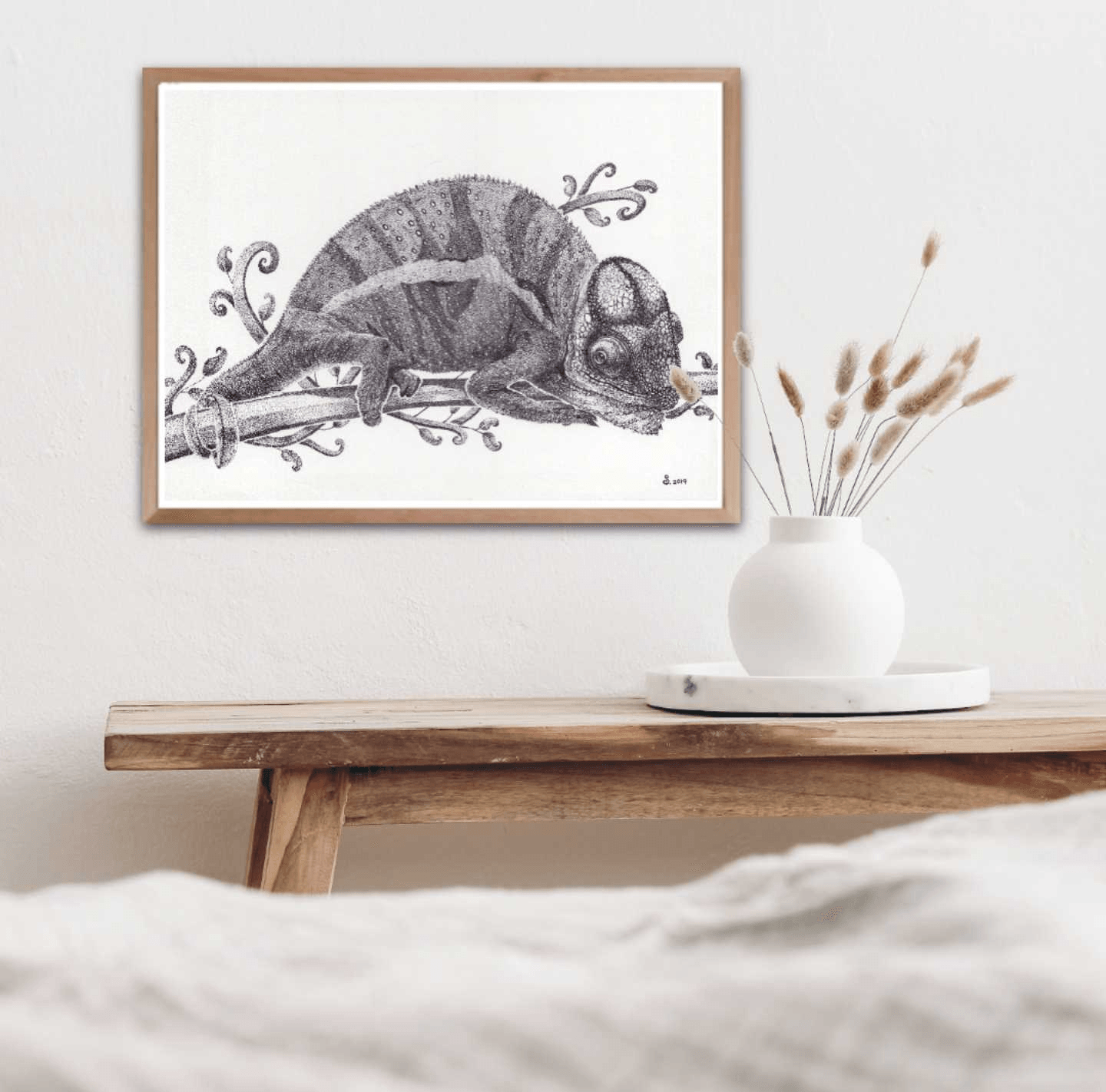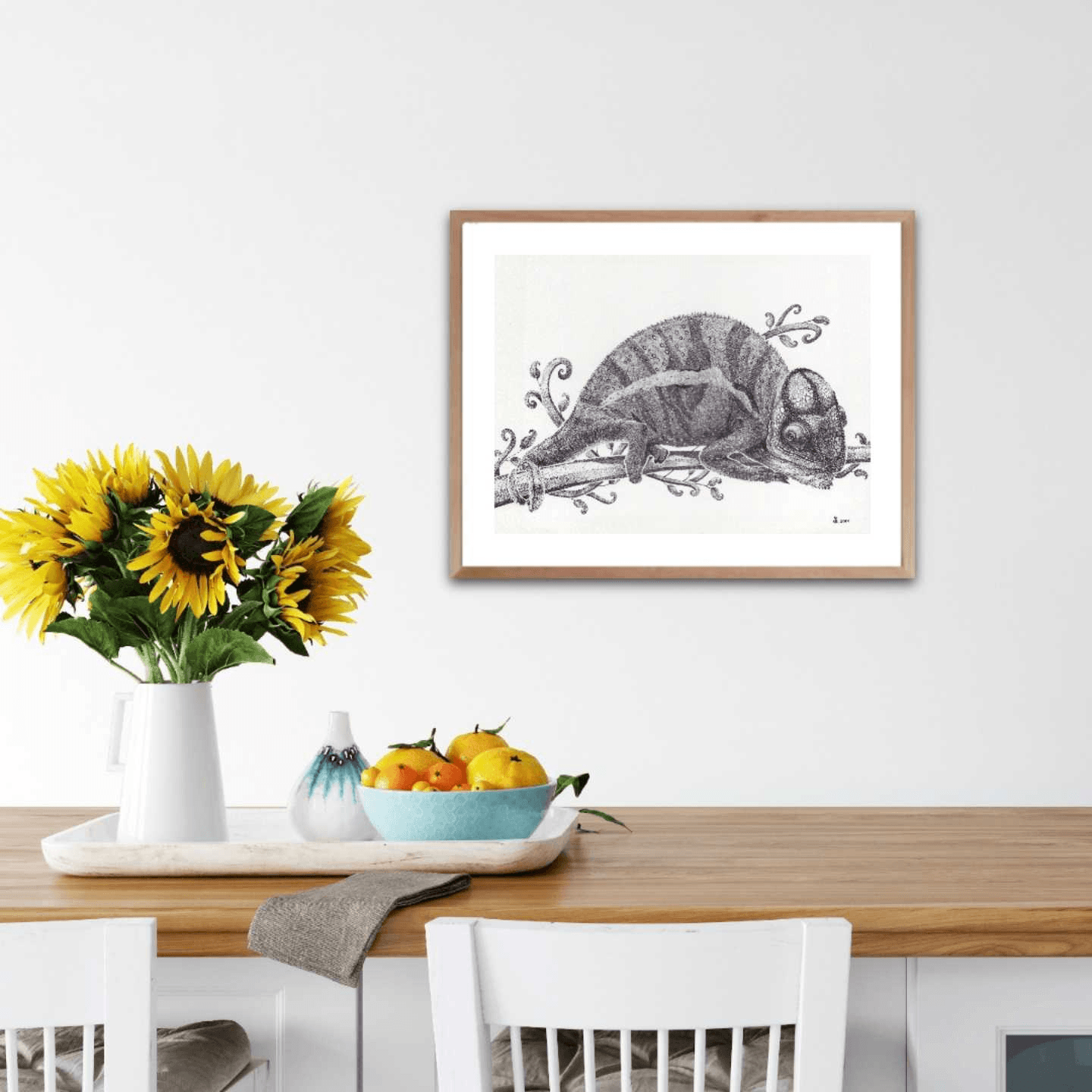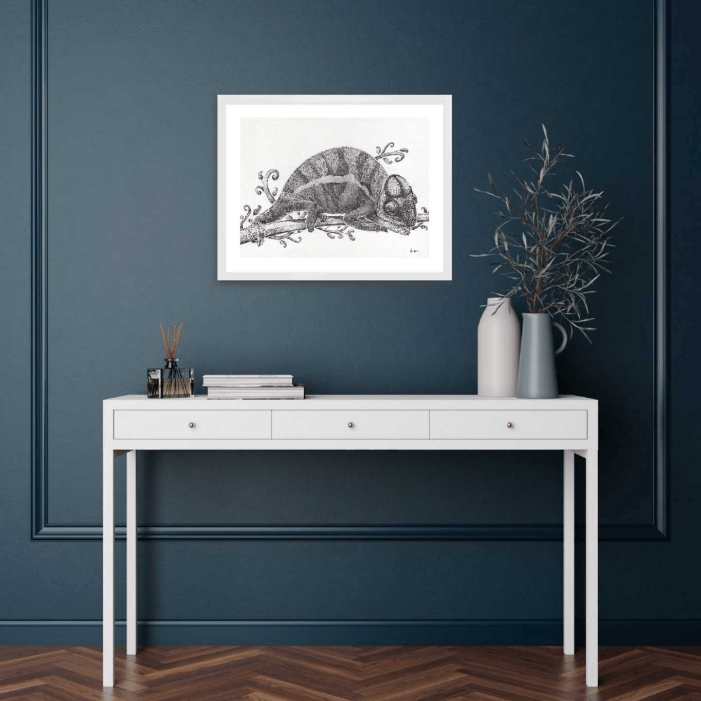 It might not be showing its mesmerizing colors, but this black and white artwork of a chameleon resting on tree branch still displays the beauty of this small creature in all its details.