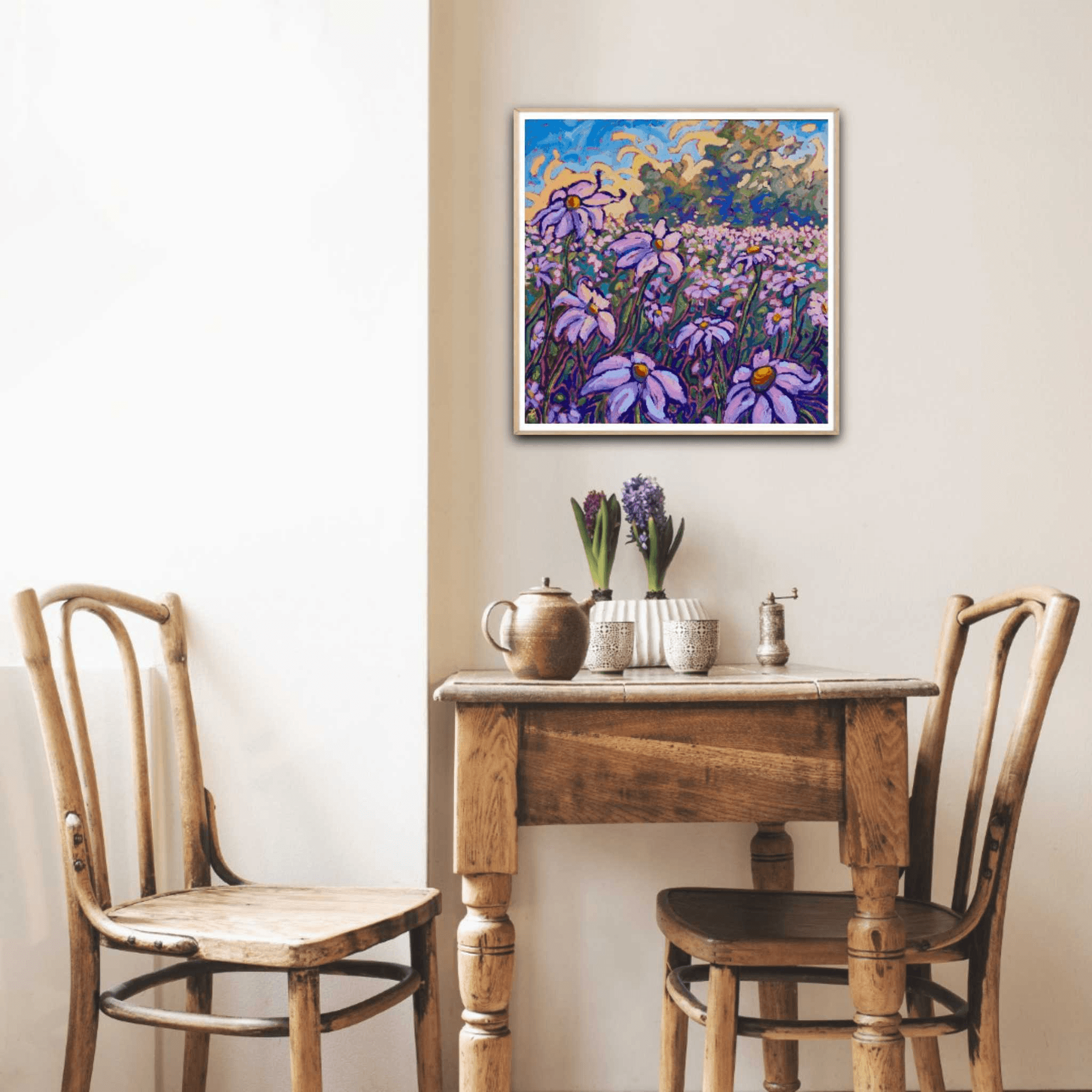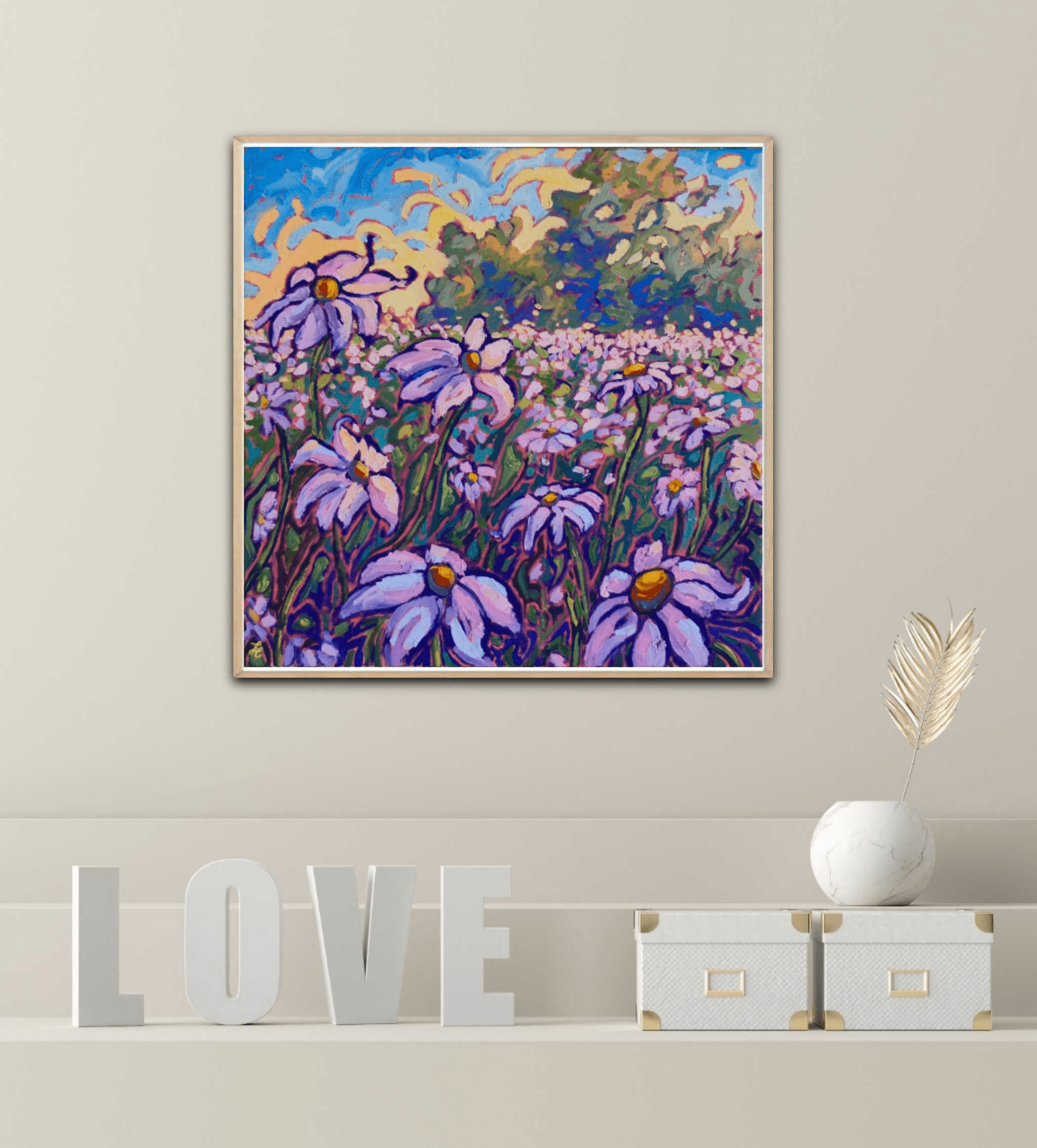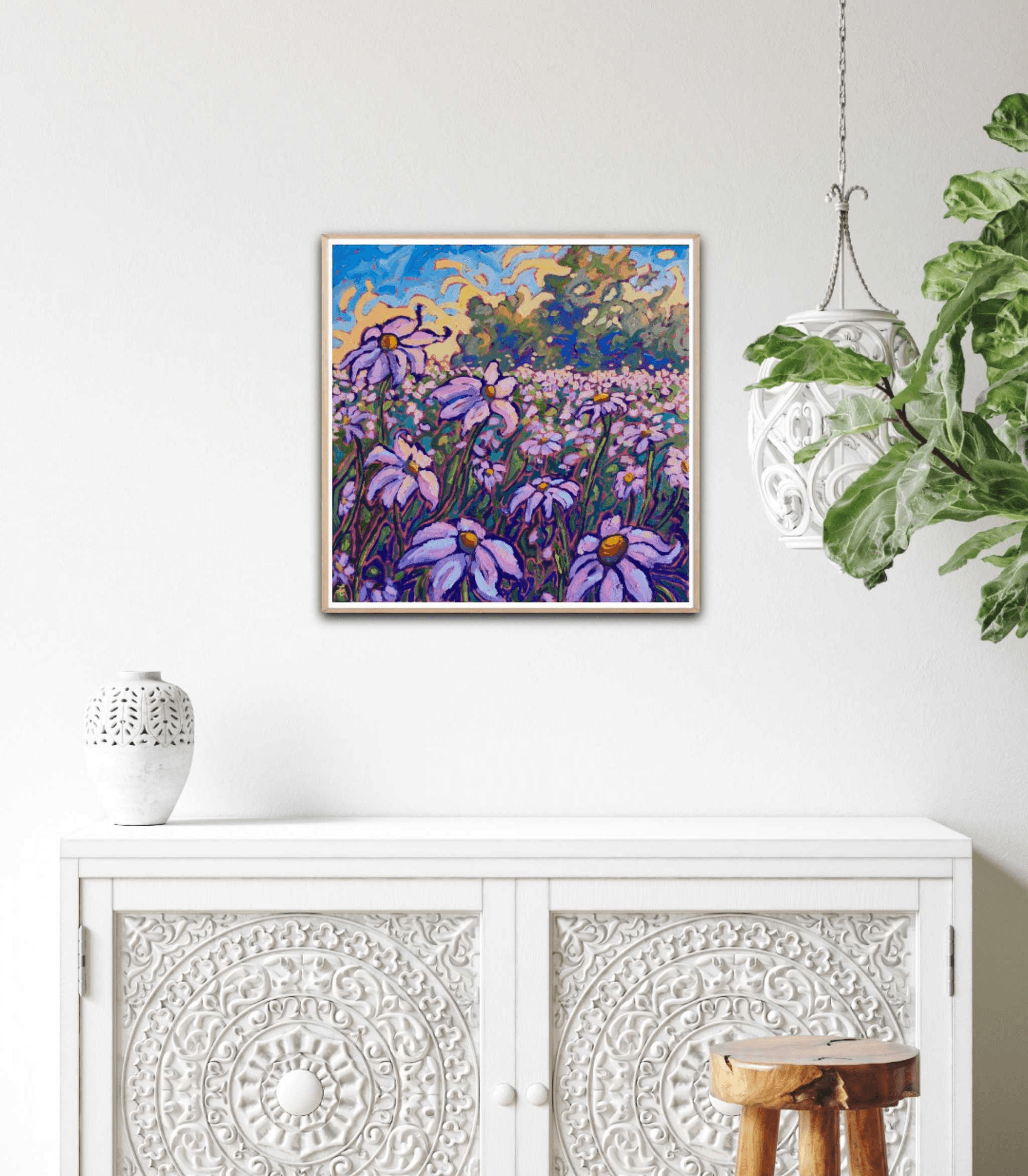 Wild daisies in a field as the setting sun caresses their soft petals one last time before the moon appears. This painting is my attempt to bring the feeling of the warm sun rays on your skin or the light touch of flowers as you walk through a green, lush meadow.