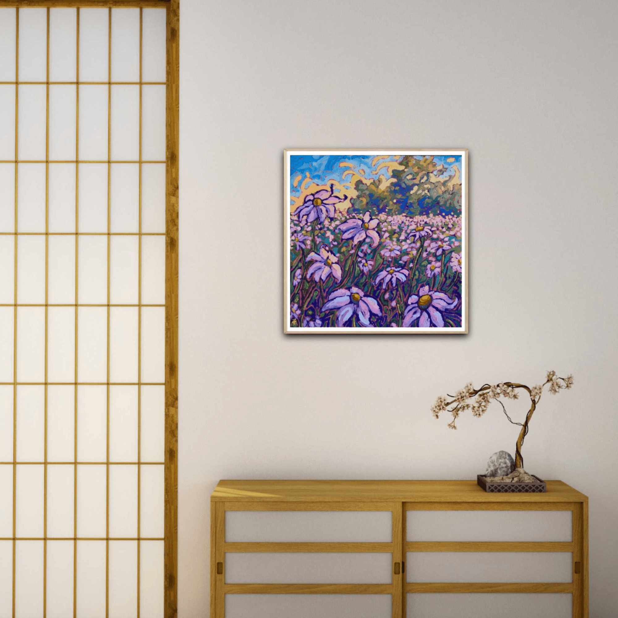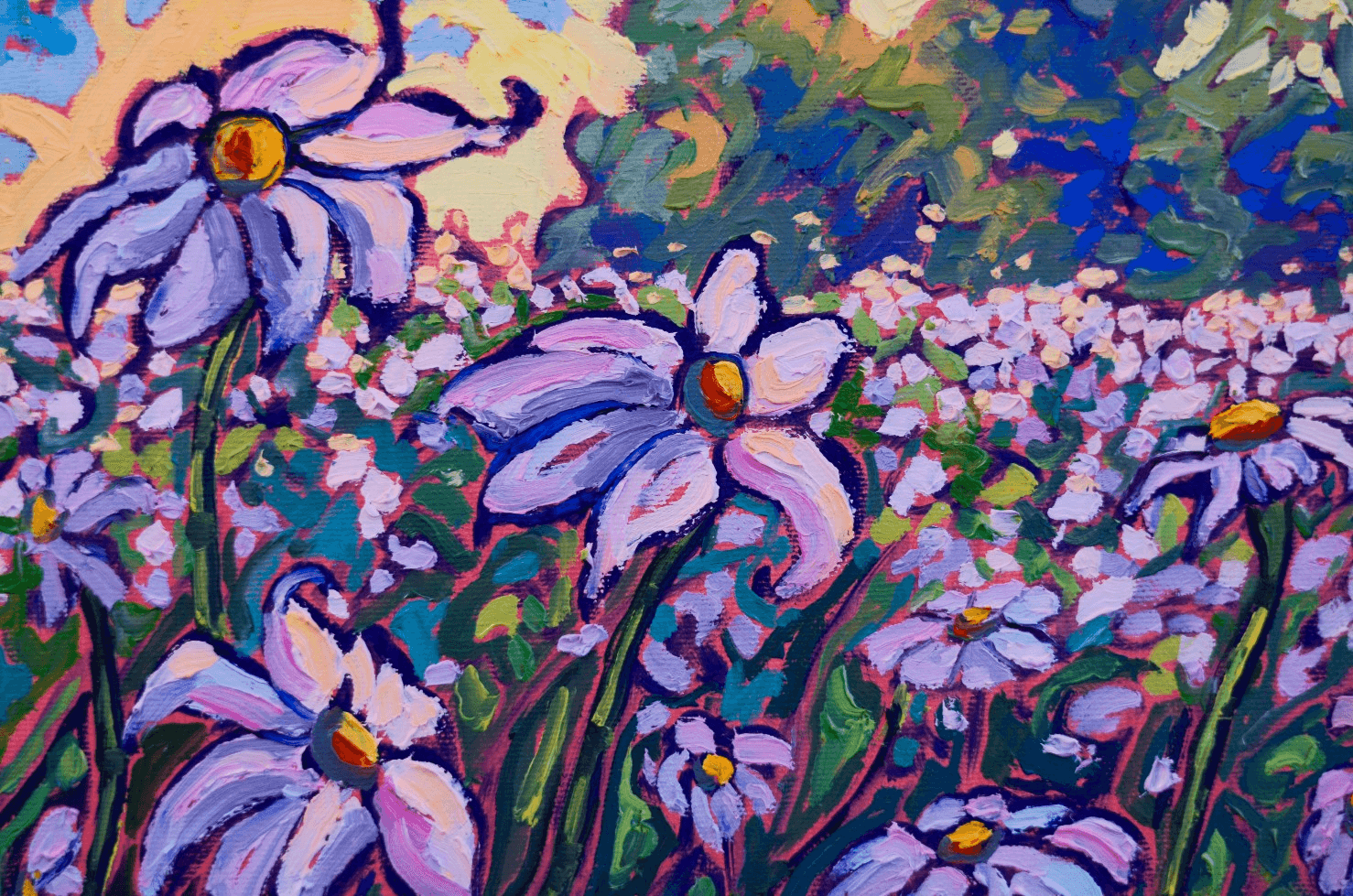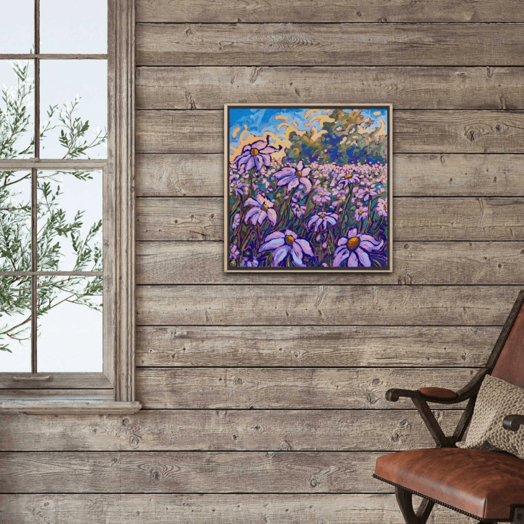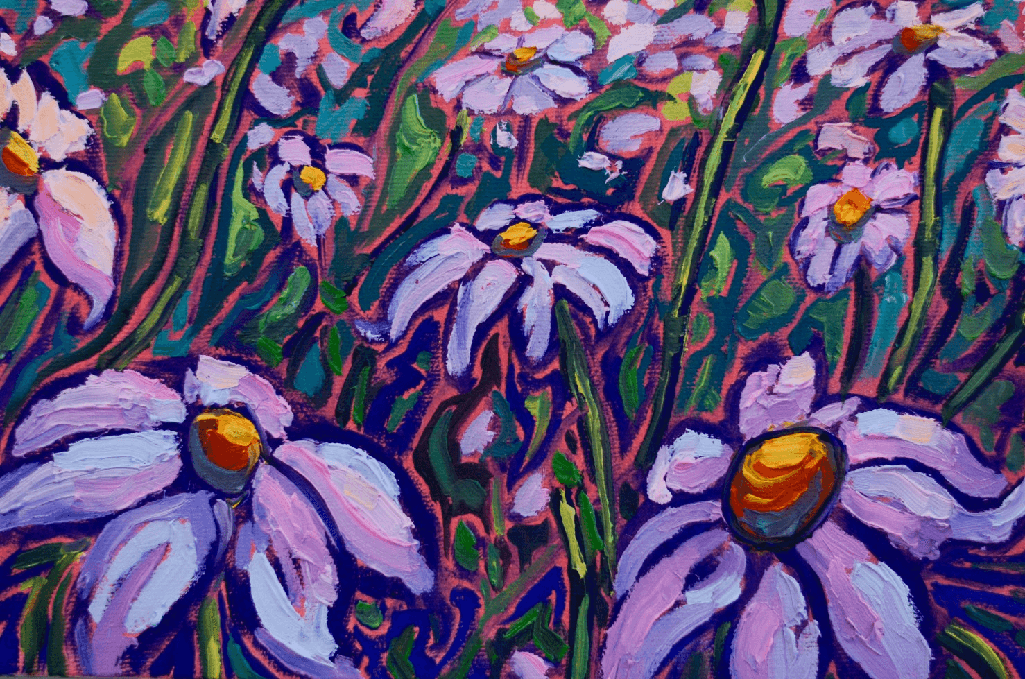 Wild daisies in a field as the setting sun caresses their soft petals one last time before the moon appears. This painting is my attempt to bring the ...