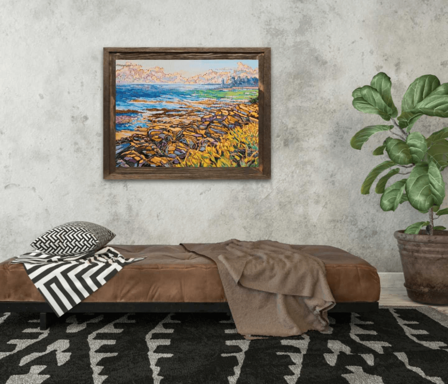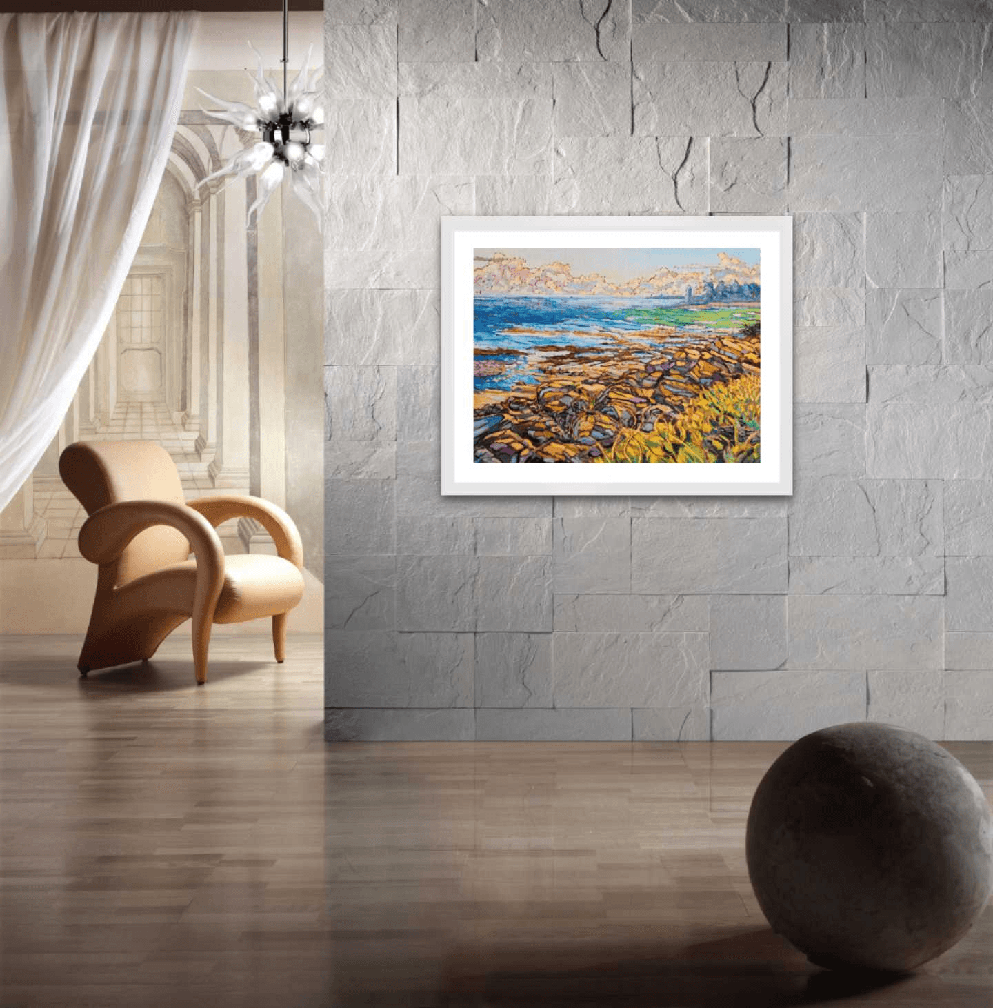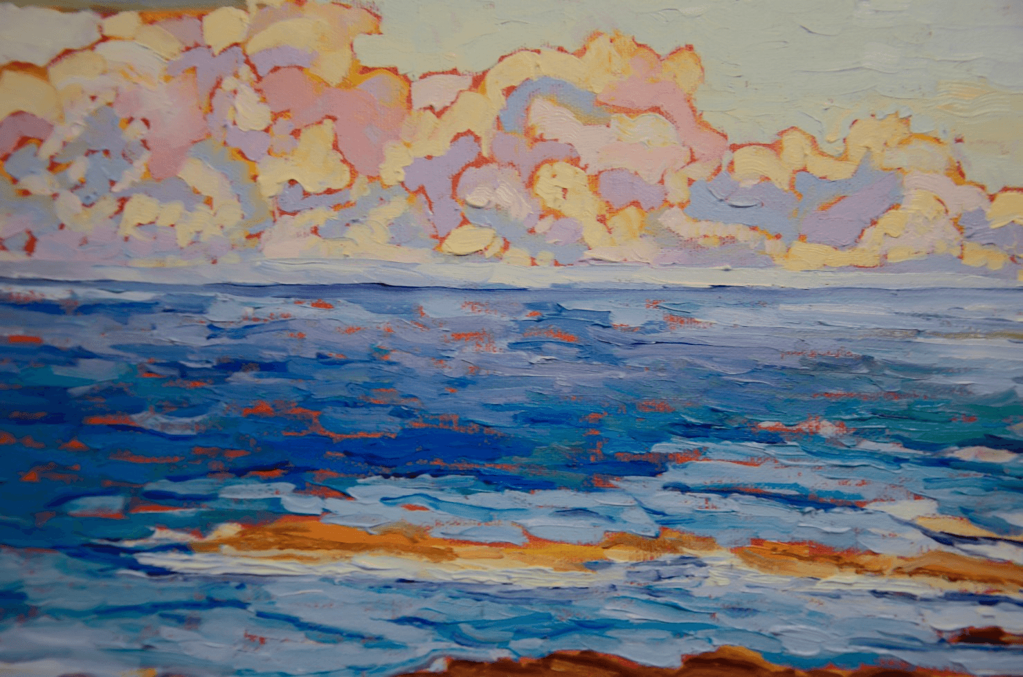 After crossing the long Confederation Bridge from New Brunswick to Prince Edward Island, this scene of rocky shores and lighthouses in the distance is the first landscape that appears to you once you set foot on the island. It was a very special moment for me since I have always wanted to visit this island and revel in its lush views of red sand and blue skies. And as with most special moments, I decided to put it on canvas, drawing emphasis to its shores and multitude of lighthouses strewn on almost every cliff overlooking the ocean.
