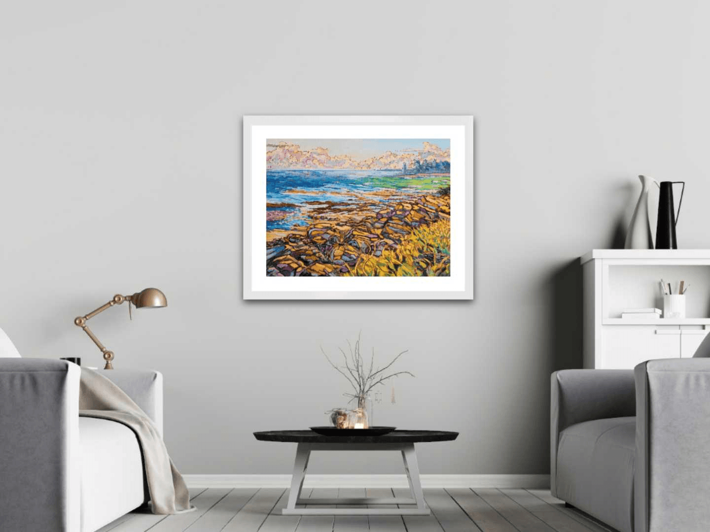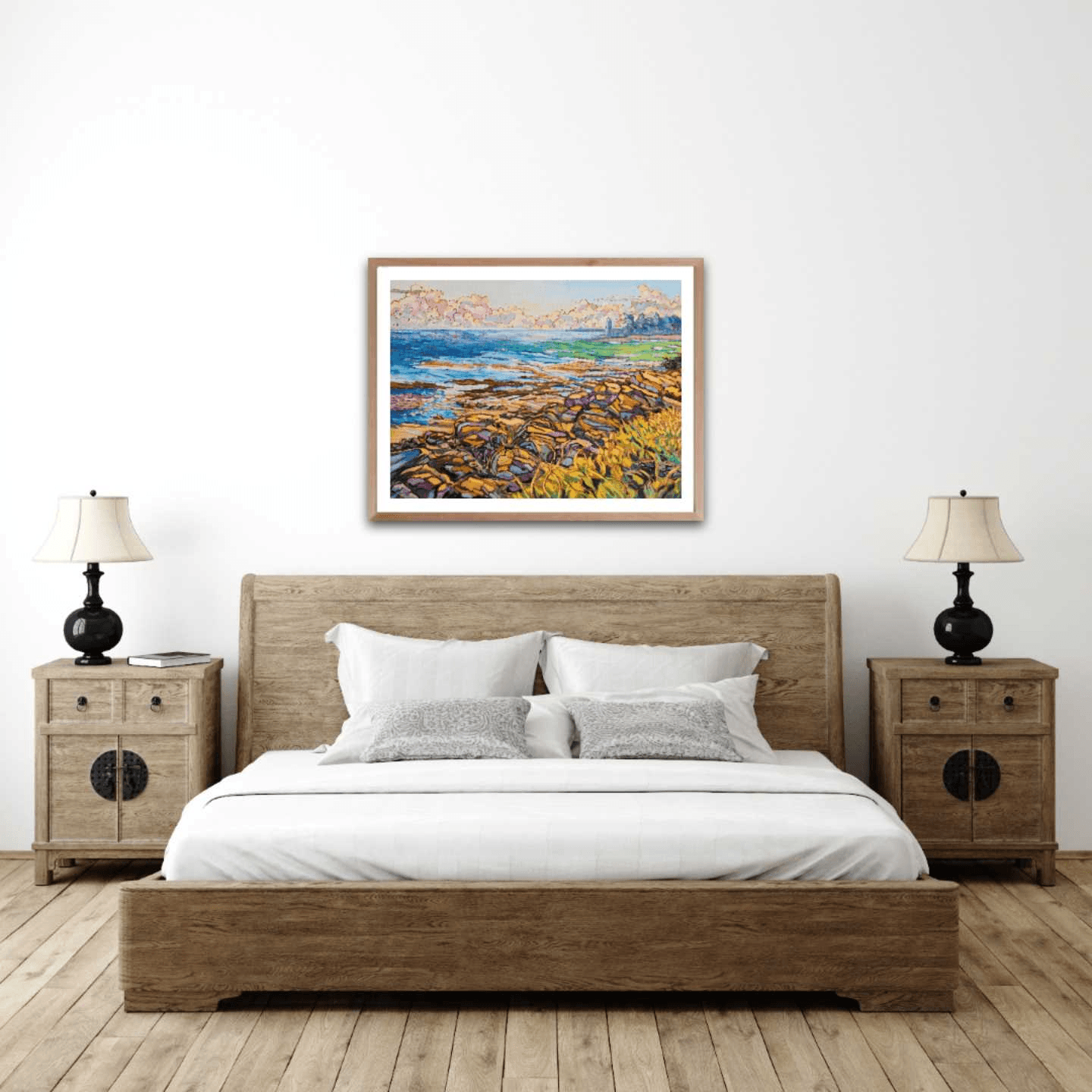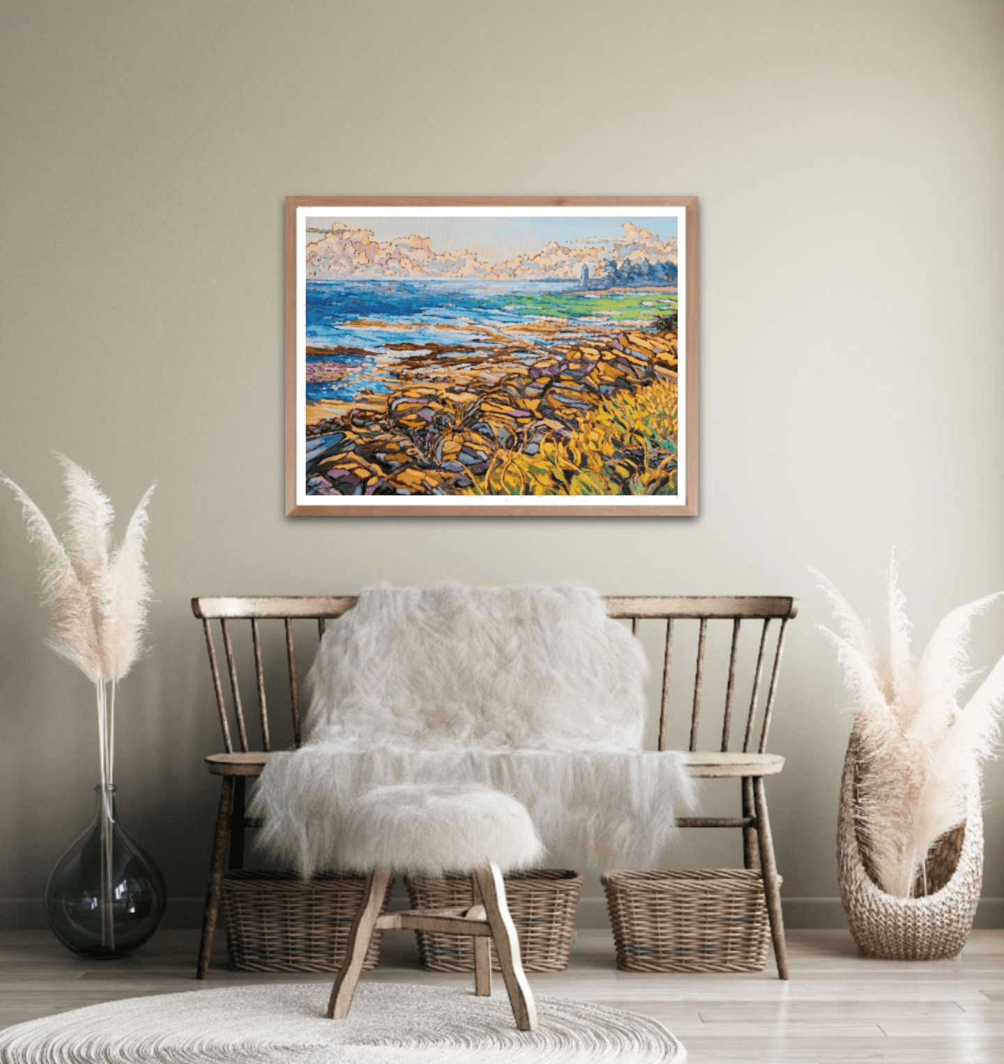After crossing the long Confederation Bridge from New Brunswick to Prince Edward Island, this scene of rocky shores and lighthouses in the distance is the first landscape that appears to you once you set foot on the island. It was a very special moment for me since I have always wanted to visit this island and revel in its lush views of red sand and blue skies. And as with most special moments, I decided to put it on canvas, drawing emphasis to its shores and multitude of lighthouses strewn on almost every cliff overlooking the ocean.