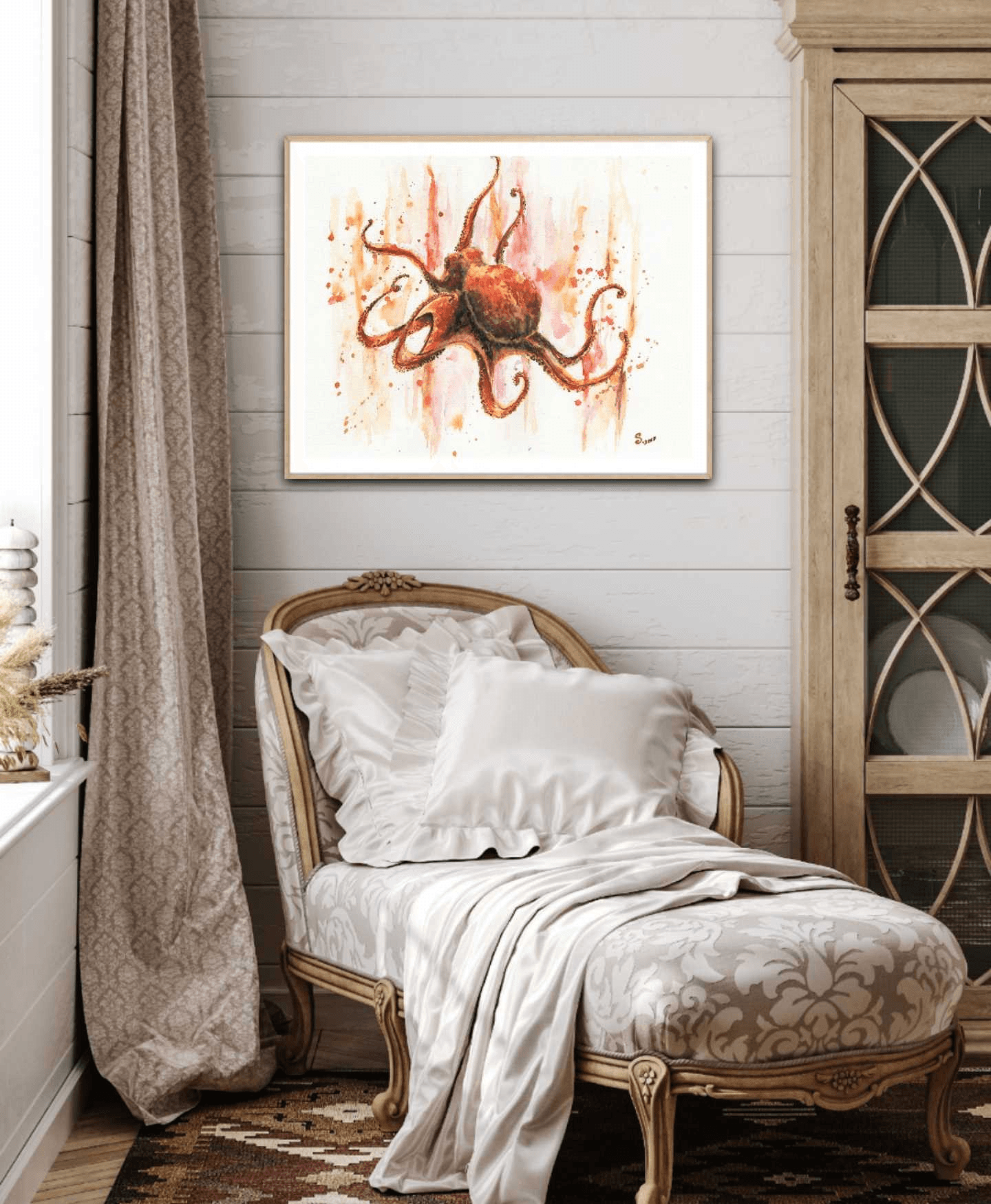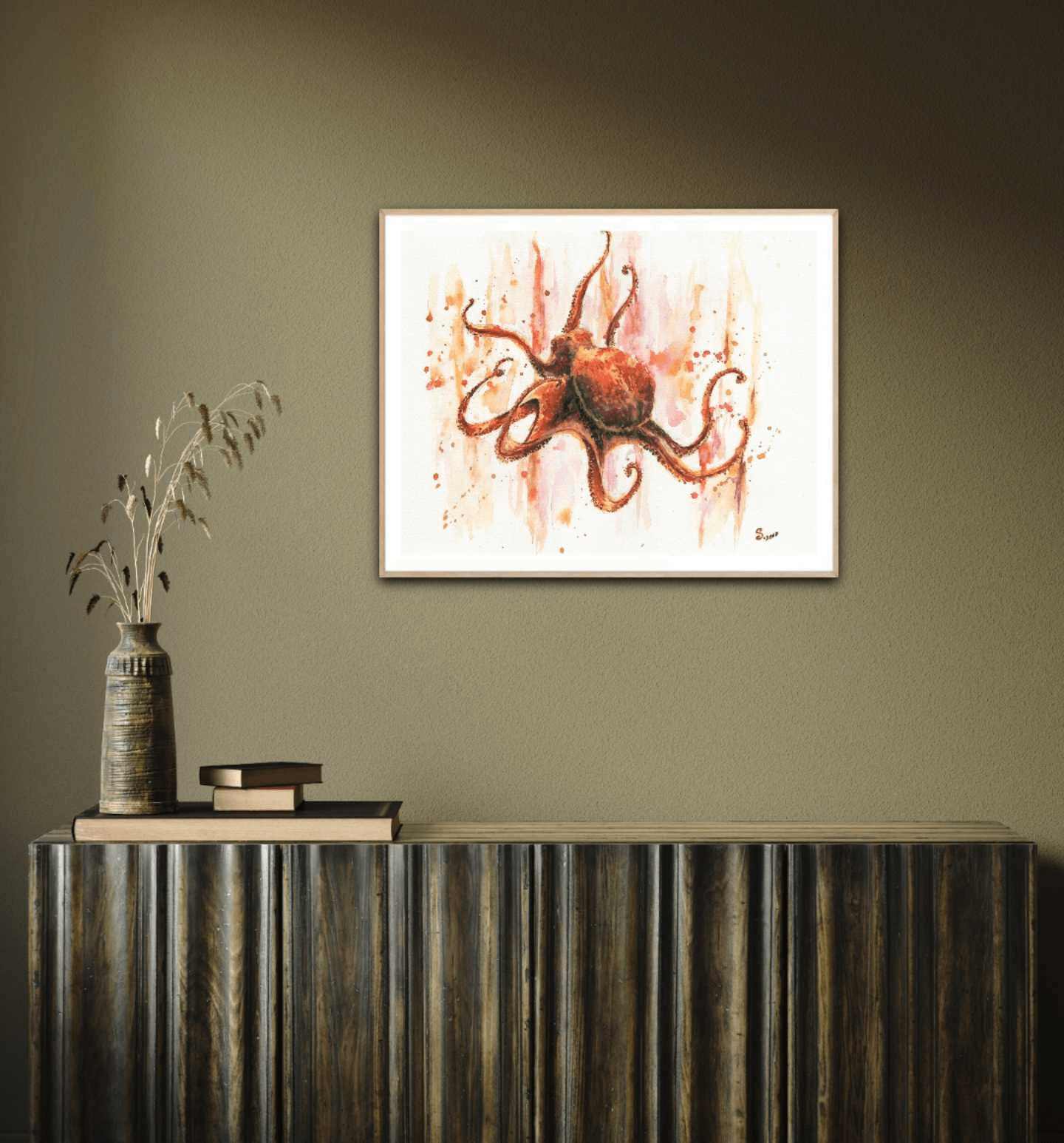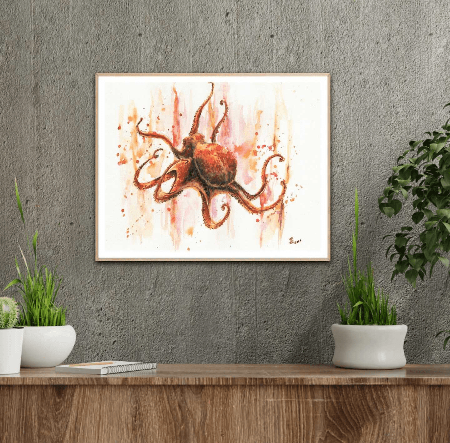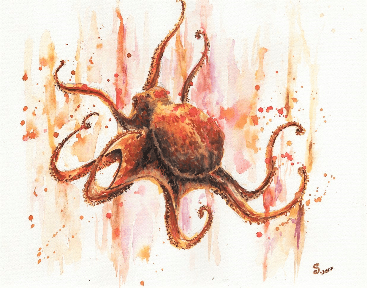 A watercolor painting of a beautiful octopus in motion. His movement is displayed in a way as to show elegance and lightness but also power and streng...