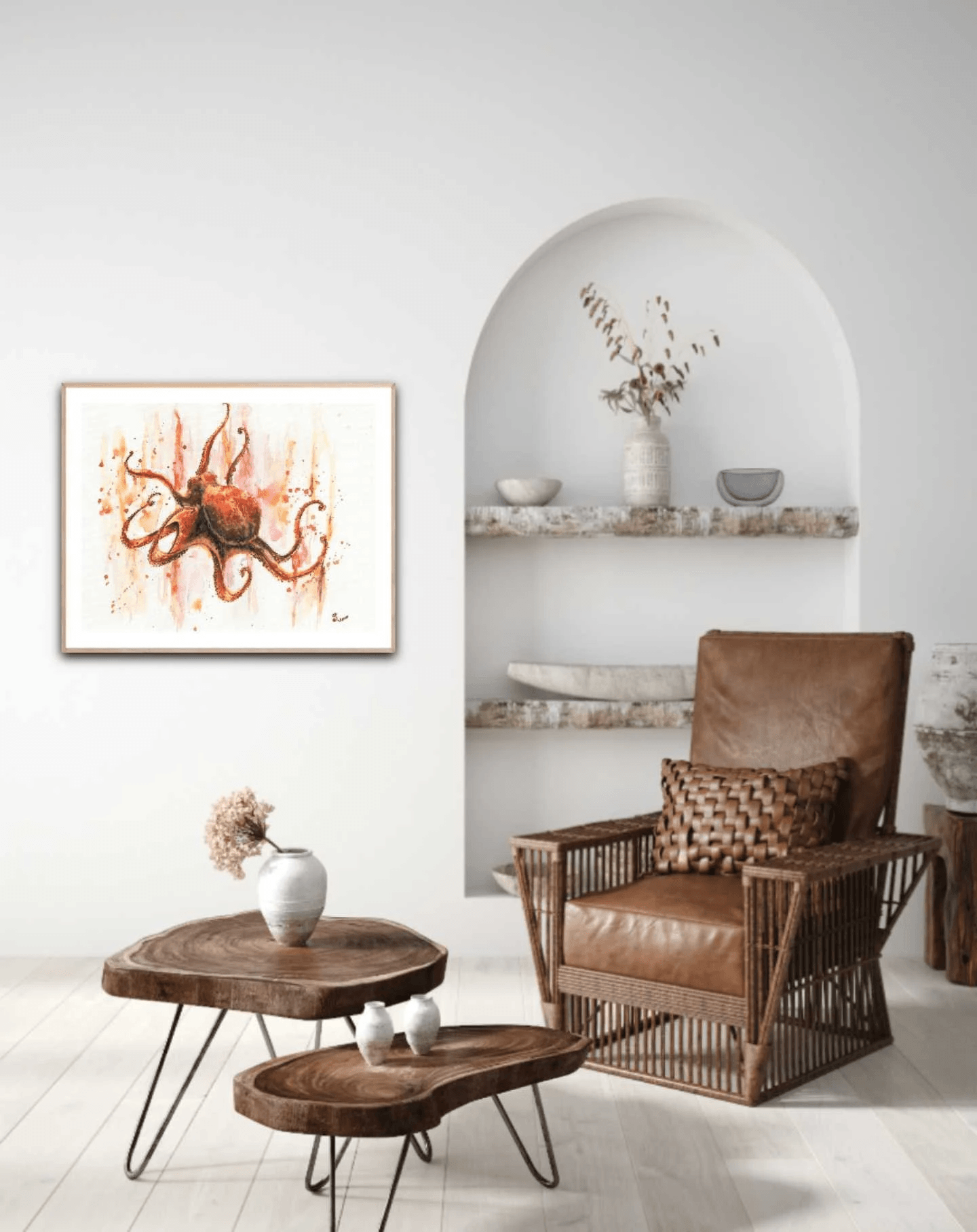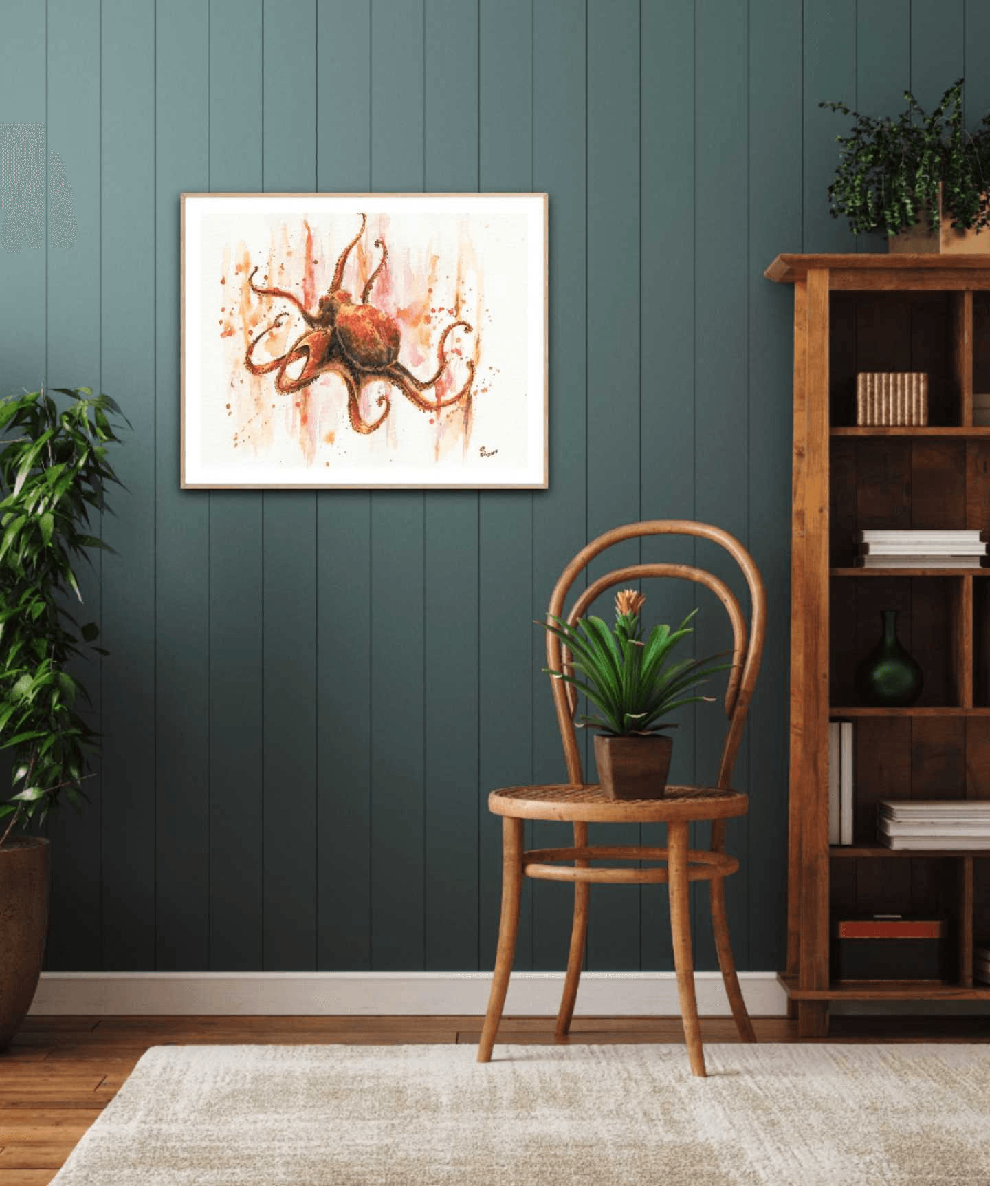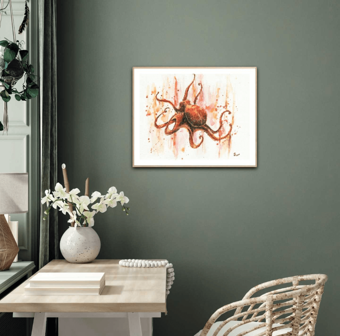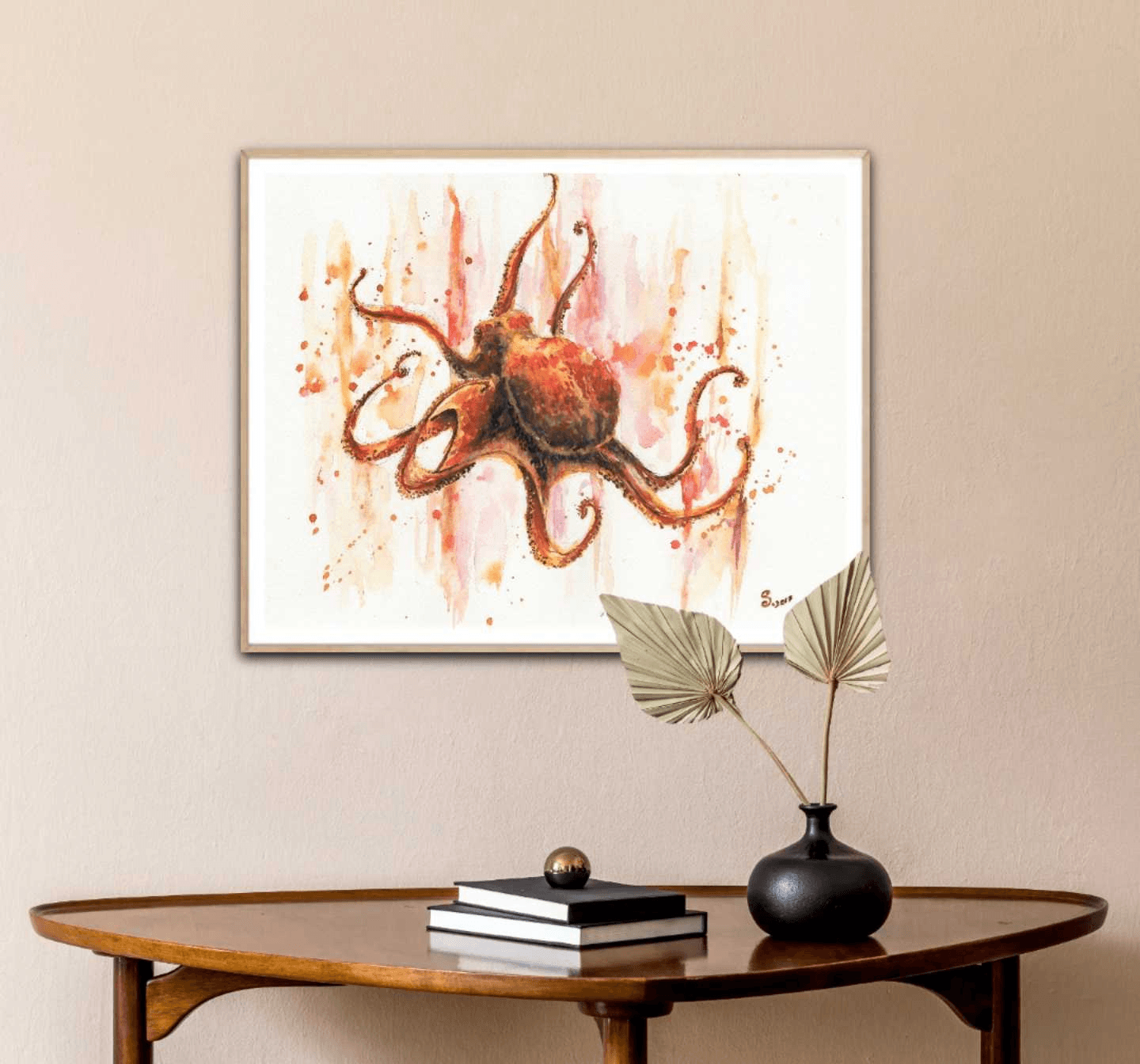A watercolor painting of a beautiful octopus in motion. His movement is displayed in a way as to show elegance and lightness but also power and streng...