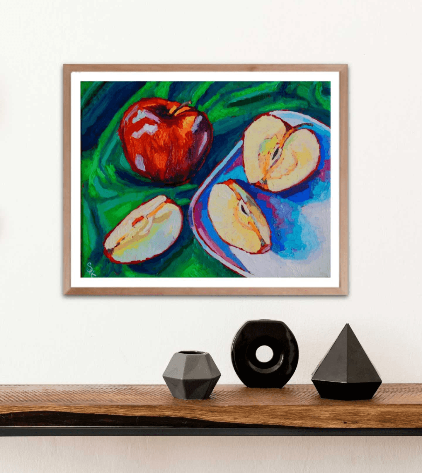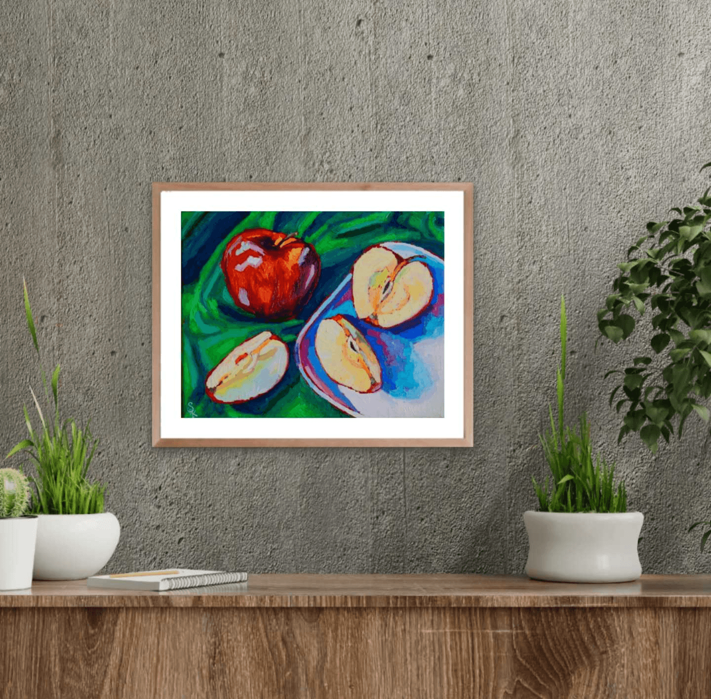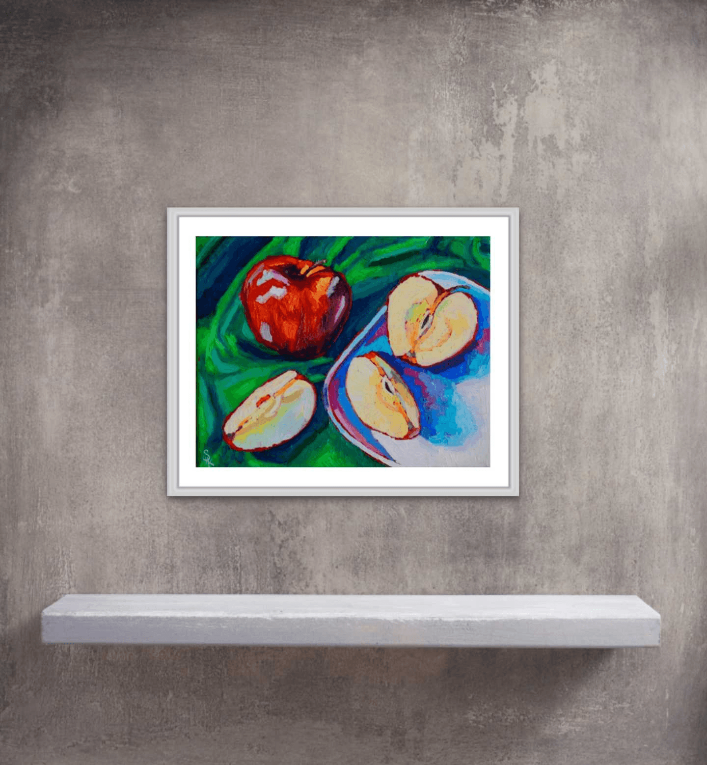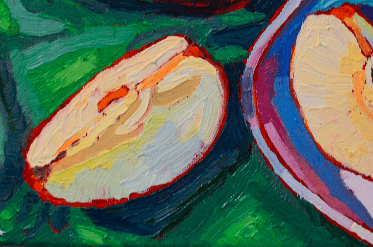 Lovely little painting depicting a still life that consists of apple slices and fruit against a vibrant background of green and white. The play of colors in the shadows add a unique and fresh quality to the whole. Brushstrokes are thick and prominent creating a textured effect over the canvas.