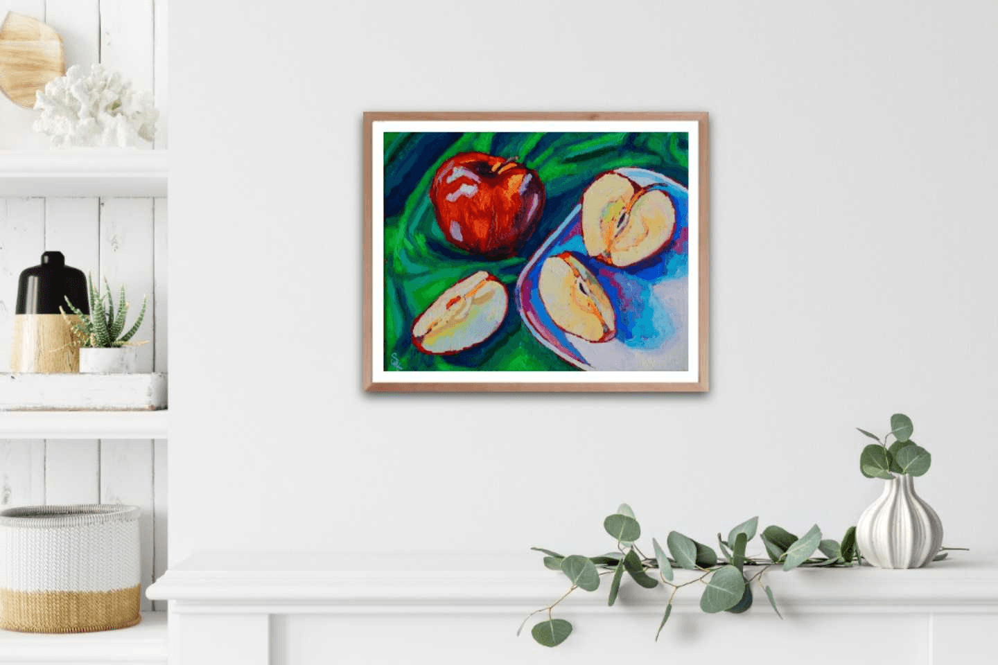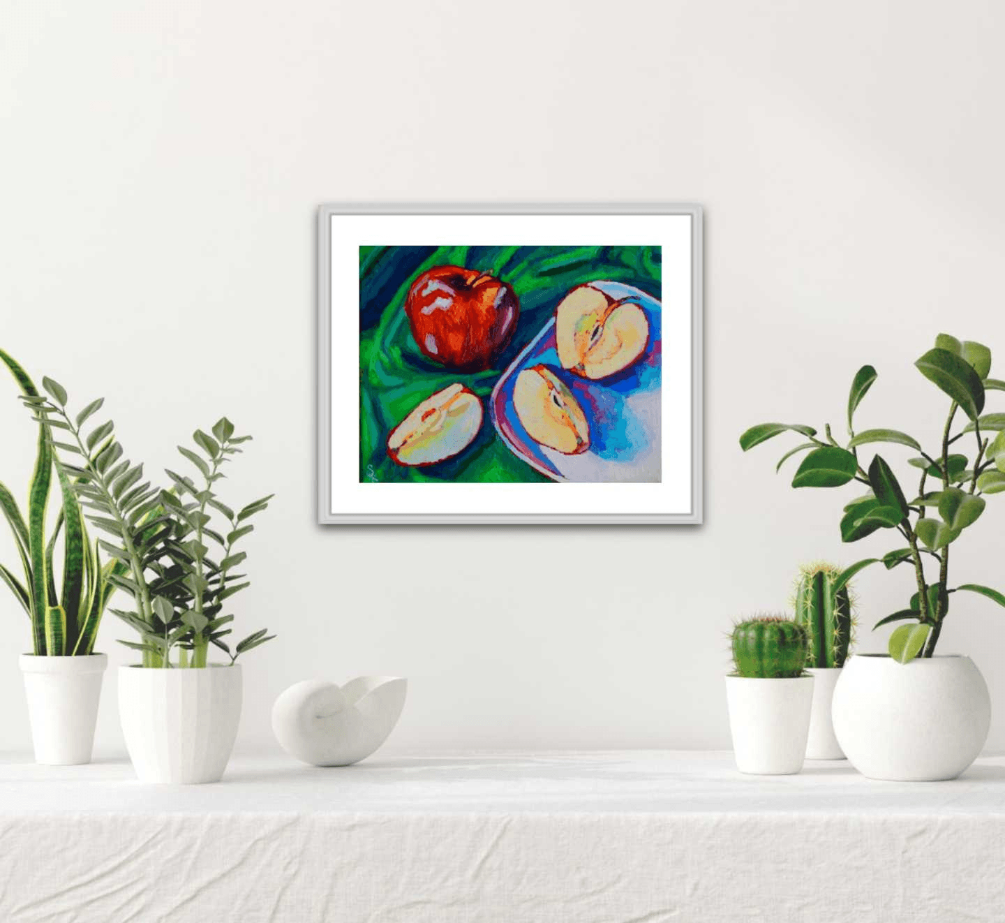 Lovely little painting depicting a still life that consists of apple slices and fruit against a vibrant background of green and white. The play of col...