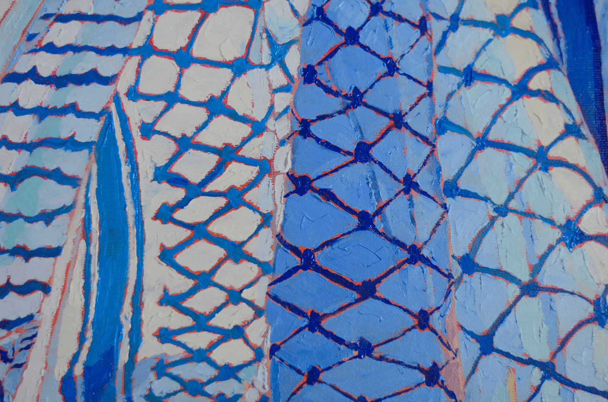 Where I was born and grew up as a kid, my family and I would go on trips to the mountains to forage for wild thyme, be around nature, see some relatives and visit old monasteries and churches. Along the way we would stop on farms to collect some fresh milk or country style cheese. The farmers would always greet us warmly and invite us for cool drinks under the shade of their high vines ornamented with big clusters of juicy grapes. Being out all day in the sun, these farmers usually wore traditional light airy clothes consisting of a cotton, button-down shirt, sometimes layered with an embroidered gilet and a belted sherwel (traditional loose trousers) and always had their white kaffiyeh on their head secured with one or two black hoops. Most of them if not all had long mustaches that stretched all the way to their ears, tucked safely behind them. They took pride in their length and whenever they were enjoying a moment of quiet, their fingers would always reach to their upper lip and absently comb their hairs. Their love of their land, animals and trees would show through their joy in the simple things, their desire to share earth's treasures and their hospitality and warmth towards everyone. Seeing the different types and colors of kaffiyehs now being worn by everyone young and old, from all corners of the world brings back these childhood memories and makes me realize how there is always a little piece of home in each and every person around us.In light of this, I created this painting.