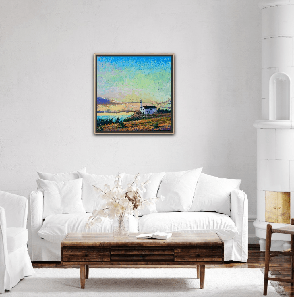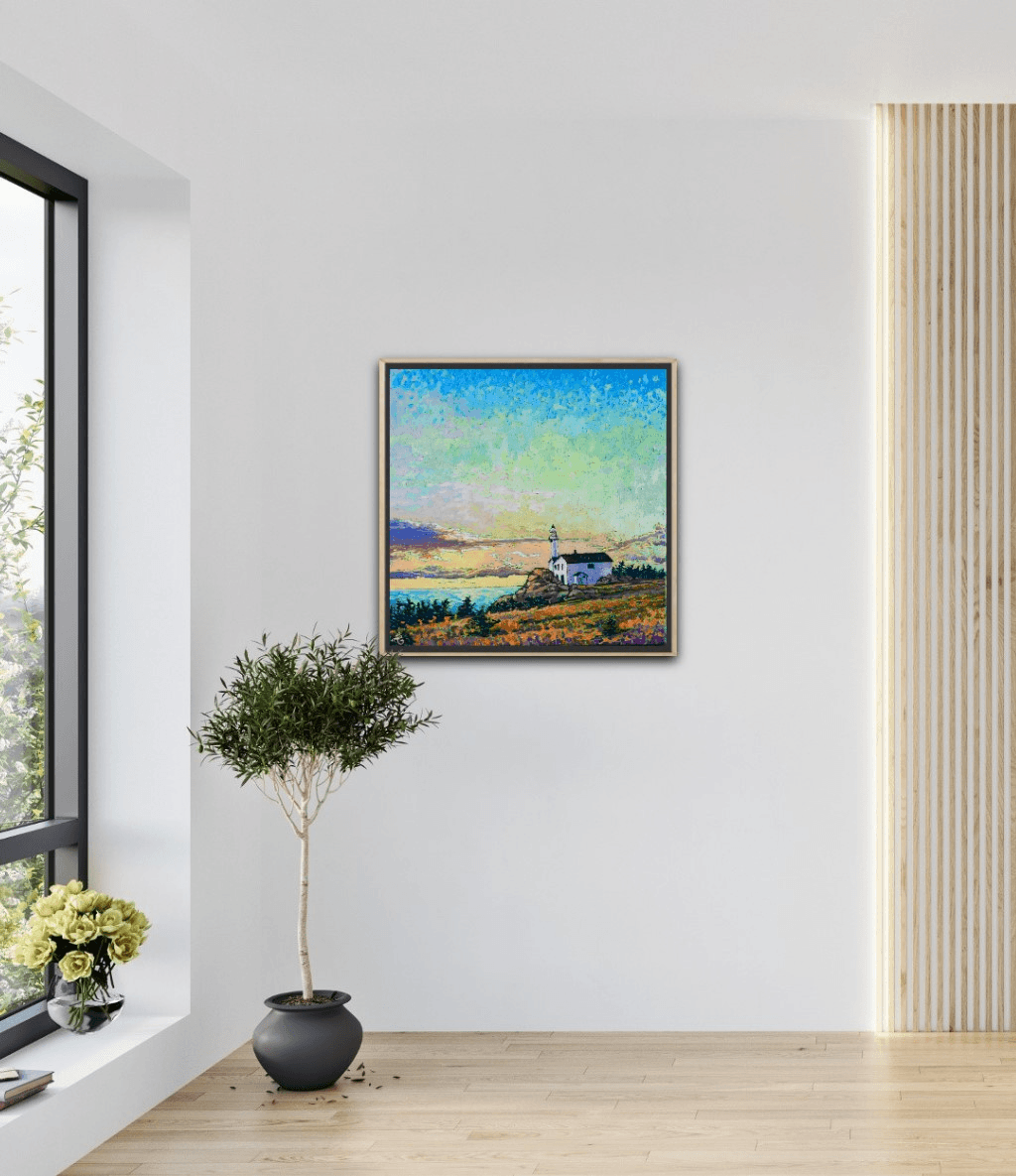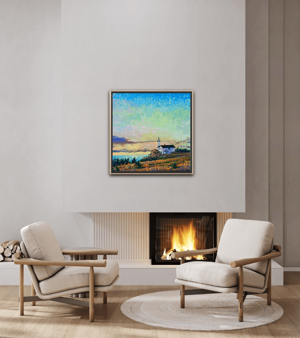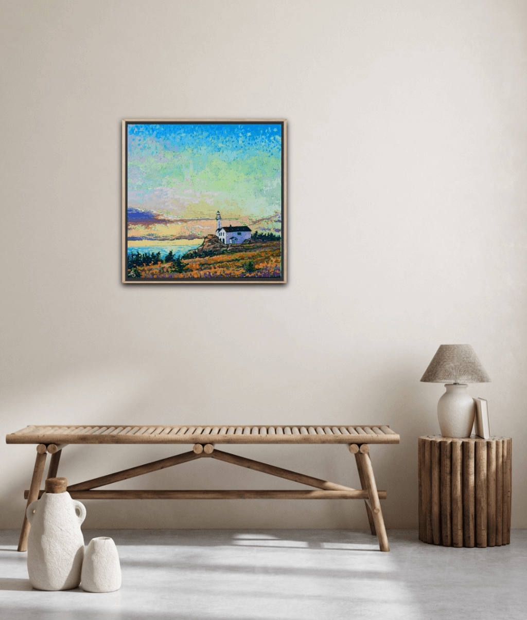 "Karakand" is a nostalgic, memory based manifestation of what a slow summer evening around Lobster Cove Lighthouse would look like. The beautiful contrast between neutral tones and vivid, bright hues is striking and helps guide the eyes through the scene. It creates a smooth, gliding visual motion from the meadow-like foreground, passing through the stillness of the lighthouse and its adjacent rock, slowly being swept up above the ocean blue, into the horizon of burning clouds and towards the high celestial background.