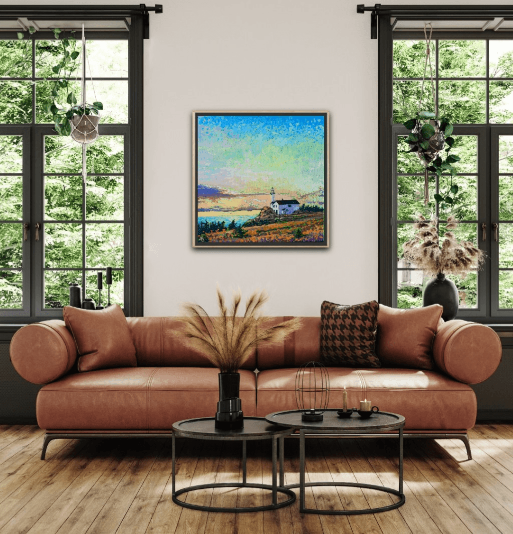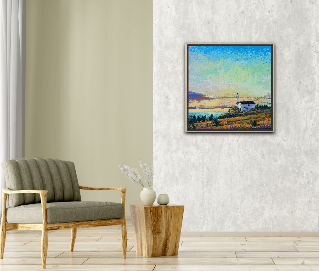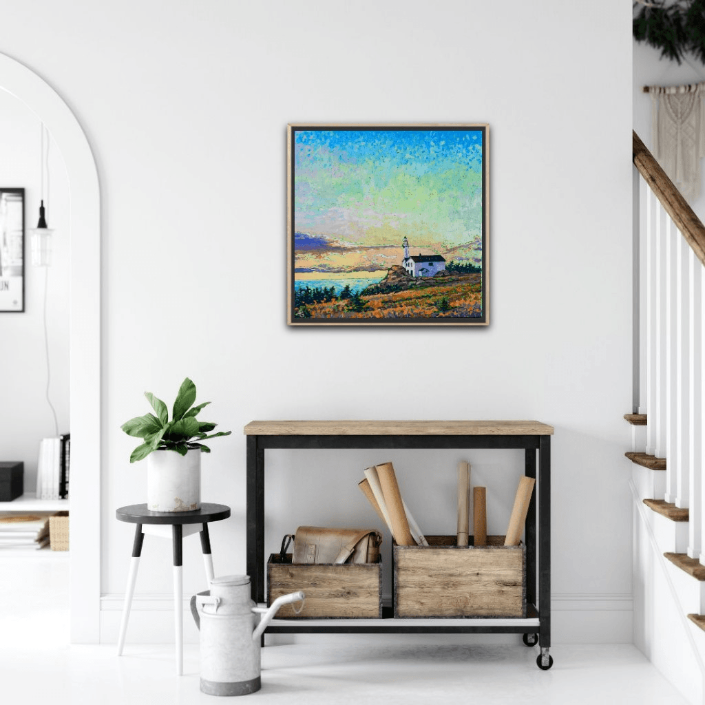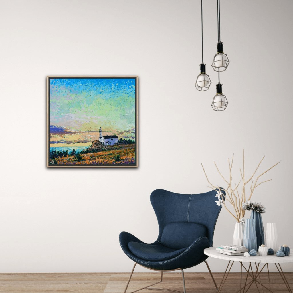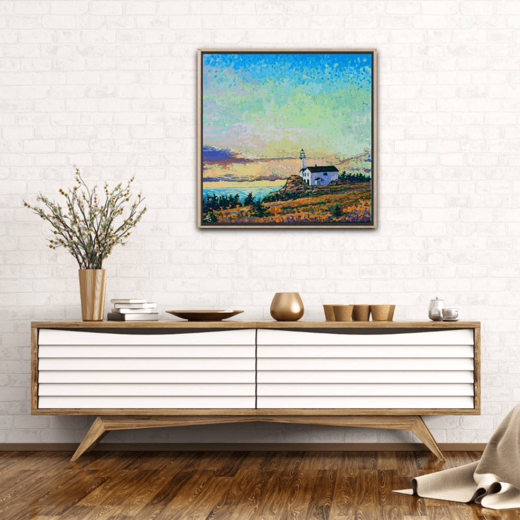 "Karakand" is a nostalgic, memory based manifestation of what a slow summer evening around Lobster Cove Lighthouse would look like. The beautiful contrast between neutral tones and vivid, bright hues is striking and helps guide the eyes through the scene. It creates a smooth, gliding visual motion from the meadow-like foreground, passing through the stillness of the lighthouse and its adjacent rock, slowly being swept up above the ocean blue, into the horizon of burning clouds and towards the high celestial background.