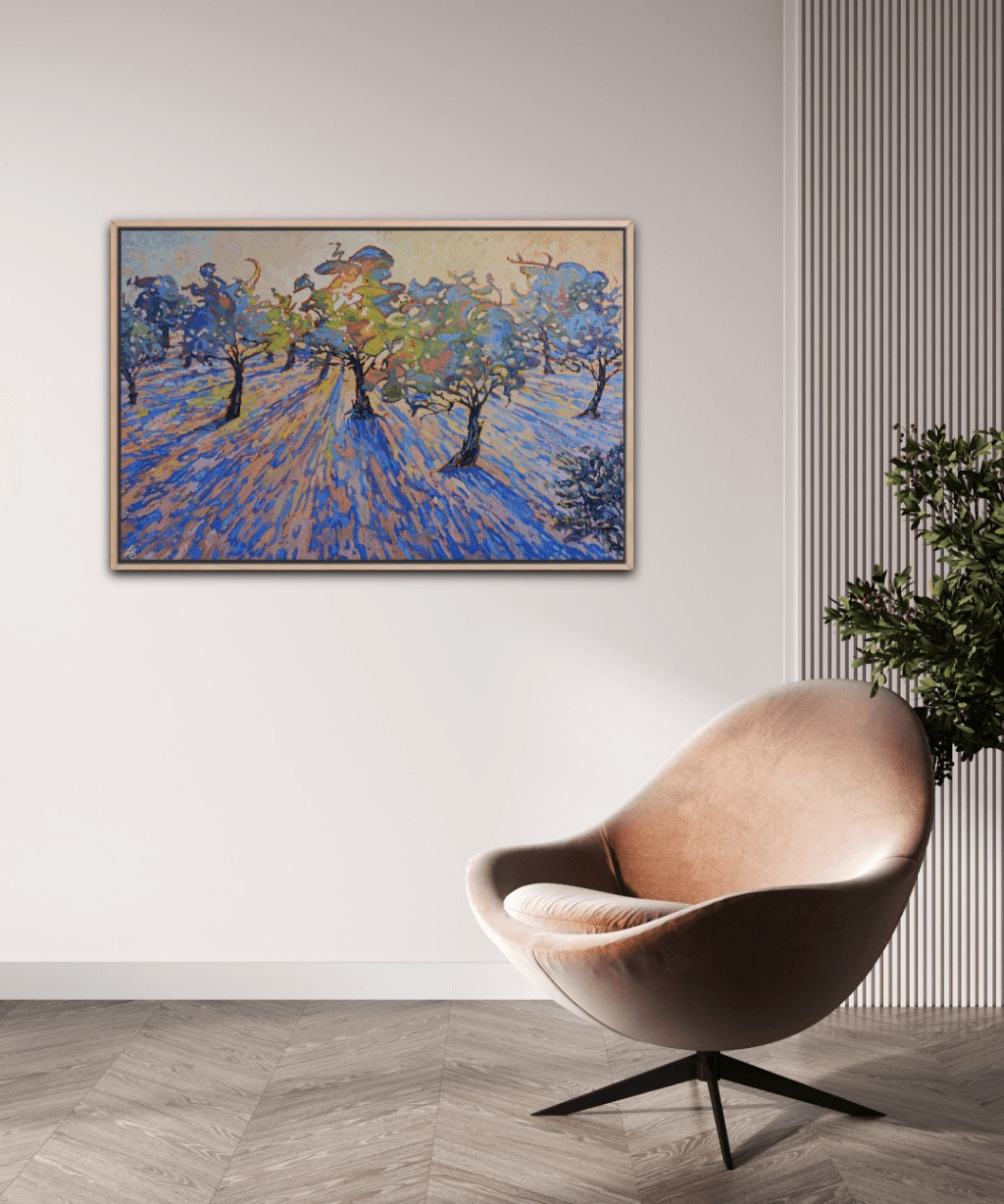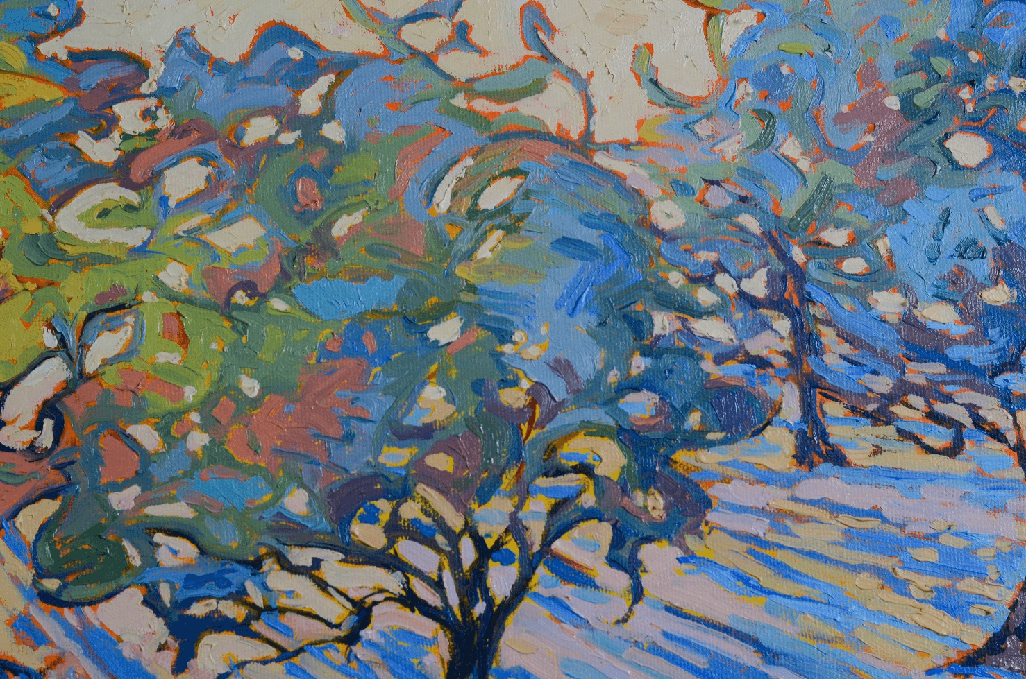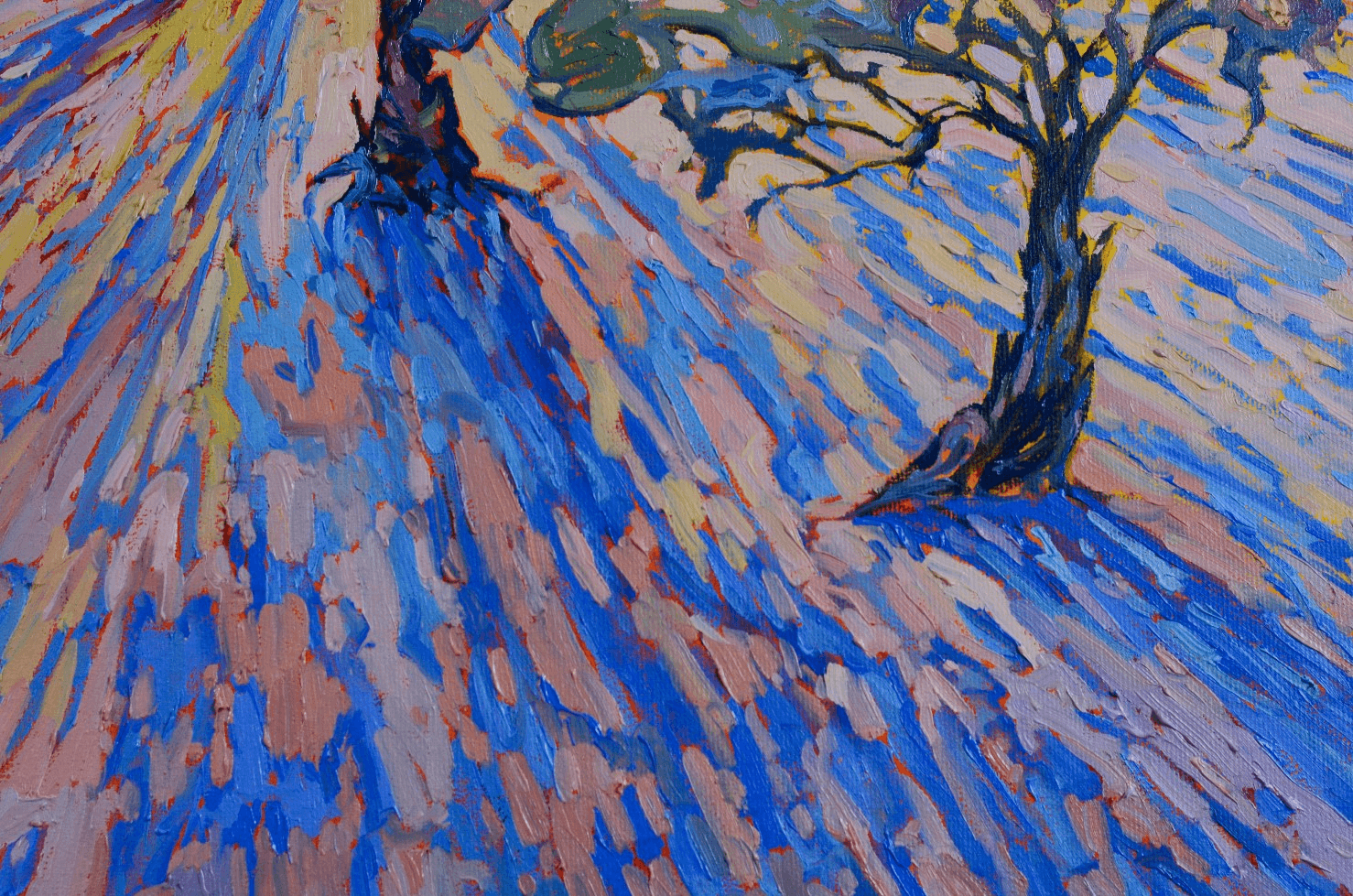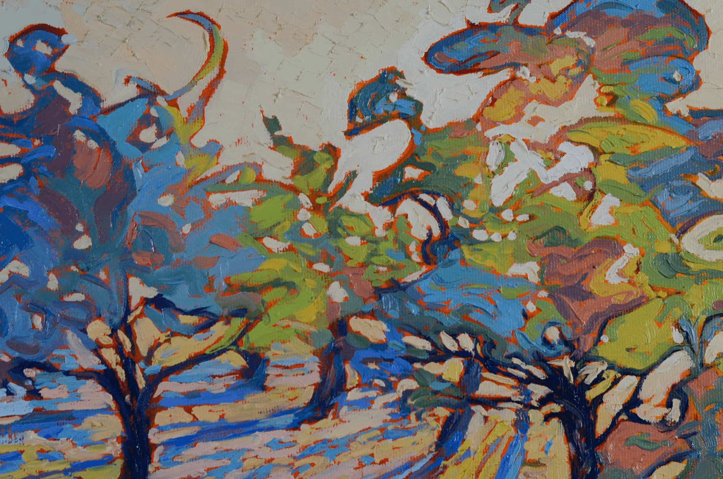 [...] If we were poor, she enriched us. We drank her oil to our health.She taught me to love her,She taught me to love her kind,She taught me that a tree can make miracles.And if miracles confirm sanctity,If miracles confirm divinity,Then my God is an olive tree. This painting is titled "MY GOD IS AN OLIVE TREE" and it is a tribute to the olive trees I grew up around which infused me with the love of nature and trees.