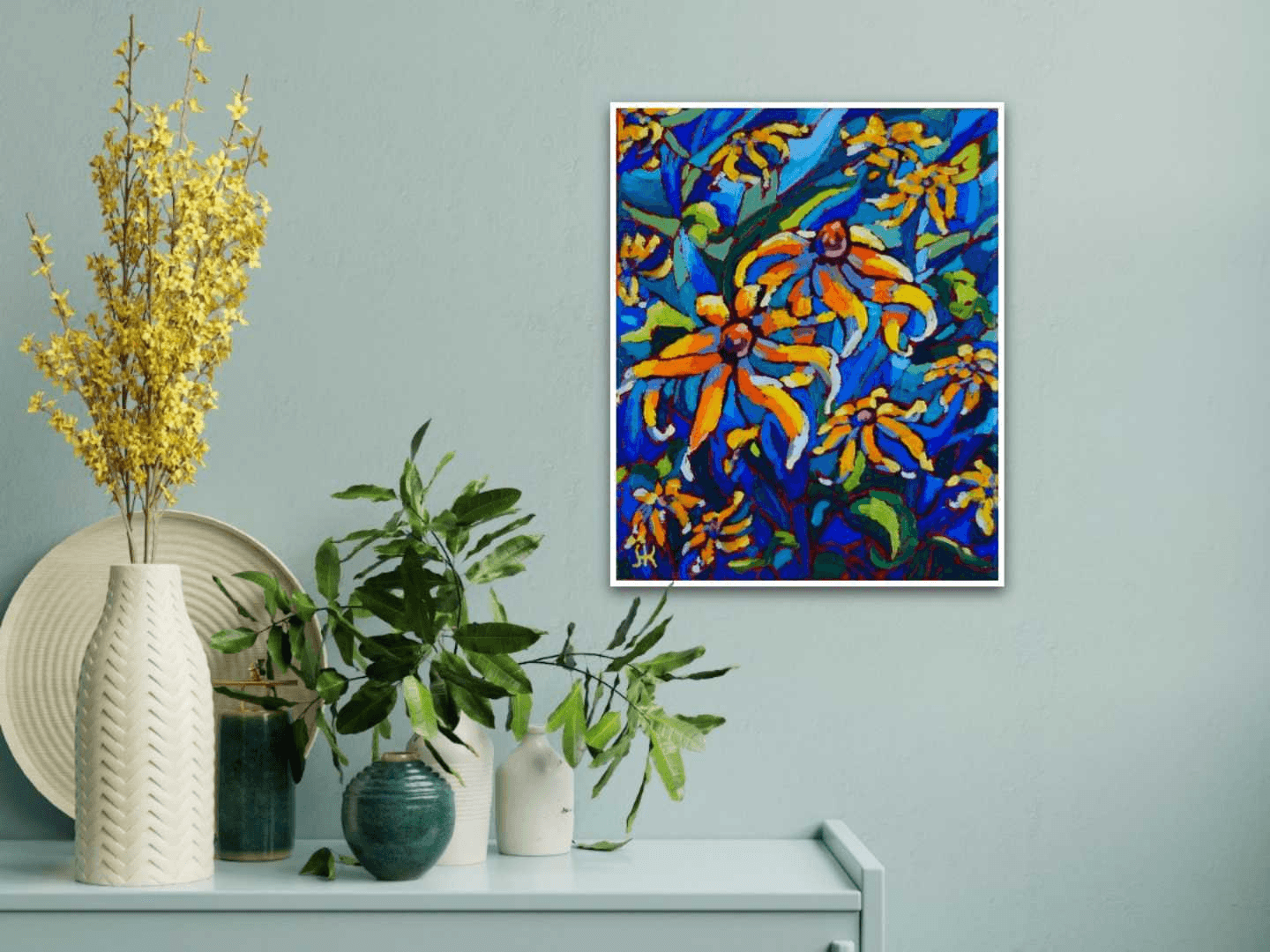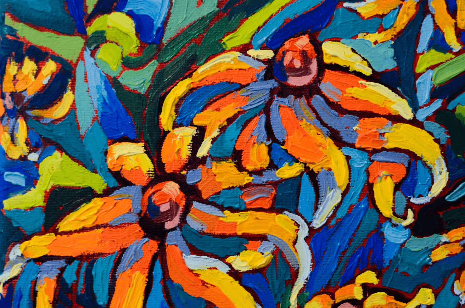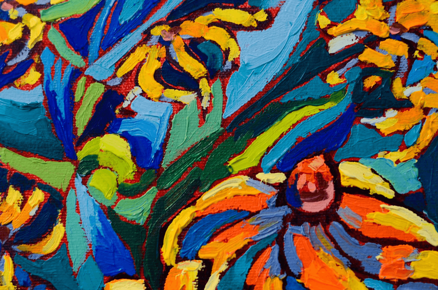 This small painting is inspired by my mother and her ever-blossoming garden. She is a true gardening magician who turns everything she touches into a blooming wonder. She grows fruits, vegetables, herbs, flowers, plants and trees and she loves to share her treasures with all the family. Her garden is her kingdom and she is our reigning queen... All this makes this artwork the perfect fit for gardening enthusiasts and nature lovers. The brushstrokes are mounted with thick paint bringing a three-dimensional quality to the surface. The curvatures in the shapes and lines create a movement that is accentuated by the richness and vibrancy of the colors.