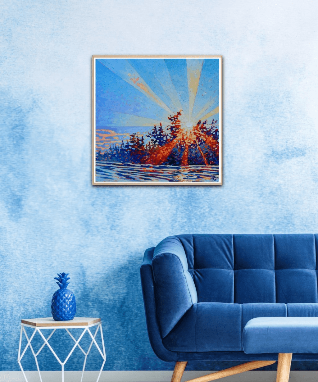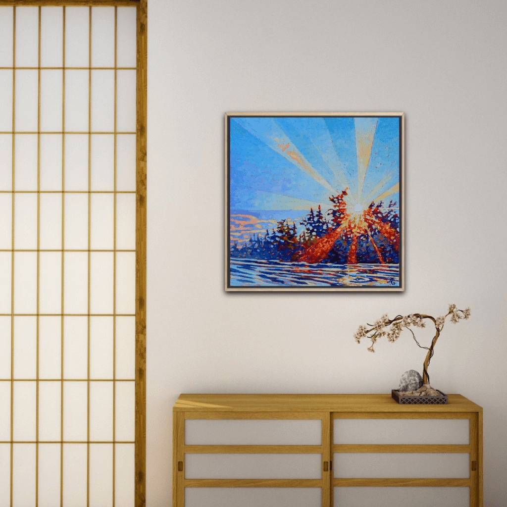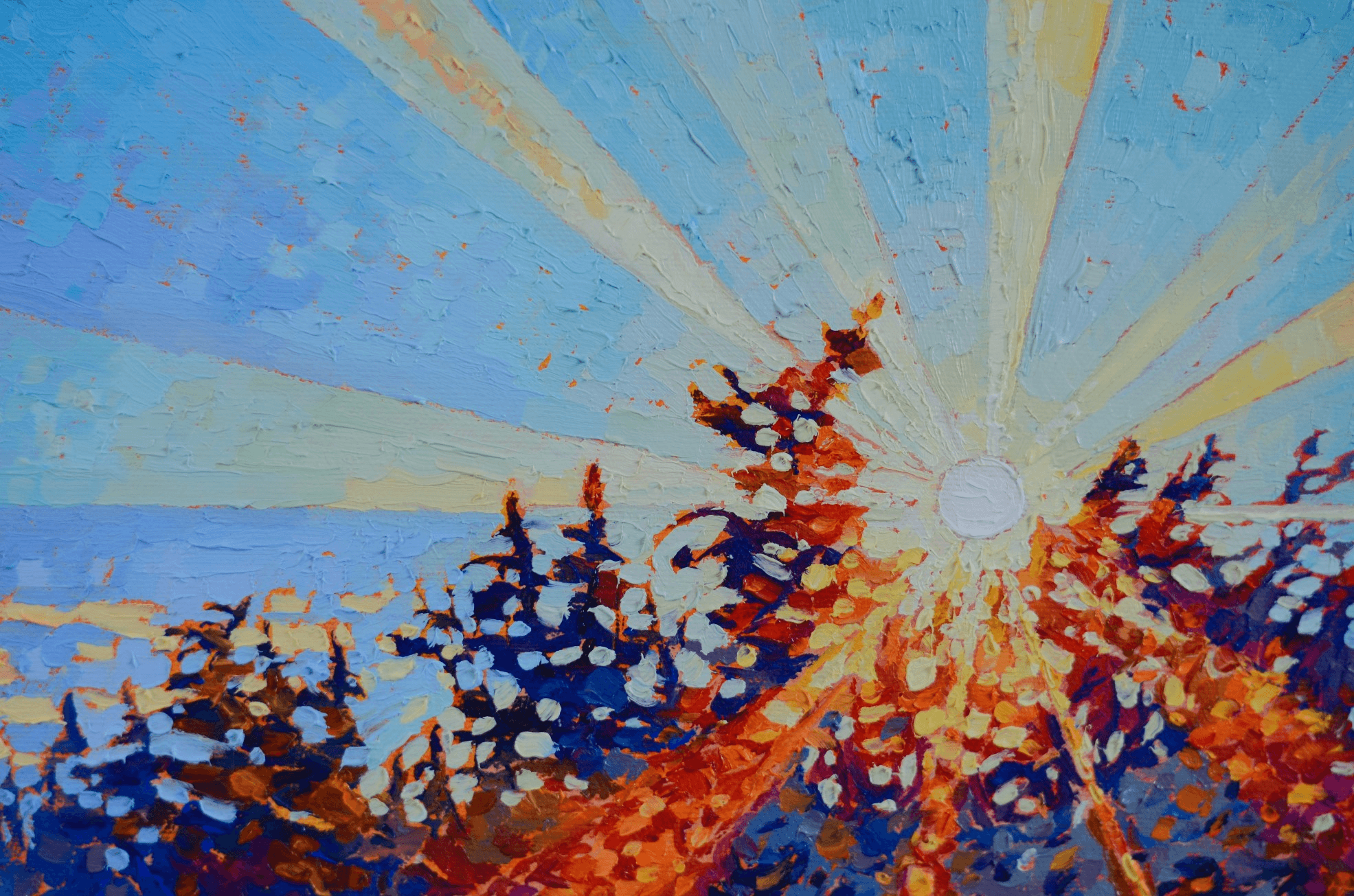 This gorgeous piece portrays the beauty of a rising sun behind a collection of evergreen trees. Each sunray is stretching beyond those trees to spread their warmth to the deepest waters and the farthest skies.
