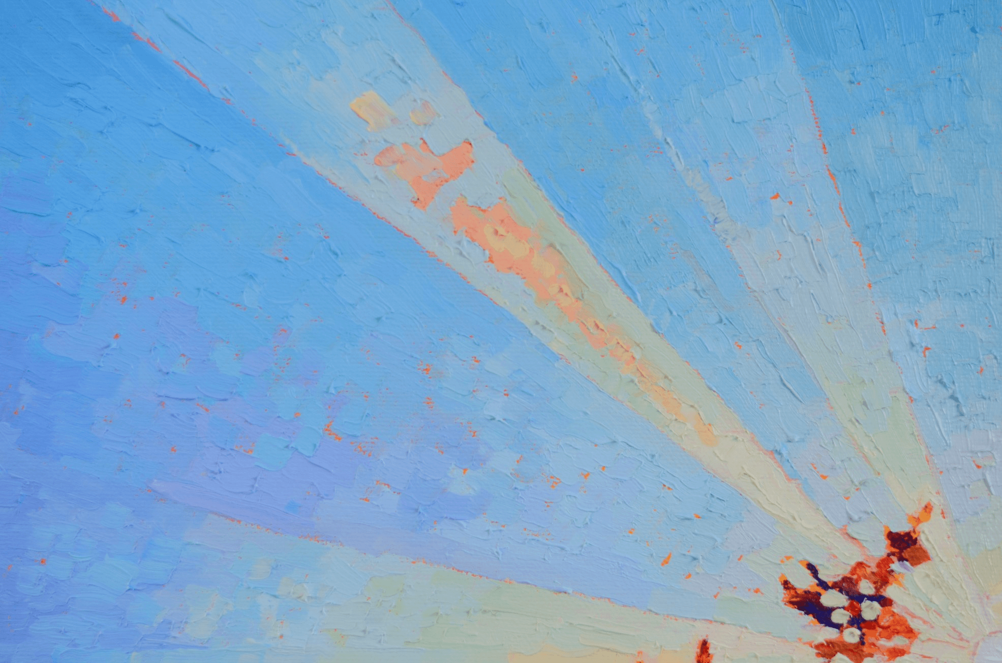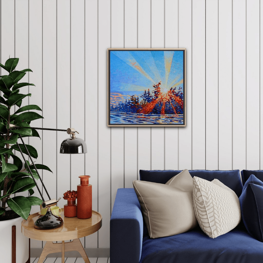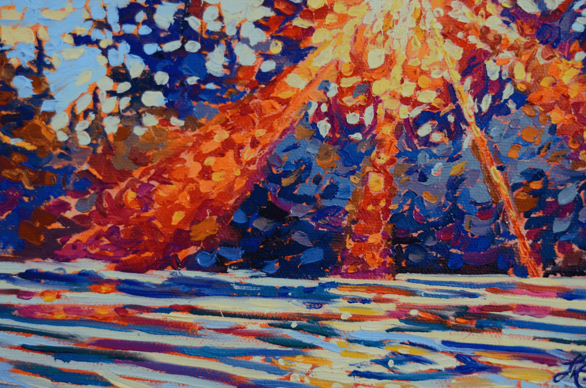 This gorgeous piece portrays the beauty of a rising sun behind a collection of evergreen trees. Each sunray is stretching beyond those trees to spread their warmth to the deepest waters and the farthest skies.