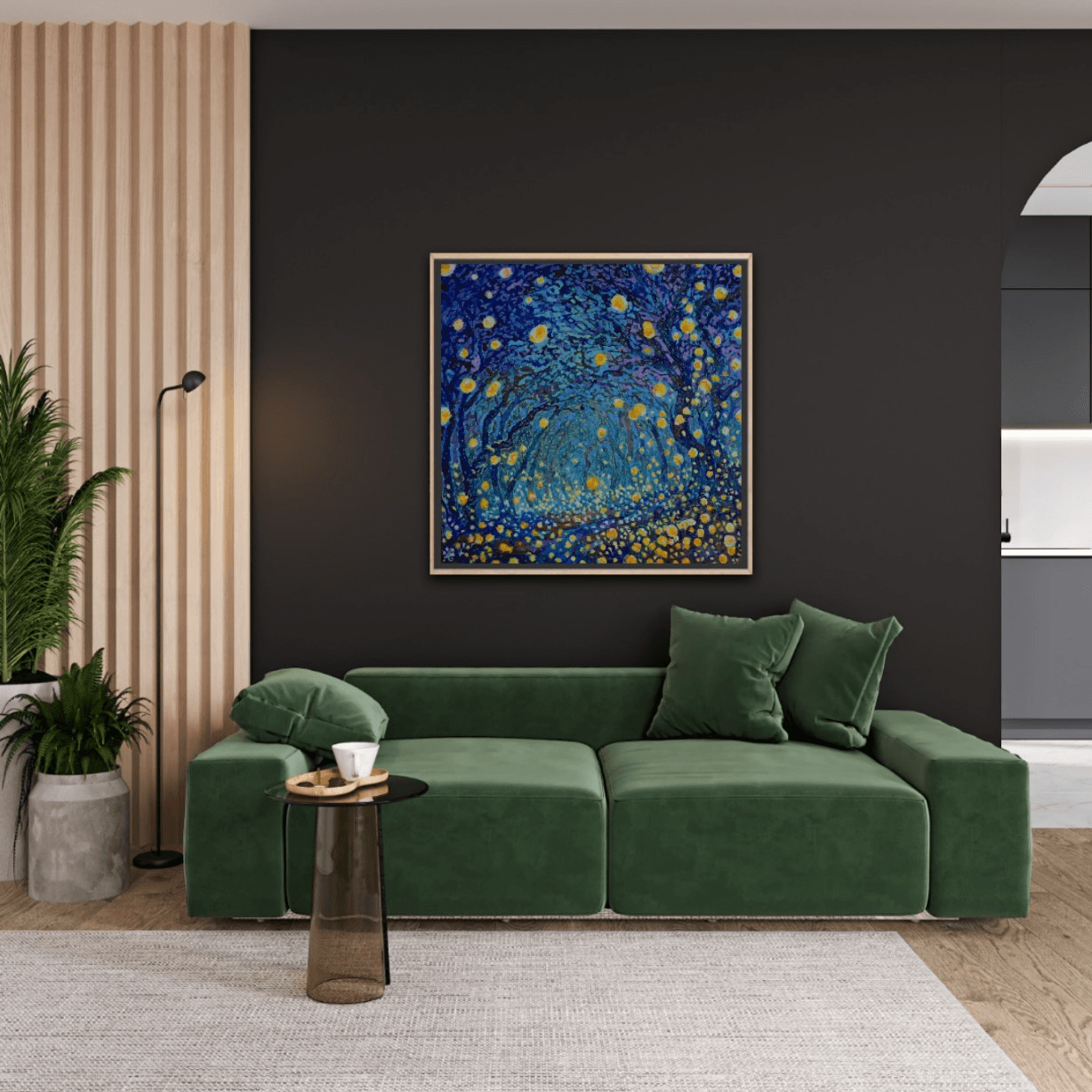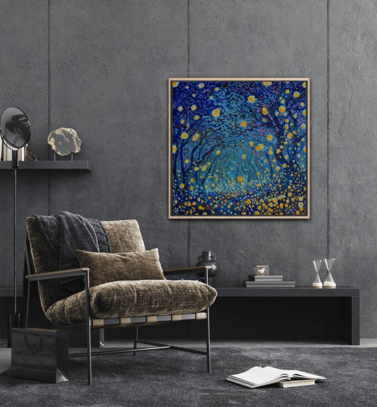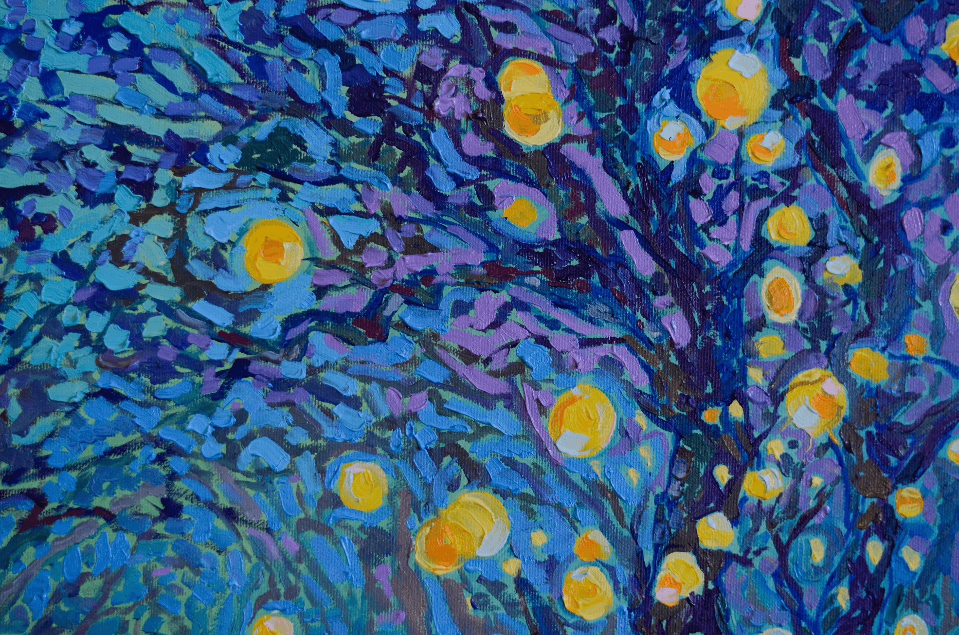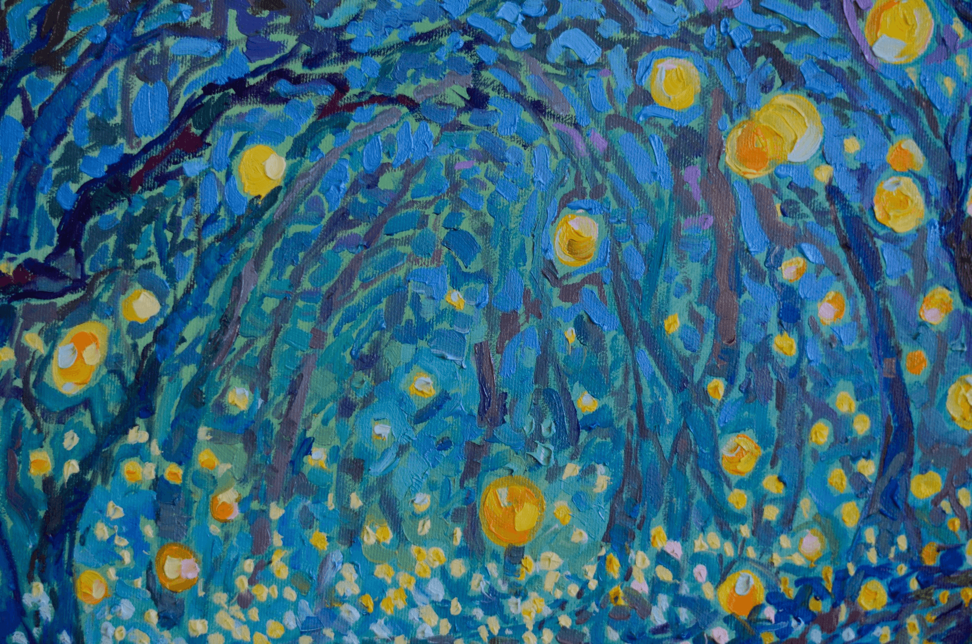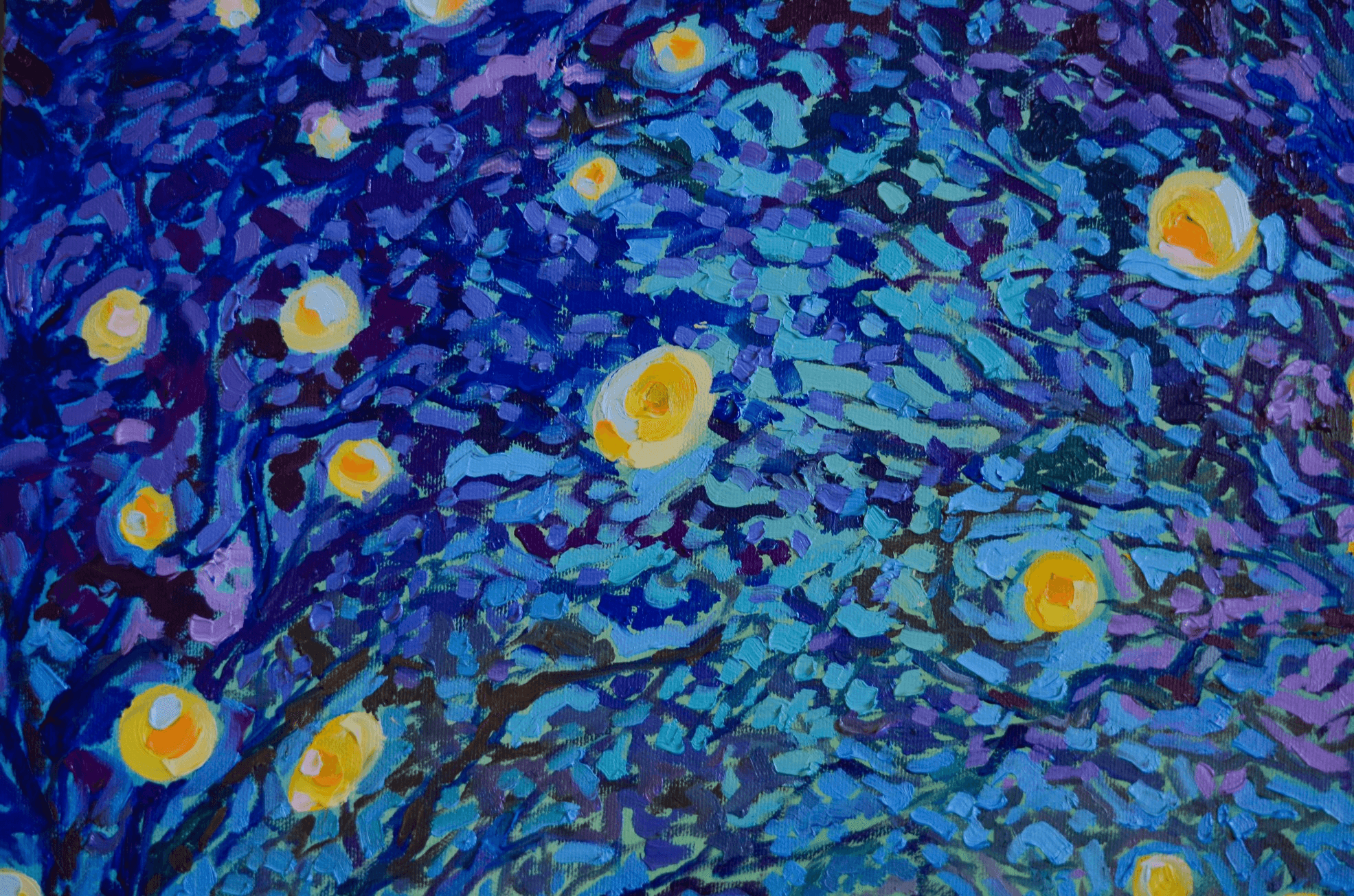 A profusion of countless, sublime suns hover, fly, glide and take wing on a quiet night through a path lined by dancing and undulating trees as their graceful shapes give momentum to the movement of the fireflies abuzz within their realm. The warmth of their light creates a brilliant contrast with the coolness of the night and turns the whole scene into a night of magic, mystery and wonder. Each brushstroke is laden with a fair amount of paint to add energy and texture as well as enhance the sensation of enchantment and fervor.