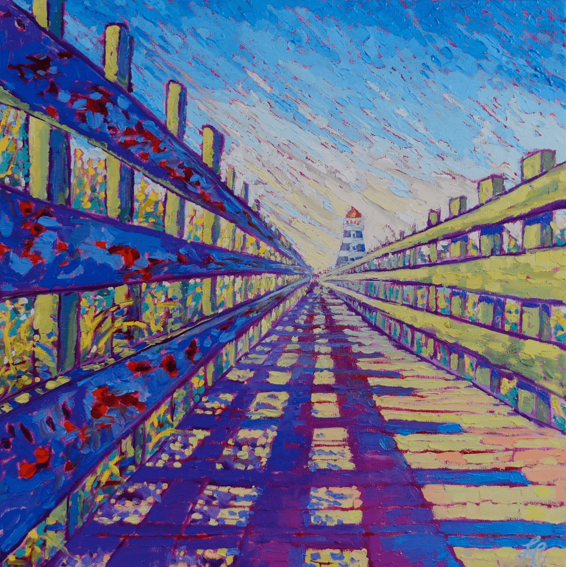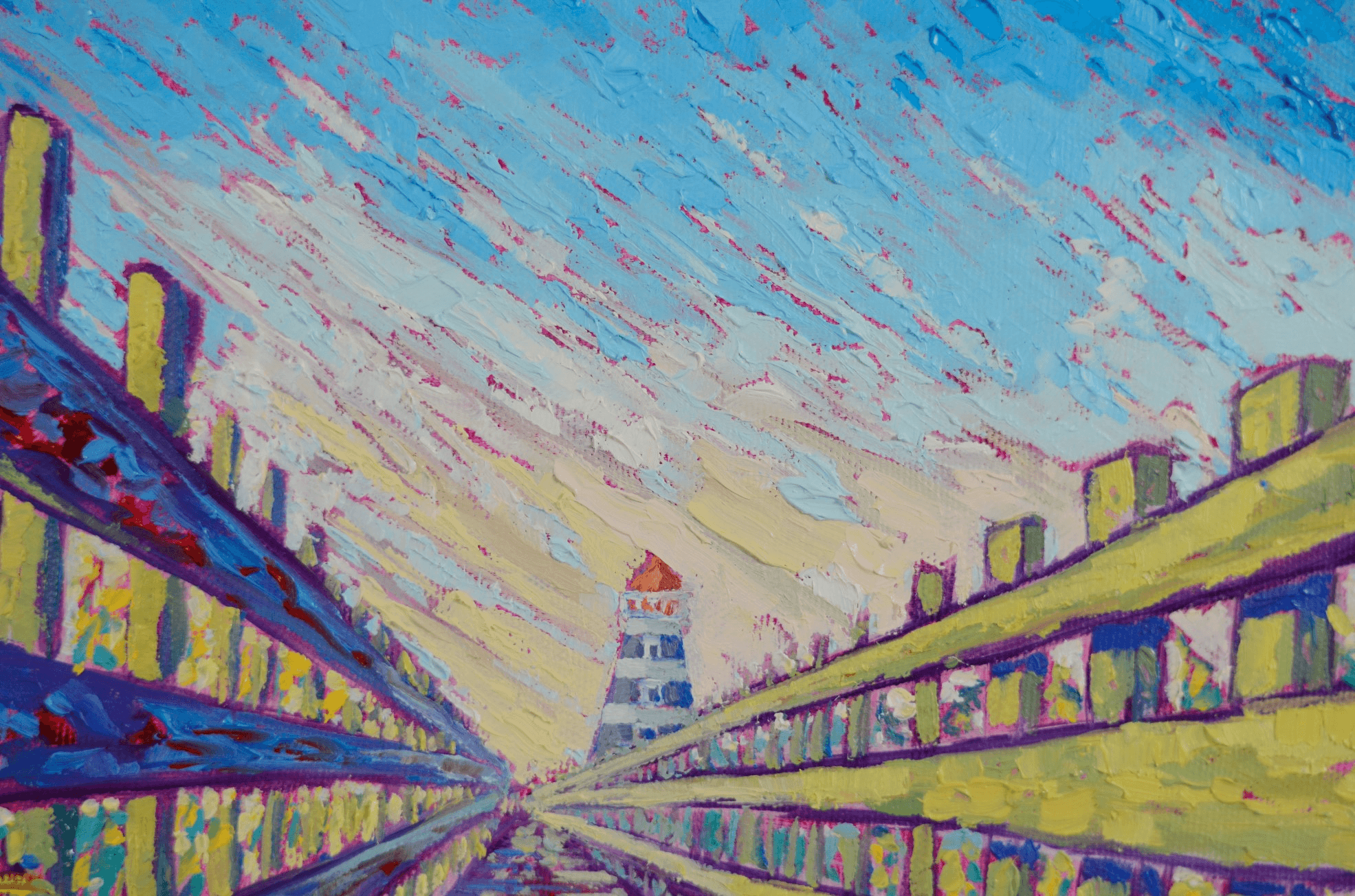 I love the beautiful time of transition from Spring to Summer. The birds would sing their heart out and the trees would be all in bloom. My bedroom would be all in pink hues from the lilac and cherry blossom trees around the house... In the spirit of sunshine and blue skies, I decided to portray this happy feeling with a painting inspired by my visit to West Point Beach in Prince Edward Island. The red sandy beach was completely covered in seashells. I remember I spent most of my time there collecting a huge amount of them which I still keep and use as ornaments around the house to bring a fresh and authentic summer touch! One of the best souvenirs I got to collect. But the focal point of this beach is its lighthouse and I wanted to portray exactly that in this painting, framing it at the edge of the fenced path and surrounding it with pastel clouds and clear, vivid, blue, summer sky. Doesn't it make you want to go to the beach right now!?