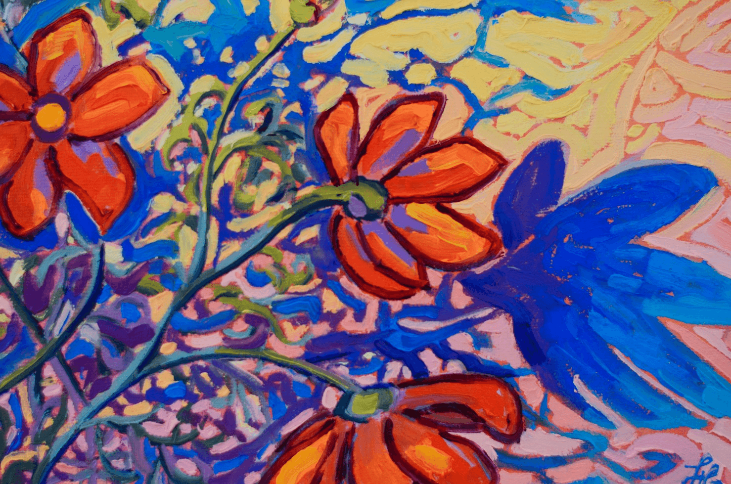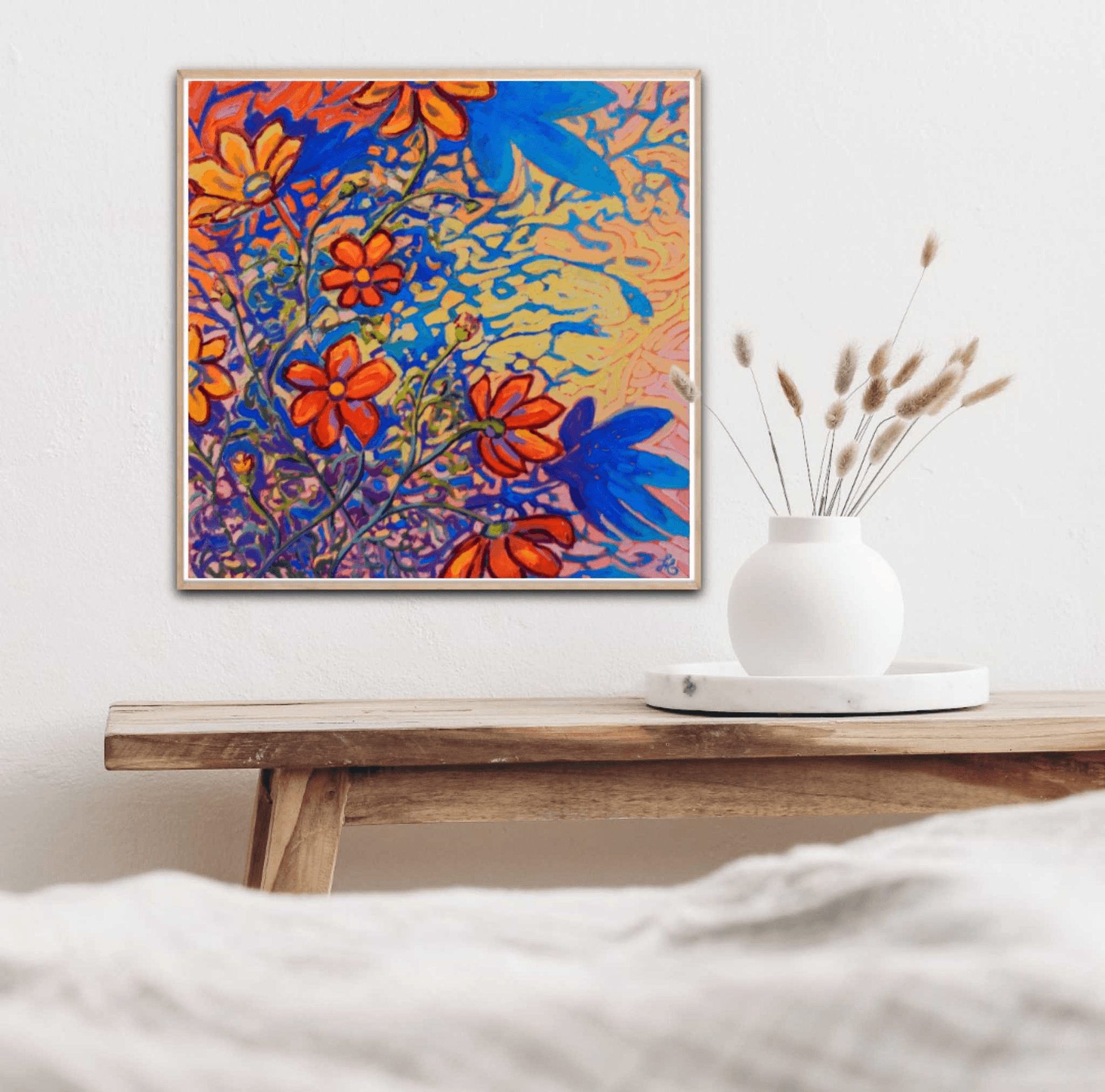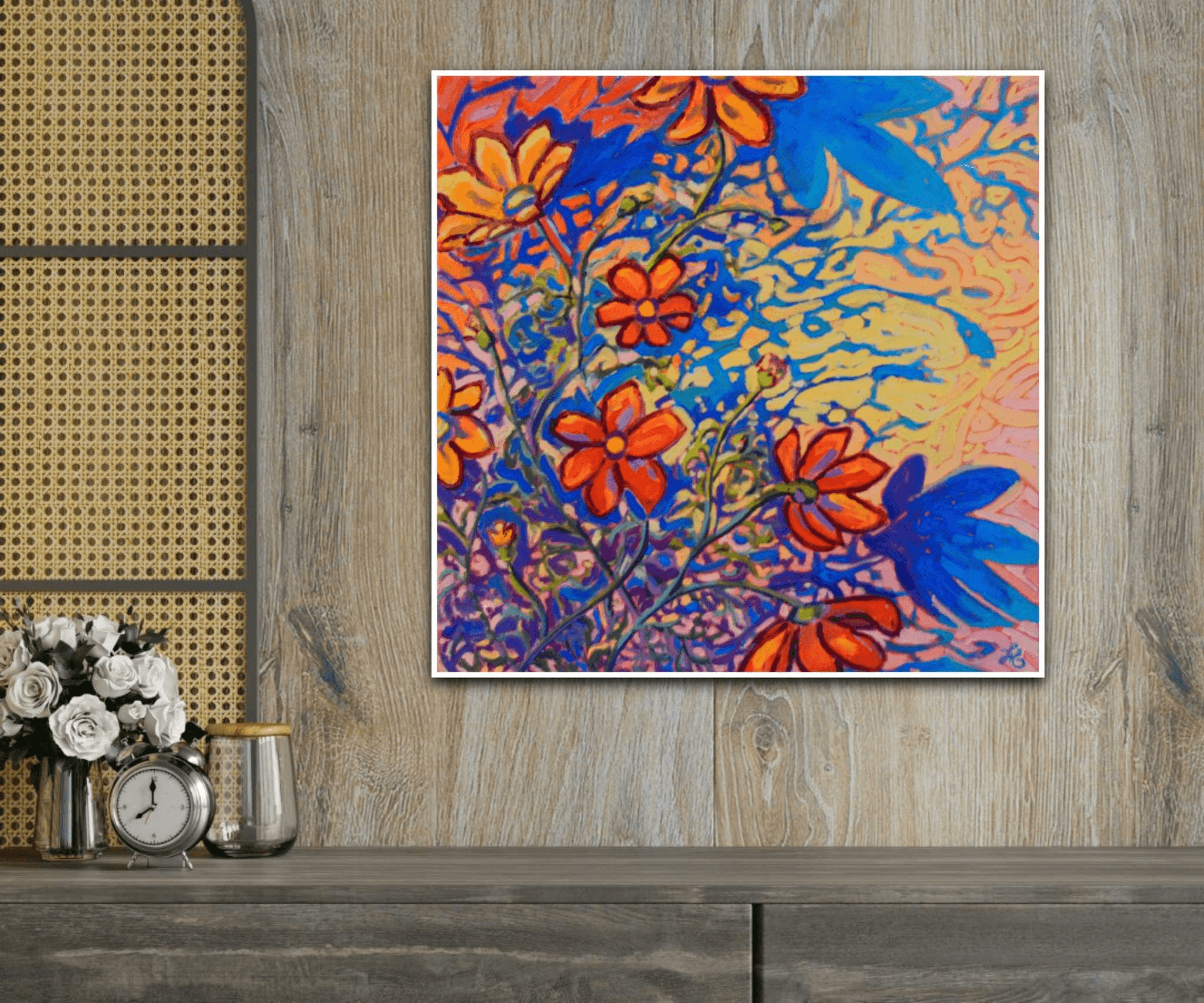 A little collection of colorful Cosmos flowers, soaking up the last of the day's sunrays as their shadows cast long and equally vivid shadows behind them. The thick brushstrokes, laid with generous amounts of paint add beautiful definition and finish to this painting.