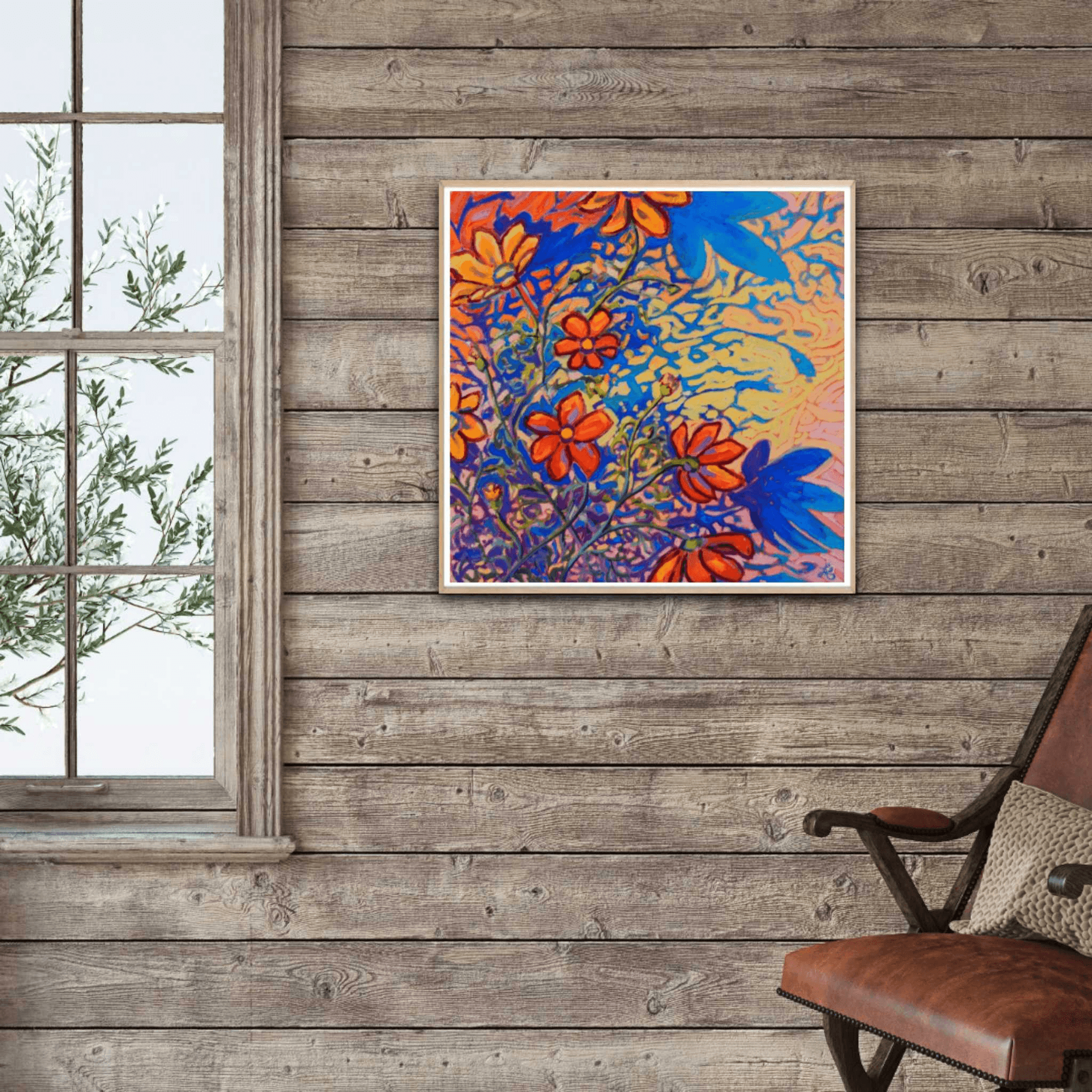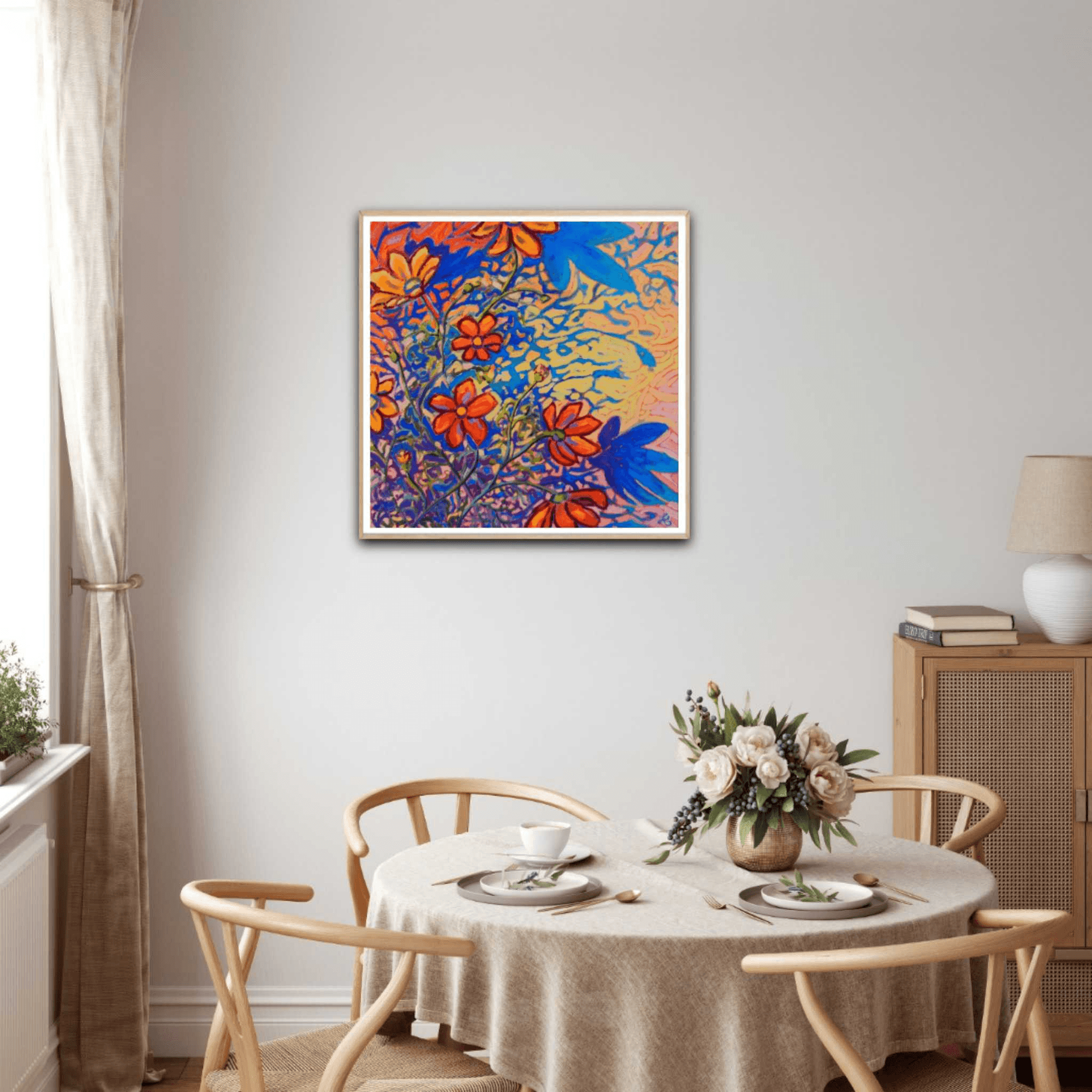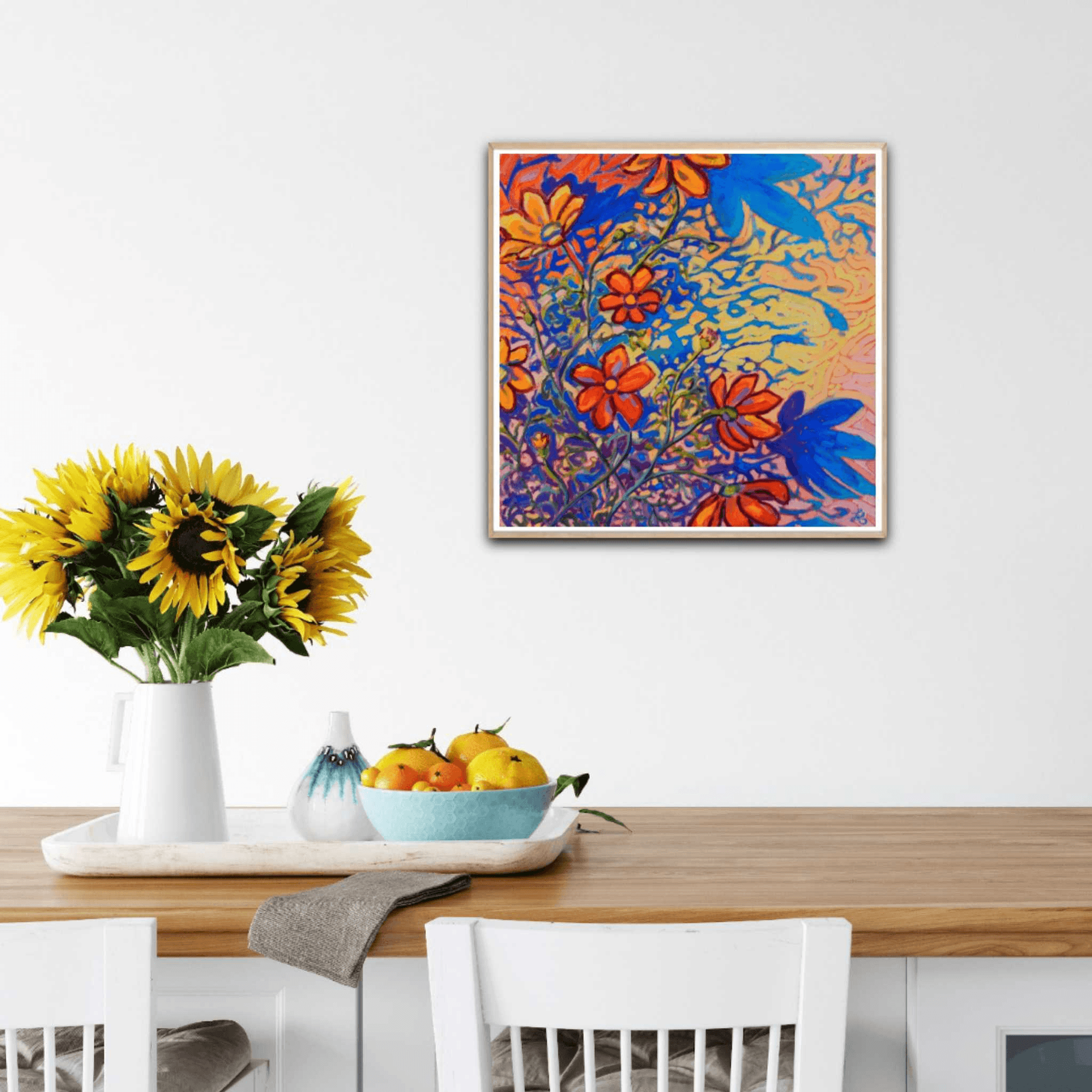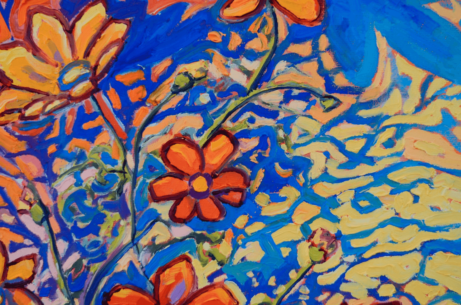 A little collection of colorful Cosmos flowers, soaking up the last of the day's sunrays as their shadows cast long and equally vivid shadows behind them. The thick brushstrokes, laid with generous amounts of paint add beautiful definition and finish to this painting.