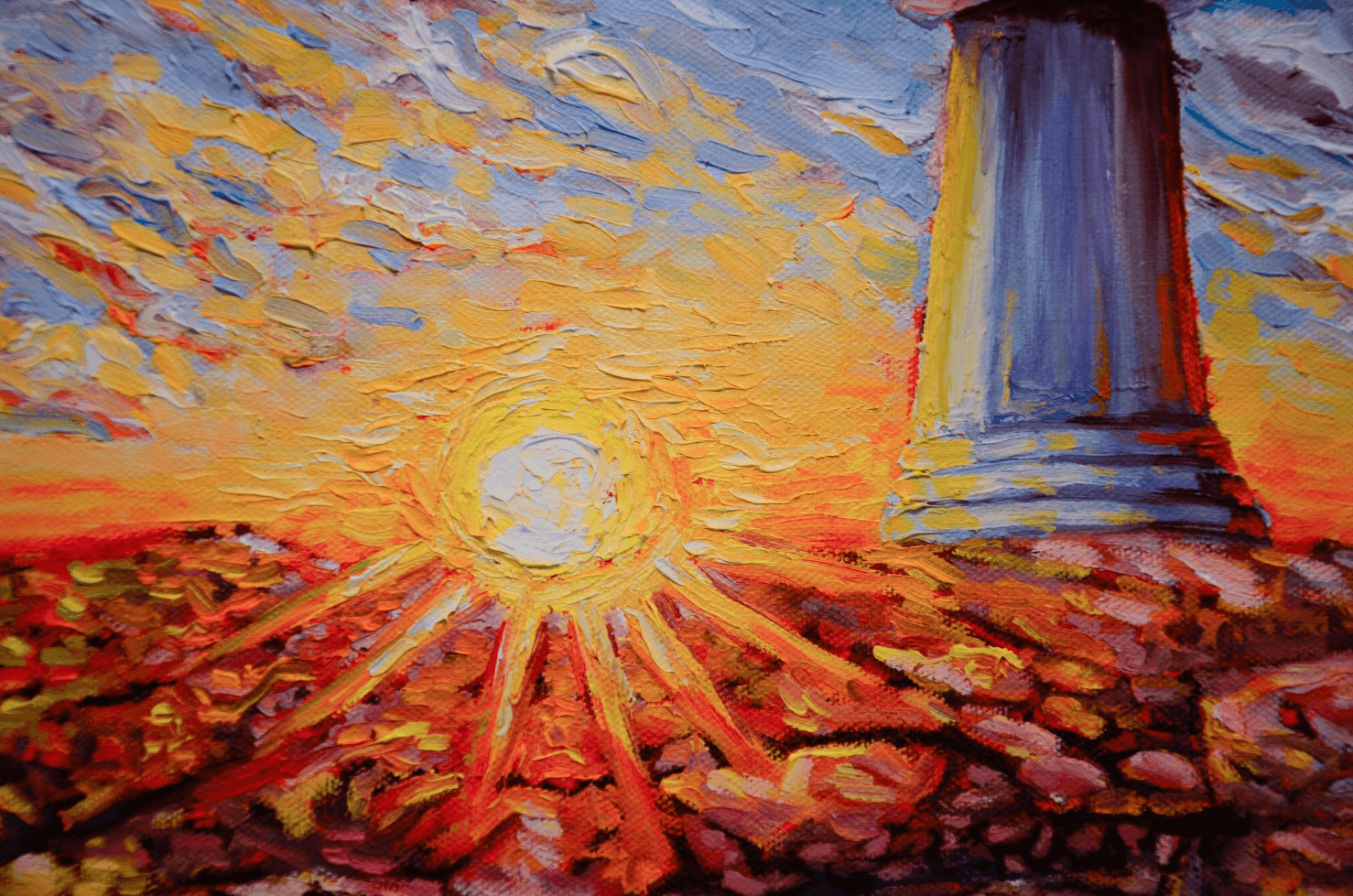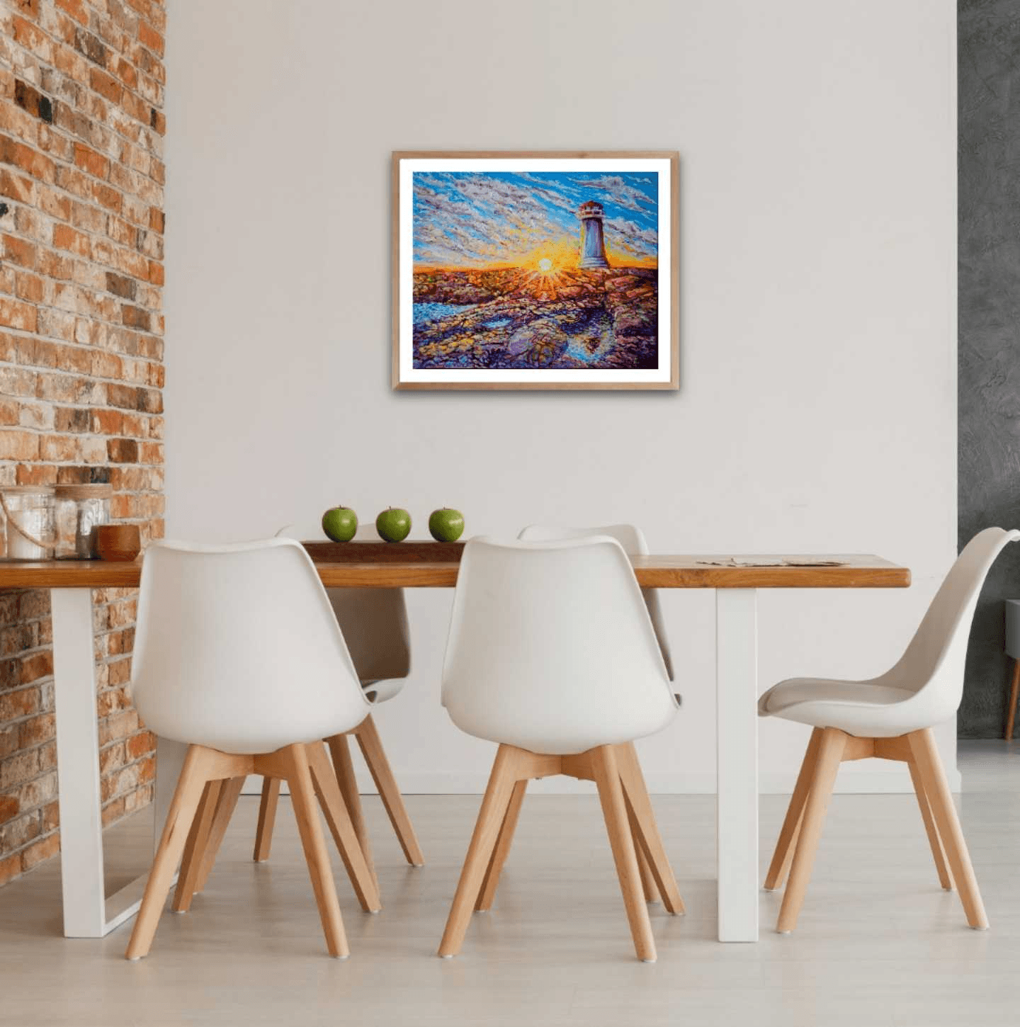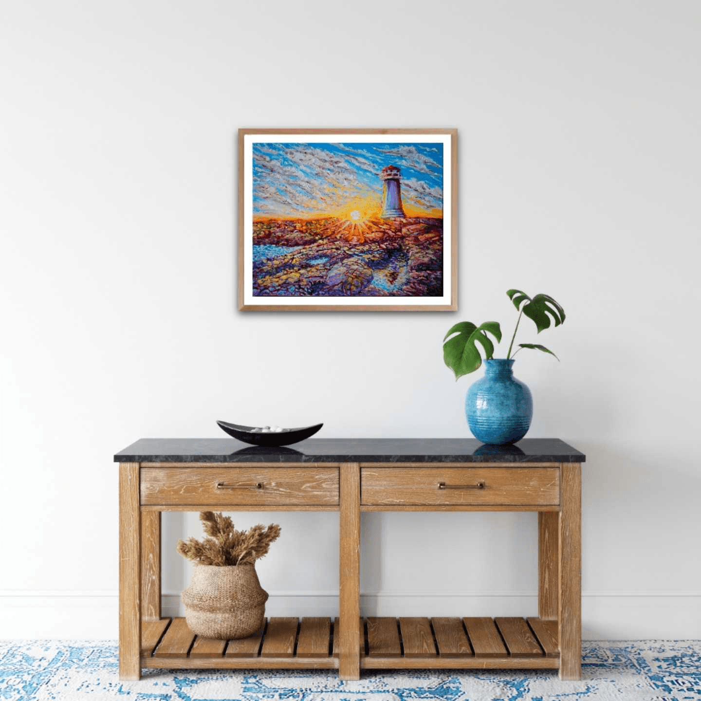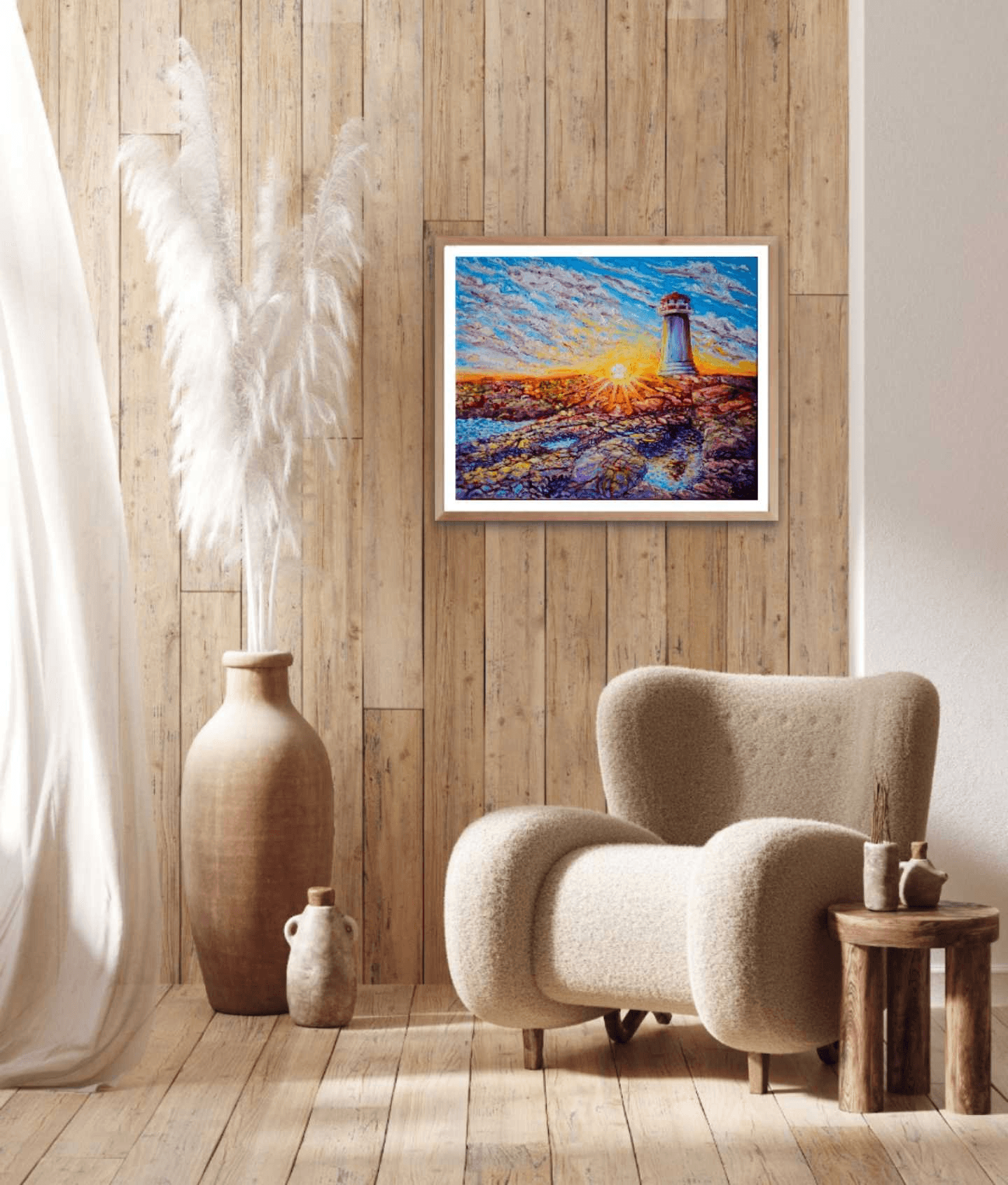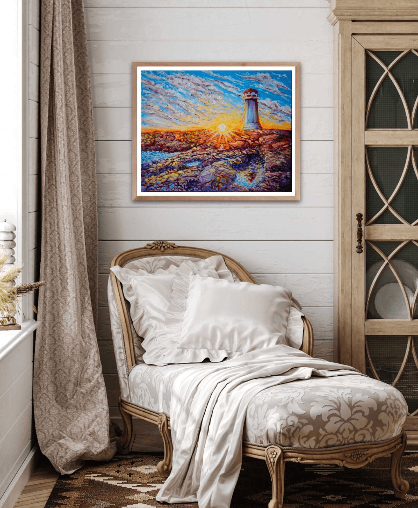 One of my favorite places on earth: Peggy's Cove in Nova Scotia. A mammoth molten lava rock bed formed millions of years ago and overlooking a wild and merciless ocean surrounded by very welcoming, little fishing towns and villages. This place is beautiful under any light and weather conditions, but for this painting I wanted to portray its lighthouse majestically sitting on its granite throne, enjoying the last warm rays of the setting sun. They say the golden hour makes everything look beautiful, but I believe that Peggy's Cove itself makes the golden hour look magical.