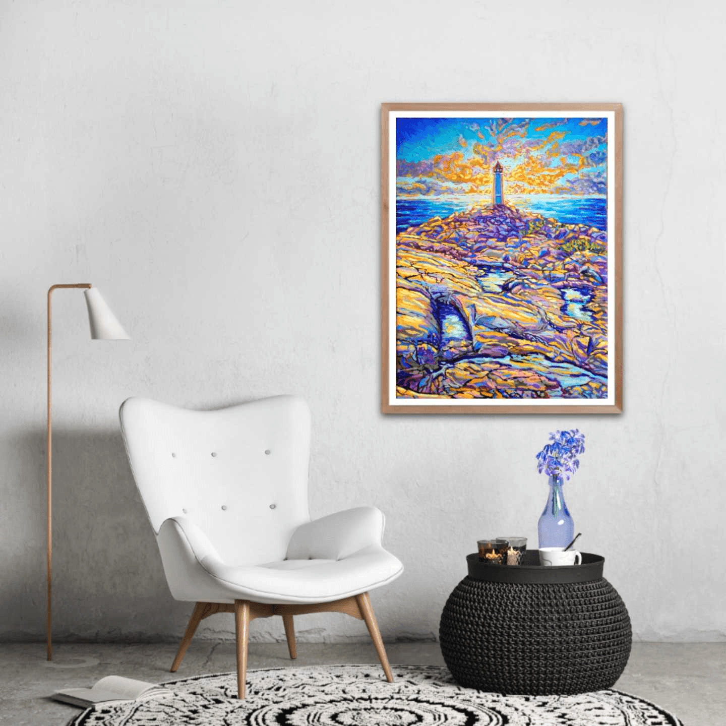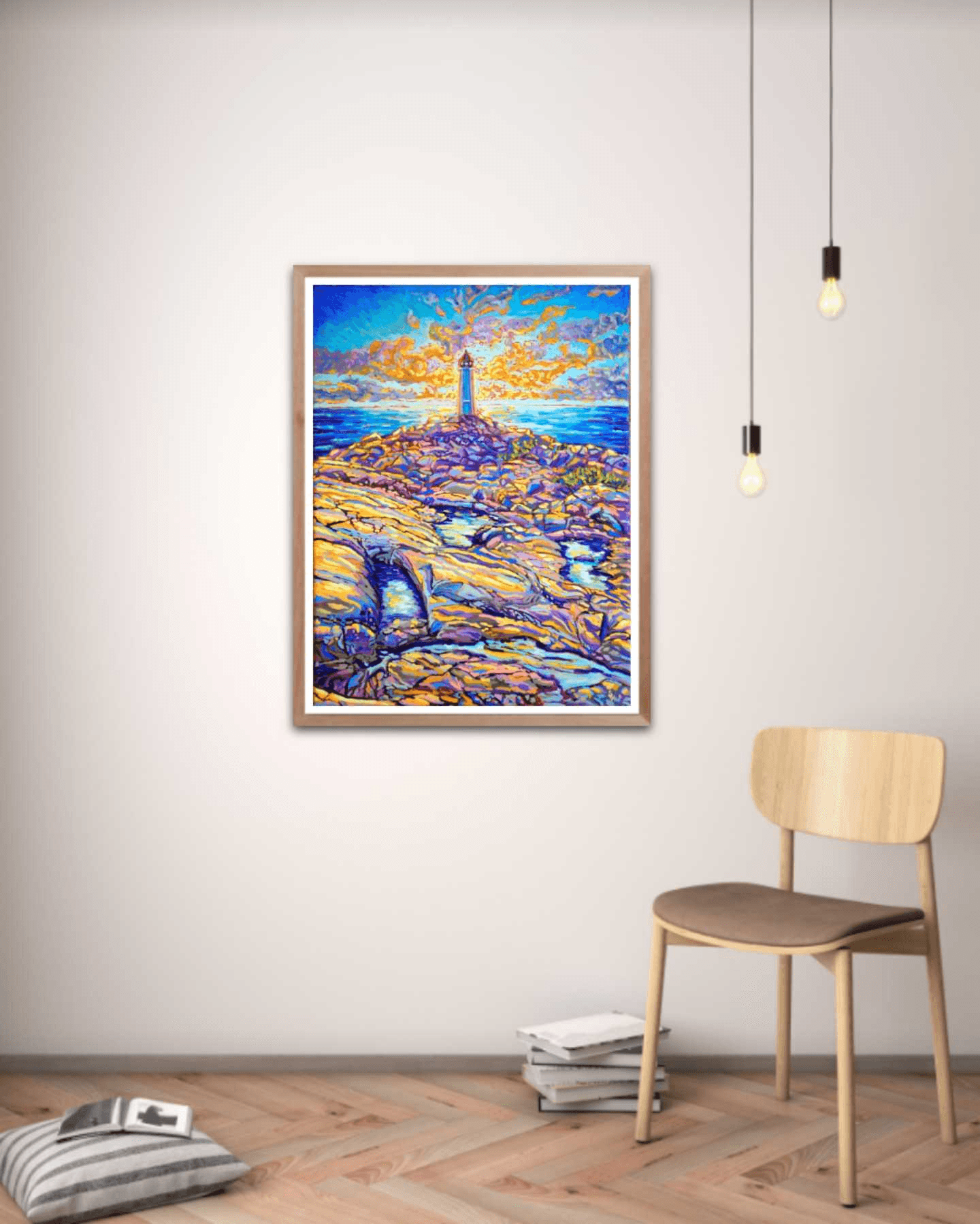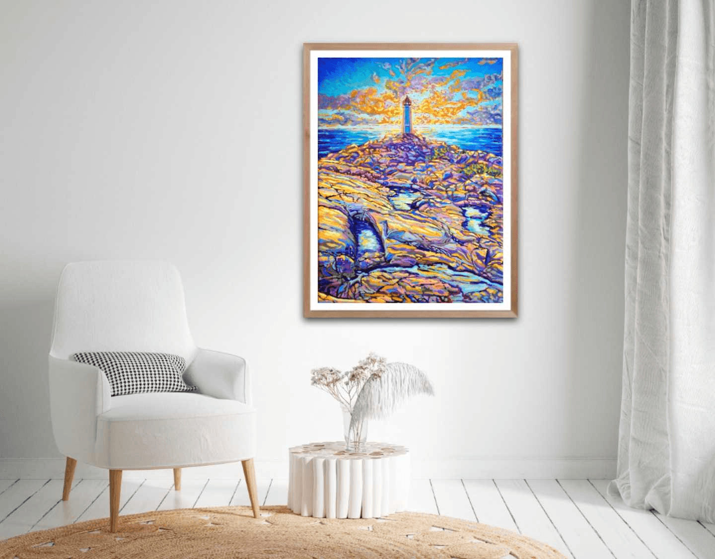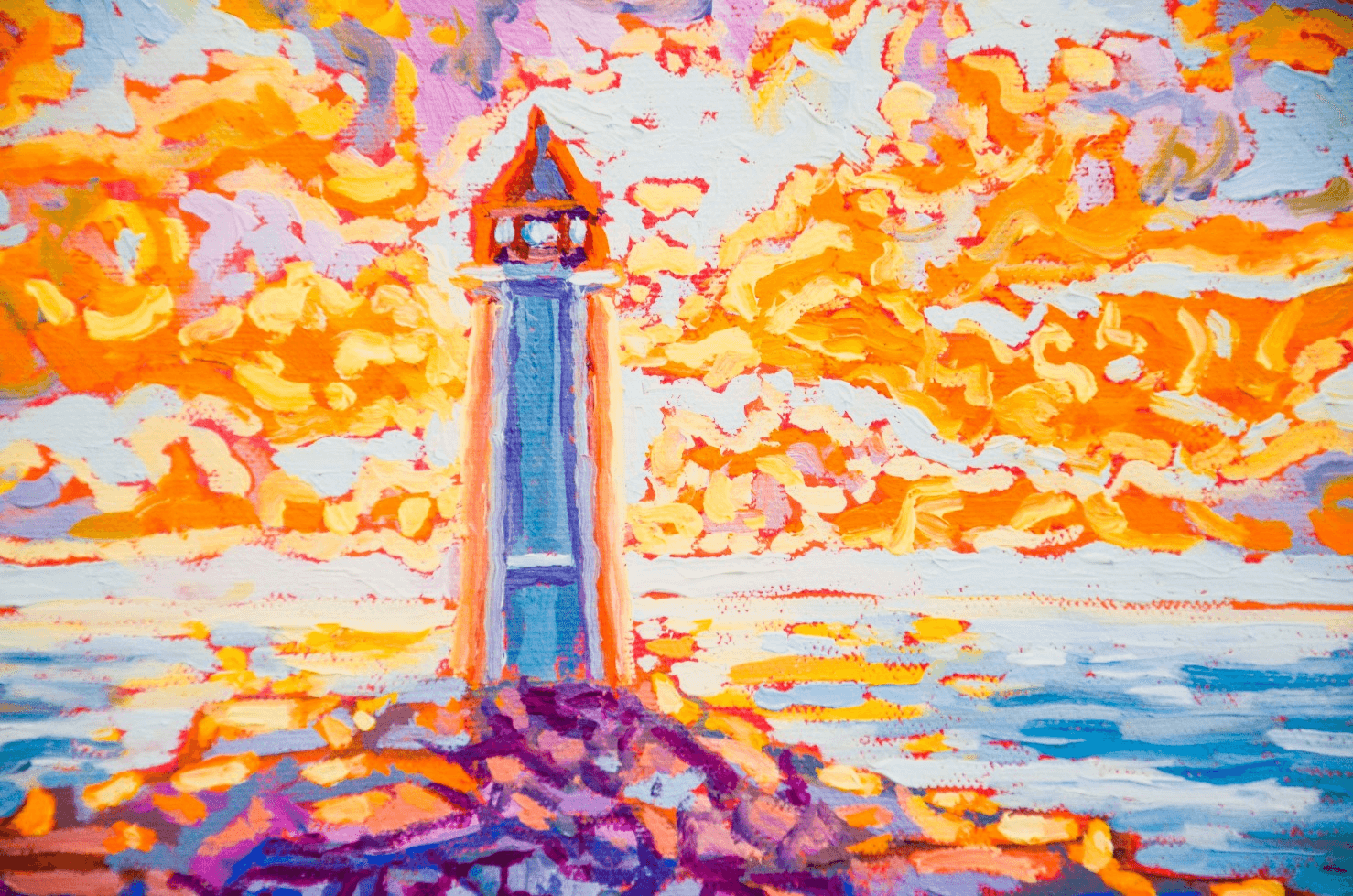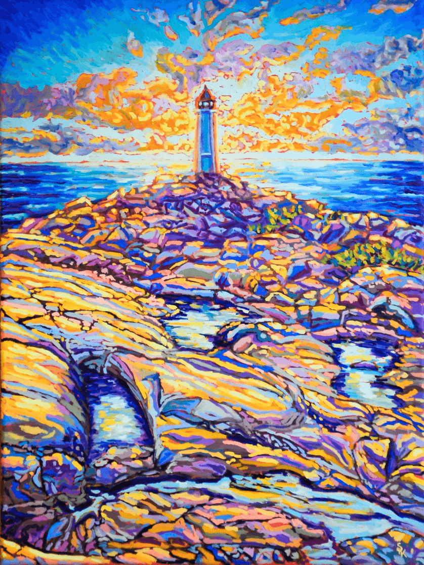One of my favorite places on earth is Peggy's Cove. From hundreds of reference pictures that I took, I decided this time to display its lighthouse right in the center of a sun-setting sky. The play of light and shadow on the rocks mirrors the contrast of the sun setting behind the lighthouse. The use of warm yellows and oranges contrasts with the cooler tones of blue and purple, while the ocean in between creates a balance and links the sky to the earth.