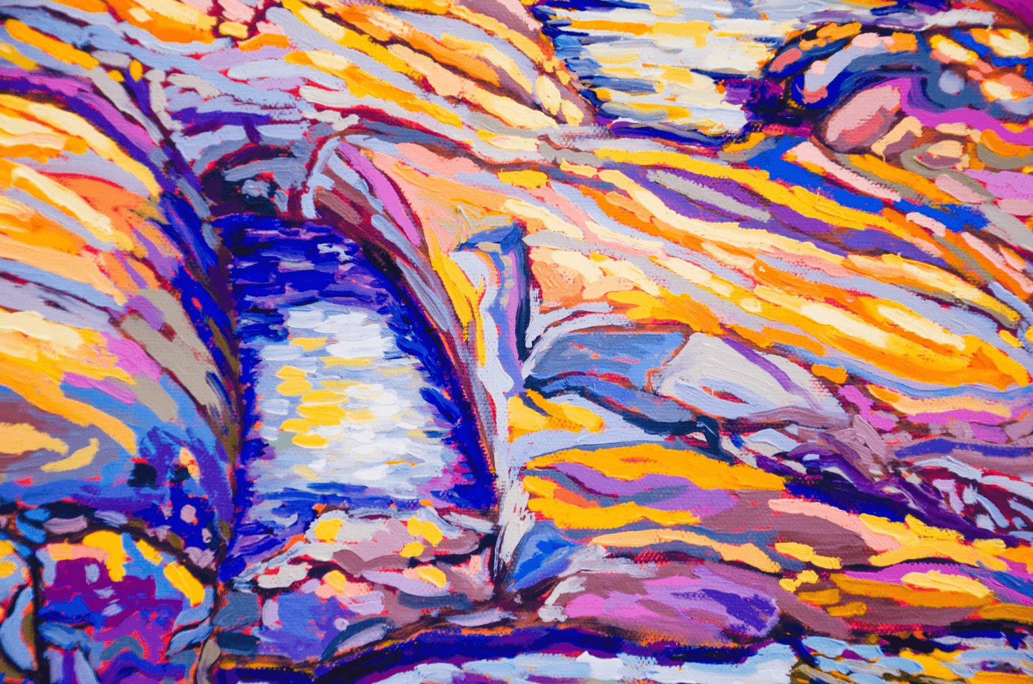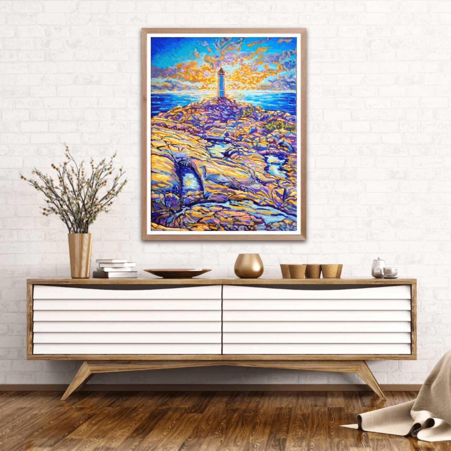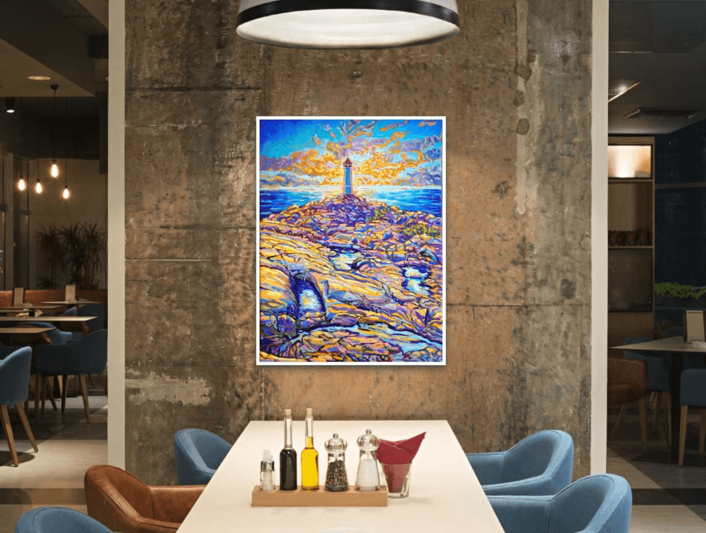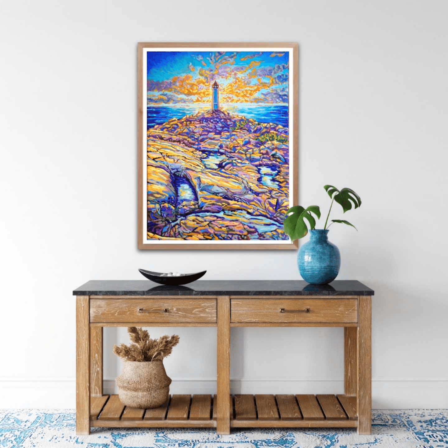 One of my favorite places on earth is Peggy's Cove. From hundreds of reference pictures that I took, I decided this time to display its lighthouse right in the center of a sun-setting sky. The play of light and shadow on the rocks mirrors the contrast of the sun setting behind the lighthouse. The use of warm yellows and oranges contrasts with the cooler tones of blue and purple, while the ocean in between creates a balance and links the sky to the earth.
