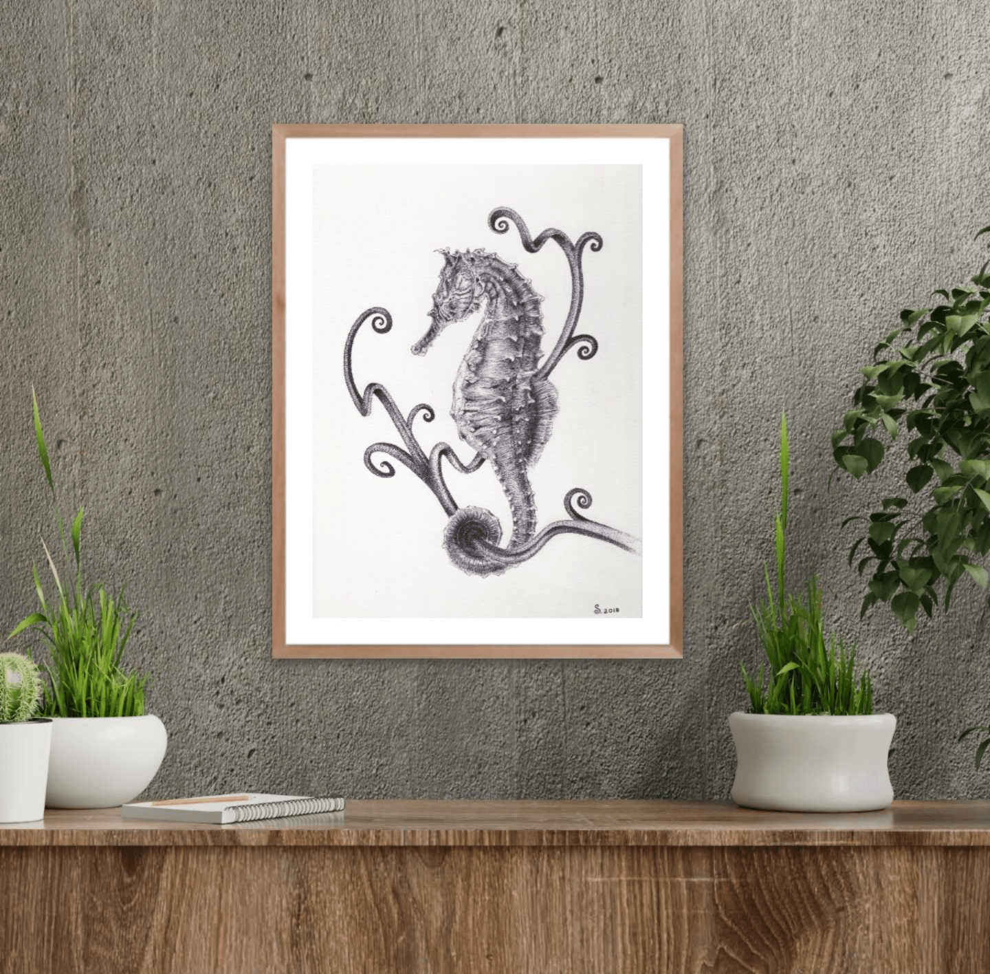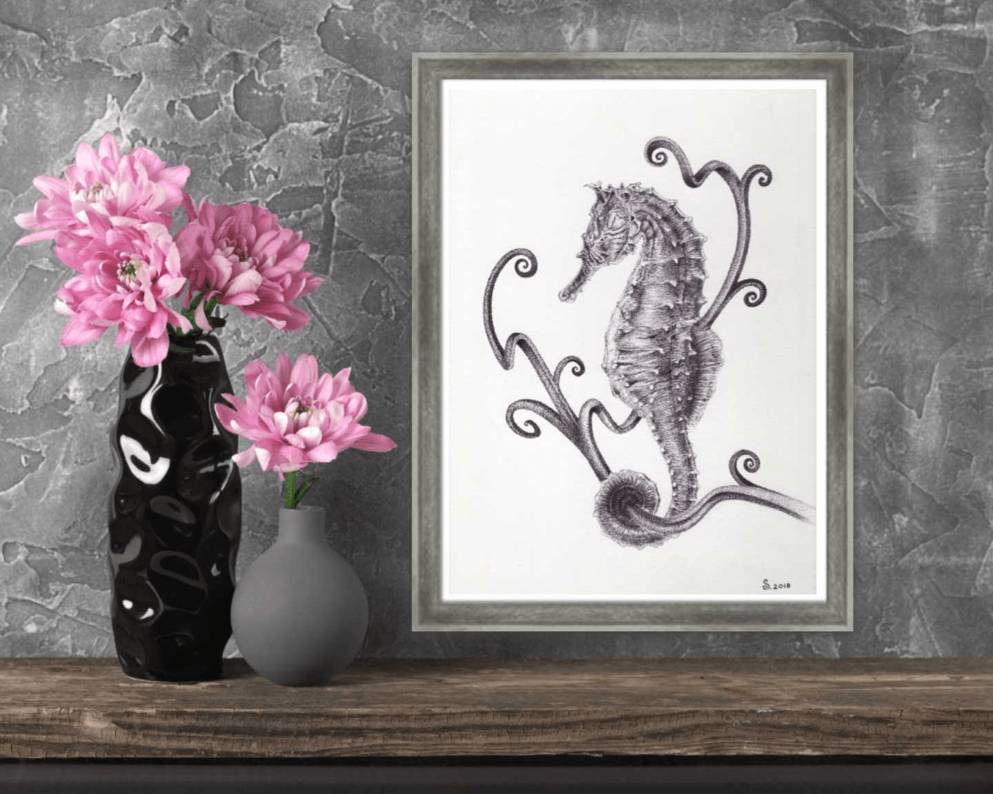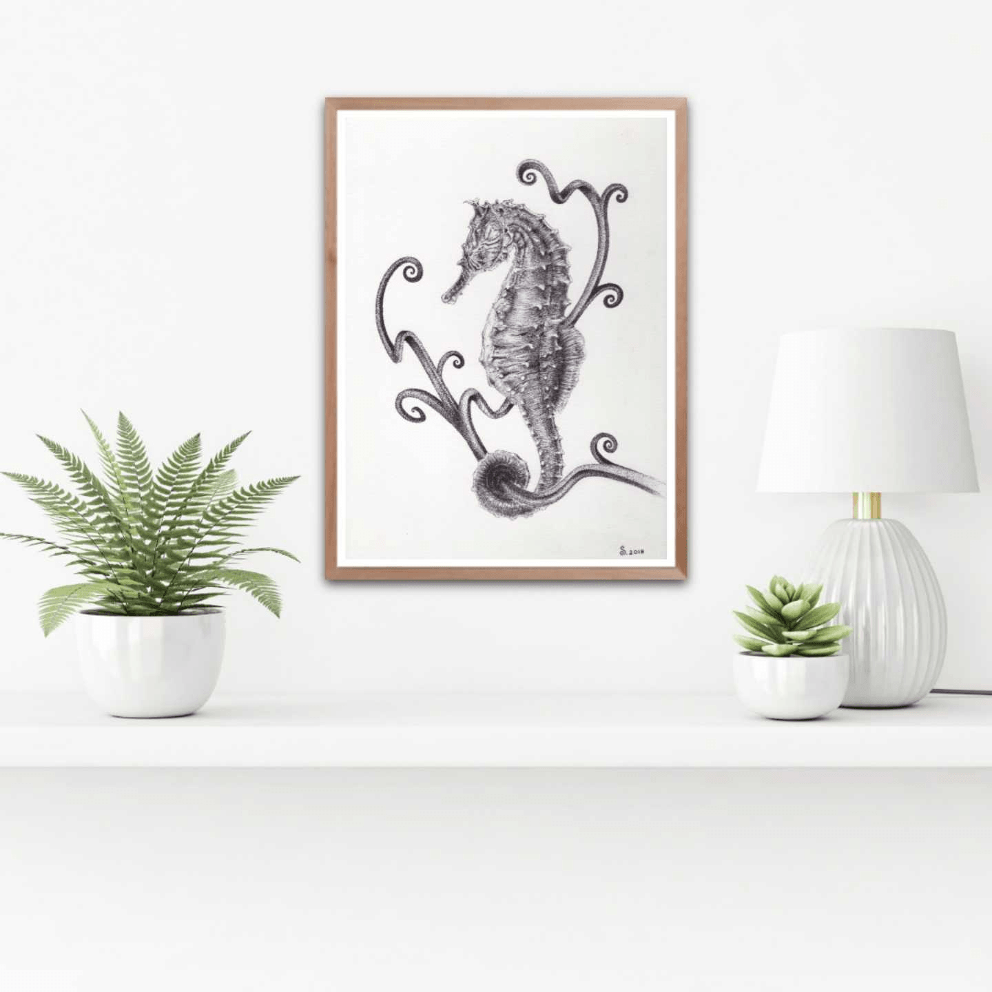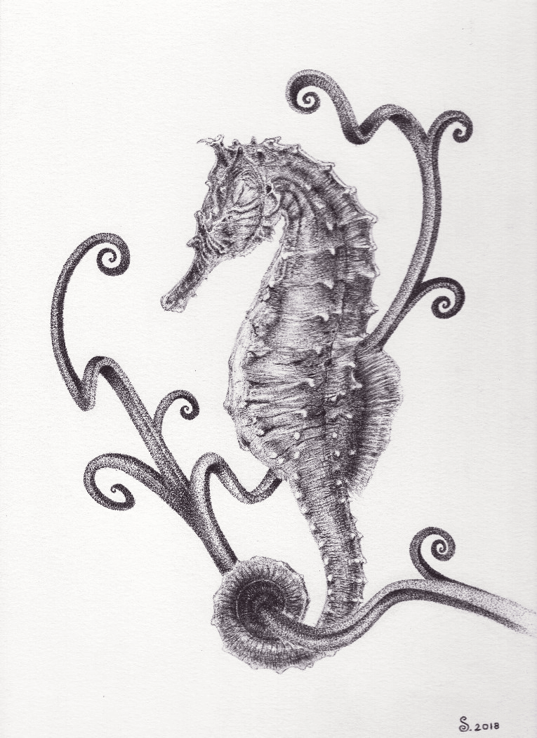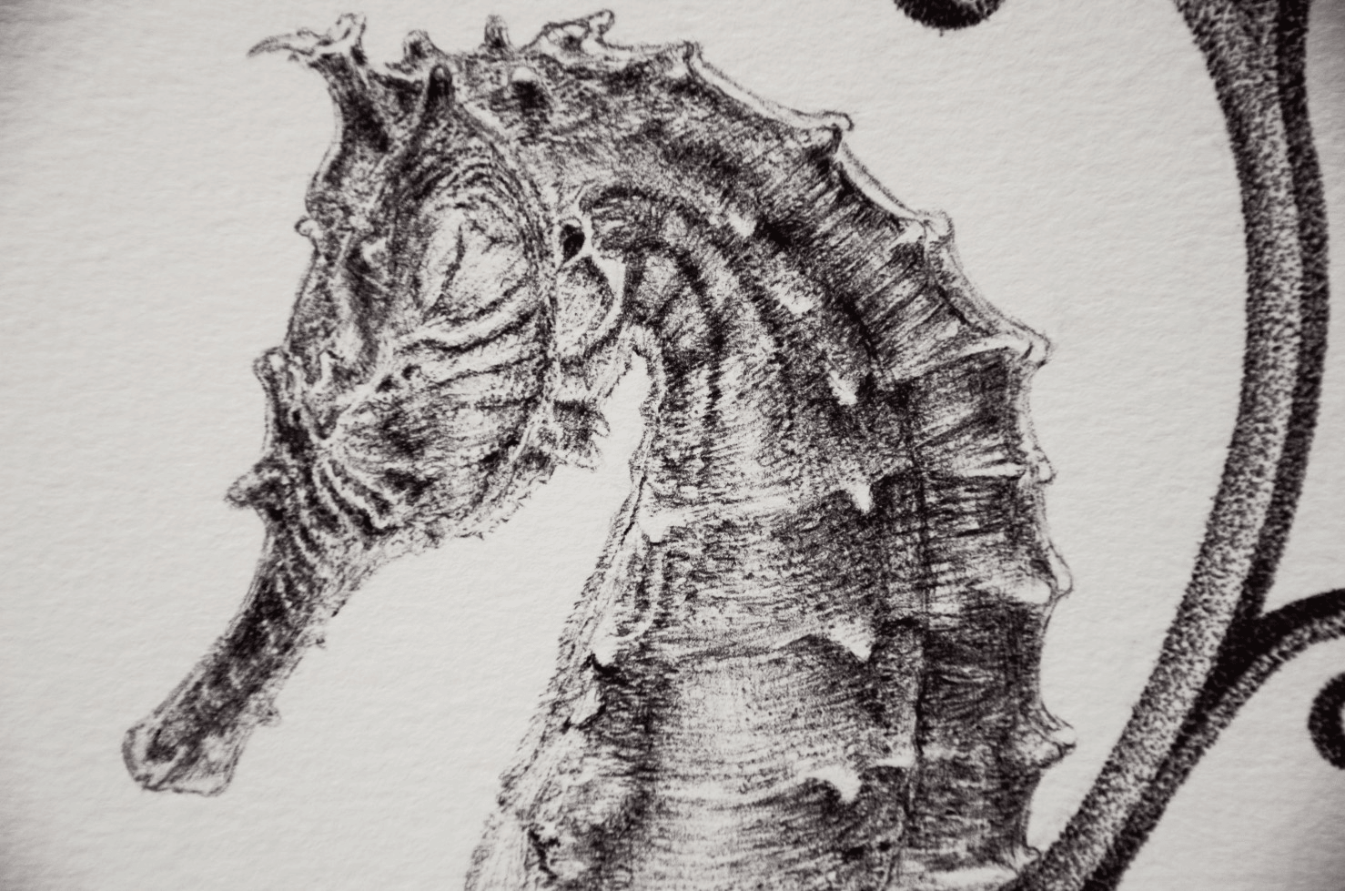 A detailed black and white drawing of a beautiful seahorse perched on an underwater branch. The soft, delicate strokes of the ballpoint pen are combined with the pointillism technique to display this wonderful creature in its full-on magnificence.