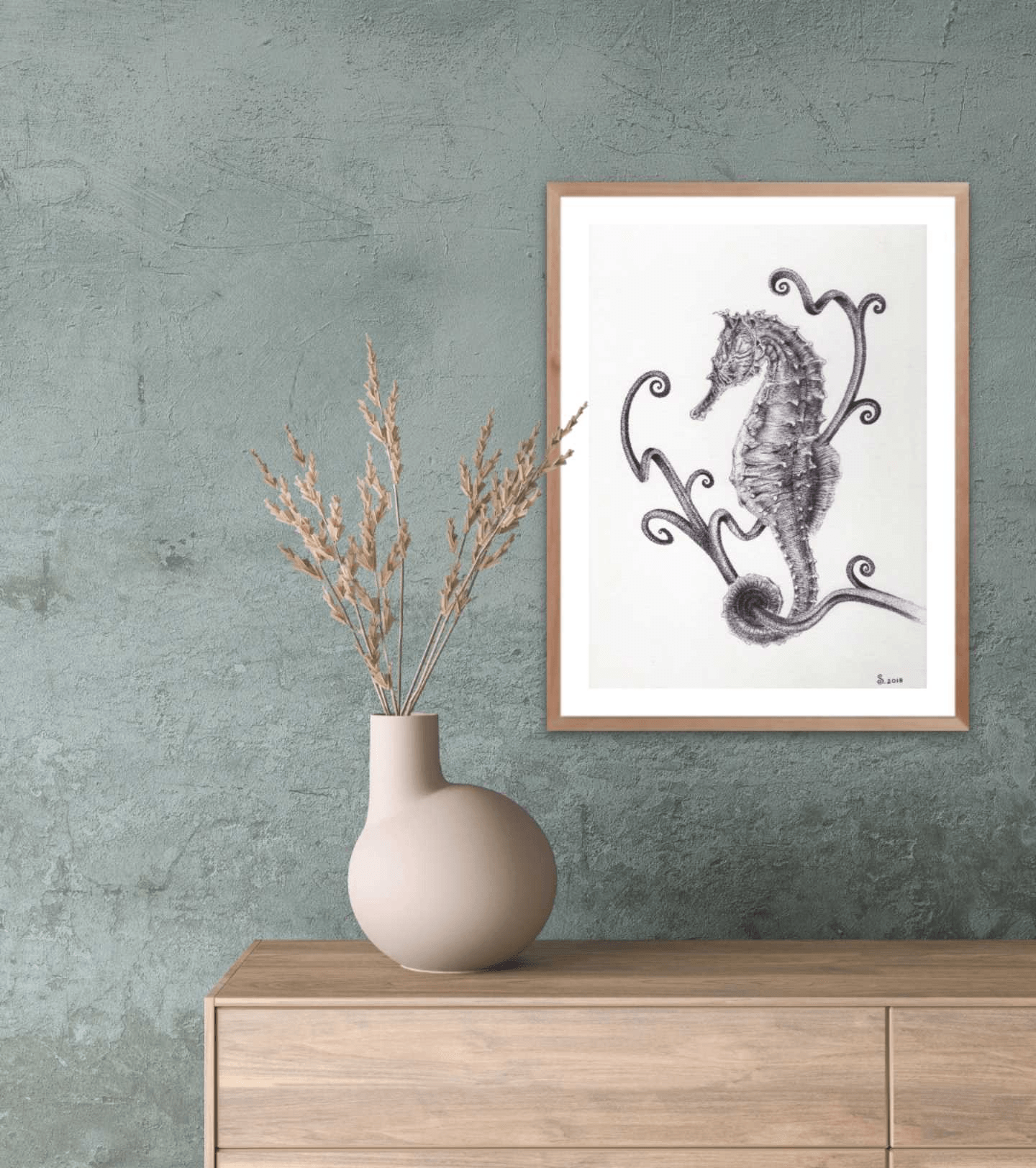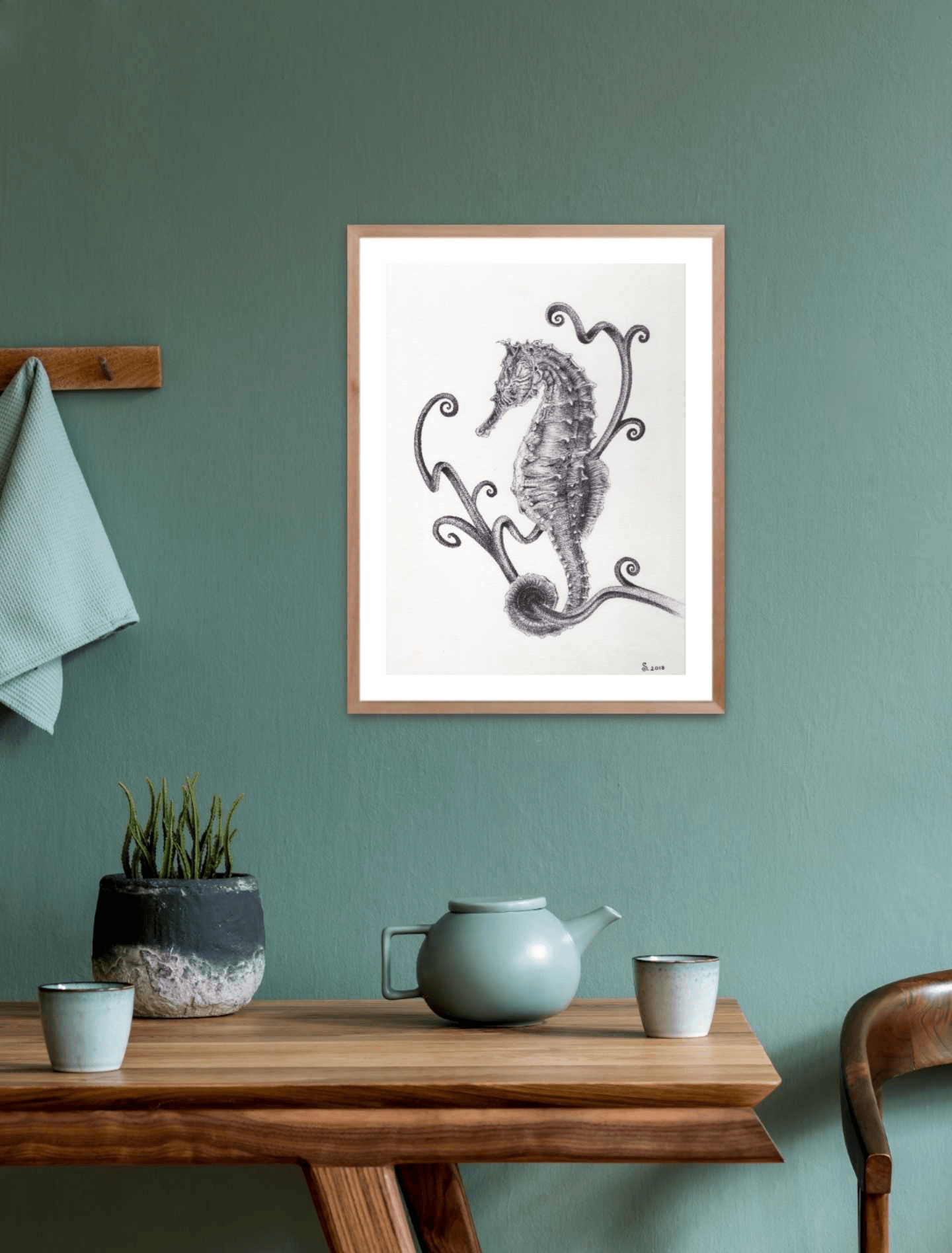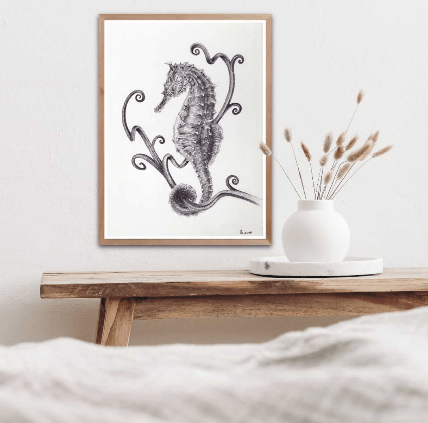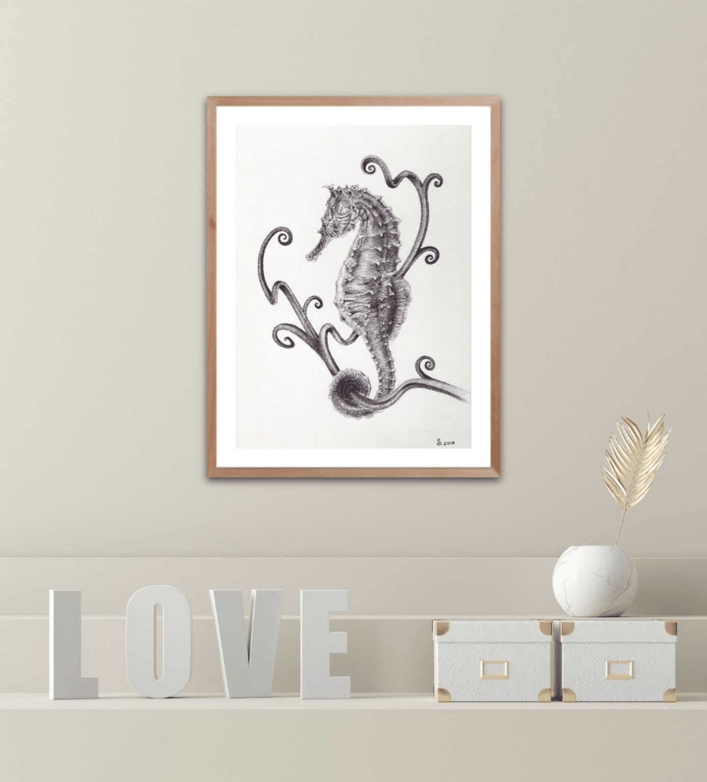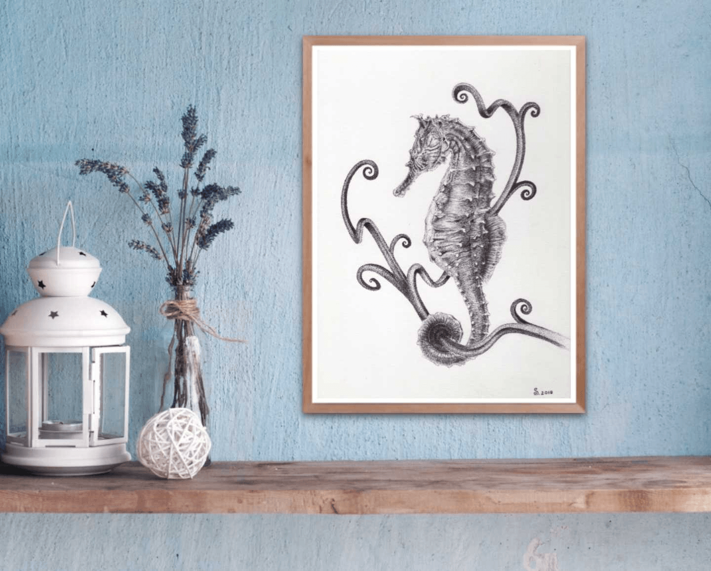 A detailed black and white drawing of a beautiful seahorse perched on an underwater branch. The soft, delicate strokes of the ballpoint pen are combined with the pointillism technique to display this wonderful creature in its full-on magnificence.