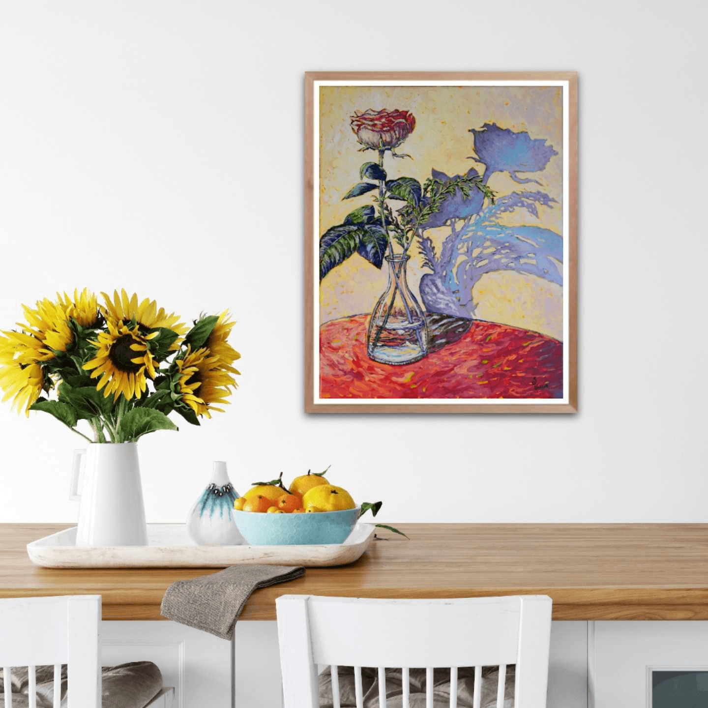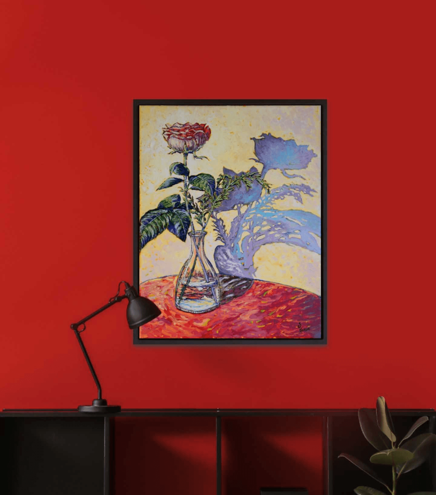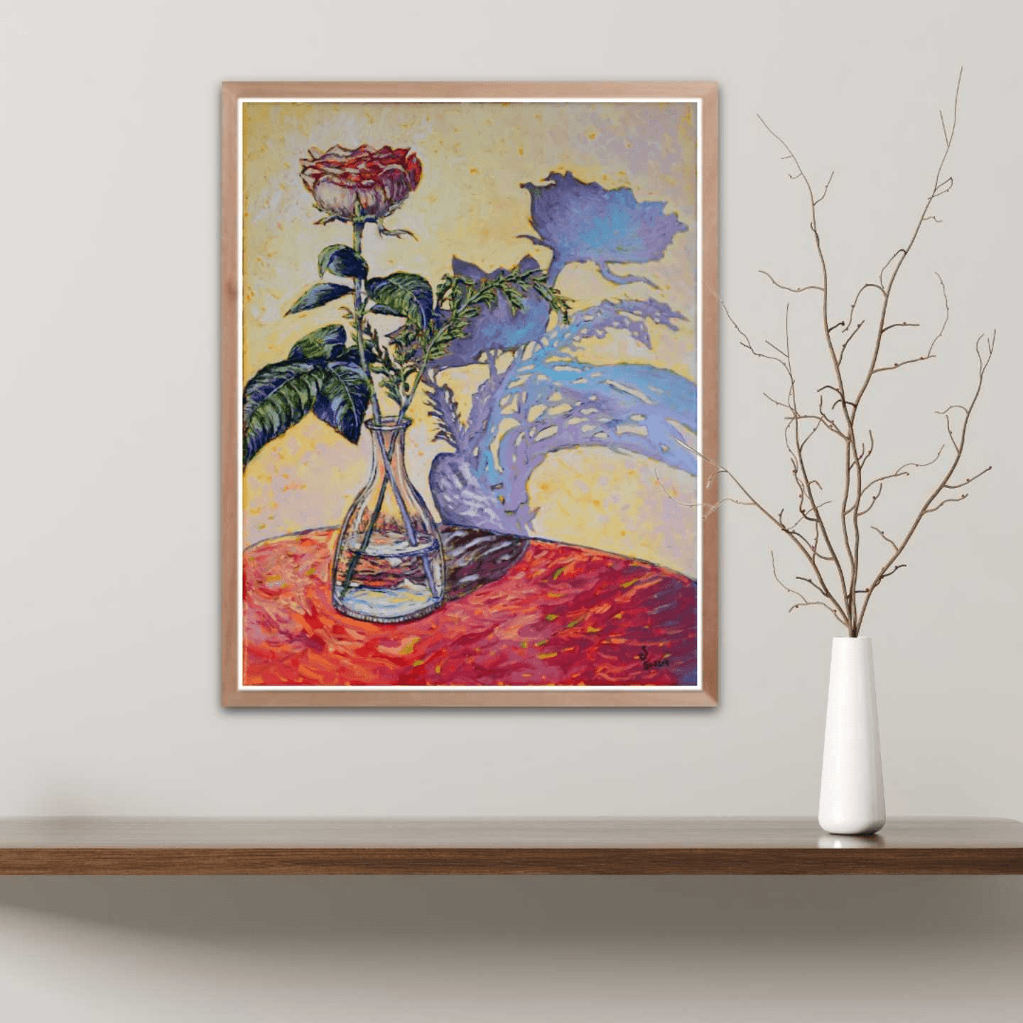 An elegant, single rose, standing in a clear glass vase, its soft and mellow shadow cast against the wall behind it. The composition of this lovely still-life gives the illusion that the flower and its shadow are intertwined, dancing and languishing in an ever-lasting embrace.